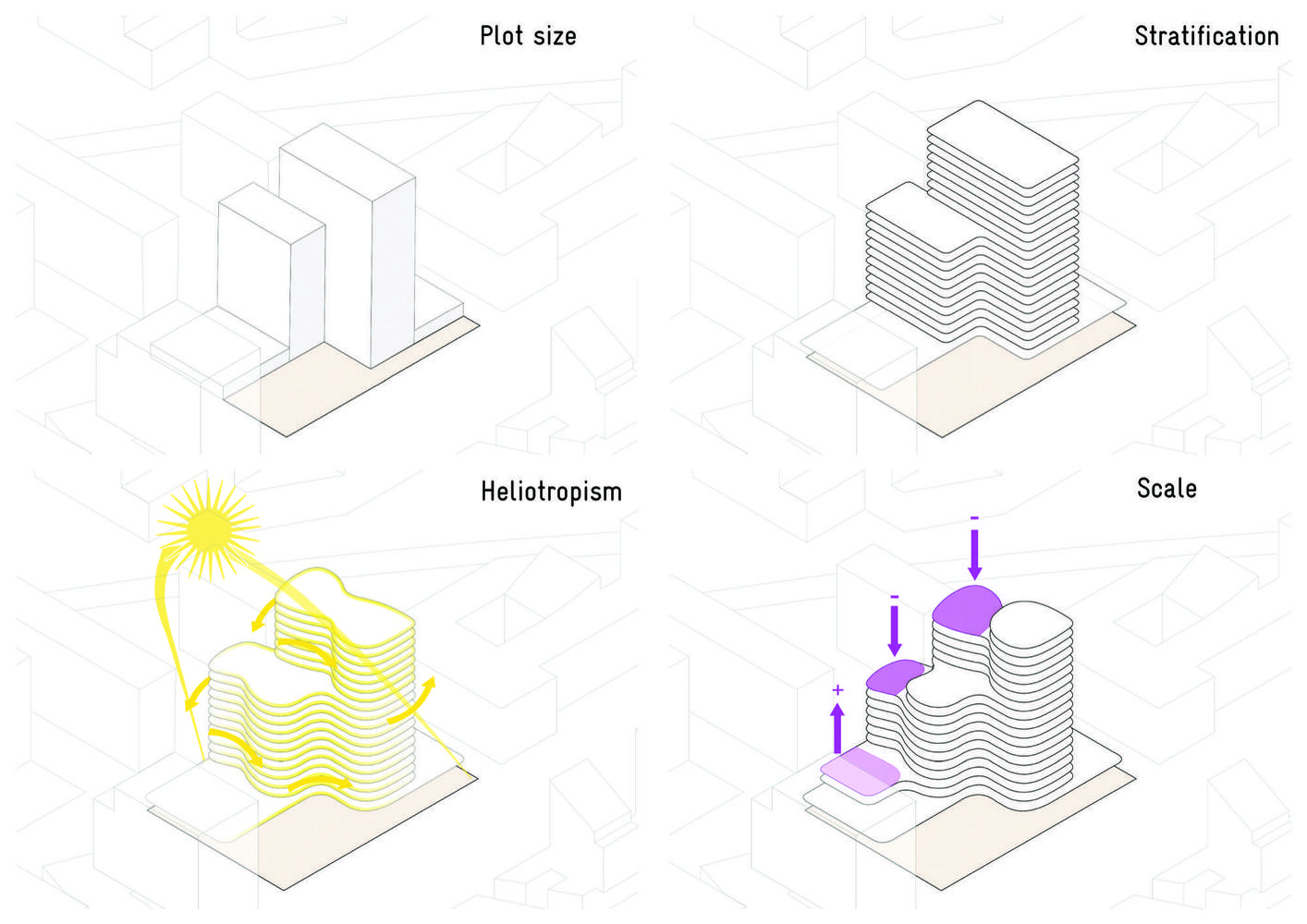Ever since Corbusier and his Unité d’Habitation, the rooftop has been regarded as having the possibility for holding such uses. Given the fact that the apartment building generally limits the area allotted to each individual, the most physical and outdoor-related needs, such as exercising, relaxing in the sun or planting have many times been placed in rooftops. In this case, the architects have placed such uses in several terraces, including a couple placed on the very top of the building. In this case, the architect’s state that the reason for their option to build in height were the creative possibilities that it entails. They wanted to provide the inhabitants with the great panoramic views that only a tall building can provide, while at the same time designing diversified spaces that are amplified by their placement “in the skies”. In their words, this is a landscaped building.
