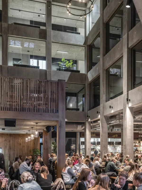 Nicolinehus exemplifies how to provide life to a new area, such as Aarhus Ø, by combining residential and commercial space on the ground floor with public uses. A bustling and captivating retail scene revolves around the ground floor market hall. Nicolinehus provides the foundation for a dynamic and appealing urban area that hums with life from morning to night, with room for more than 15 players, including a small ice cream vendor above the fishmonger, eateries, unique stores, a large convenience store, an exercise facility, and a sky bar on the roof.