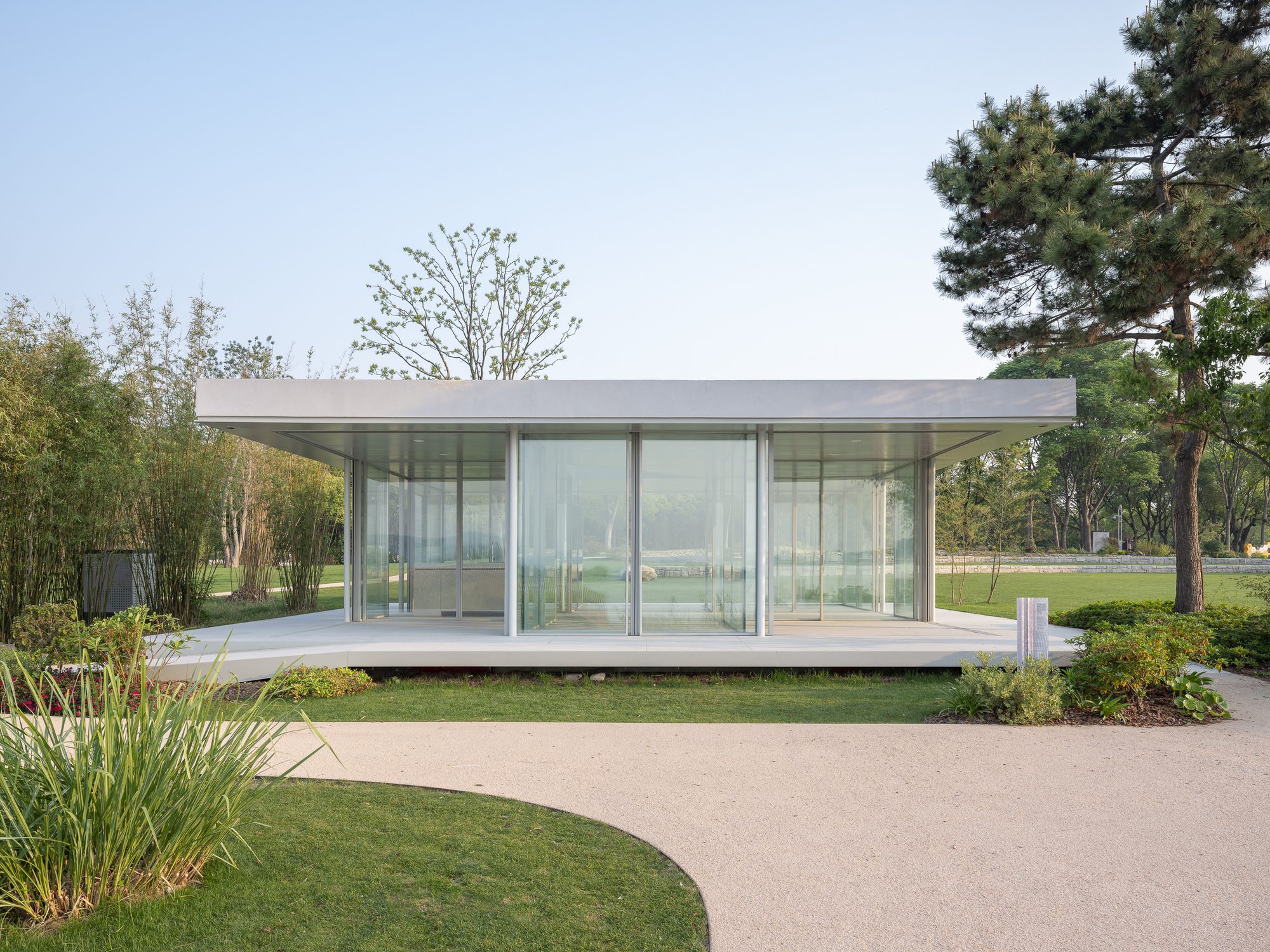 The Nine-Square Pavilion is situated within the Bogongdao Ecological Park of Wuxi City. The plot is adjacent to Qinyin Bridge, with an open view on the east side; a bamboo grove on the west; and only ten meters away from Li Lake, an inner lake of Tai Lake, on the south side, boasting exceptional sceneries. The function of the project is a tea house. Our initial concept involves a glass pavilion with some interior spaces that embraces the surrounding landscape conditions.