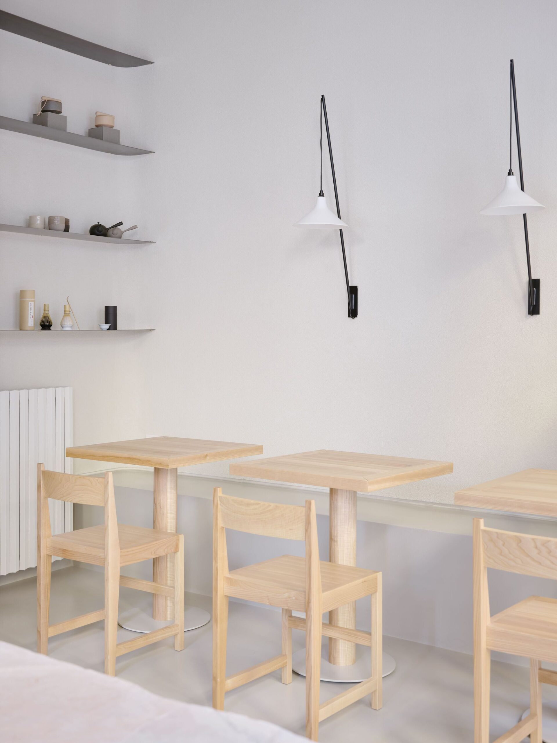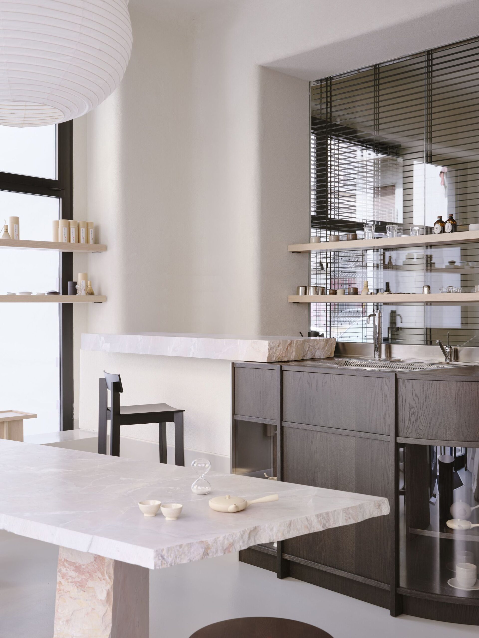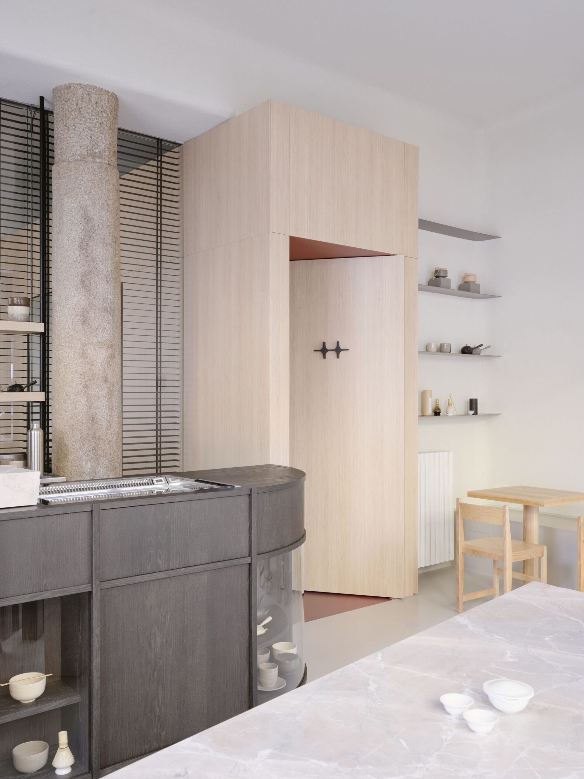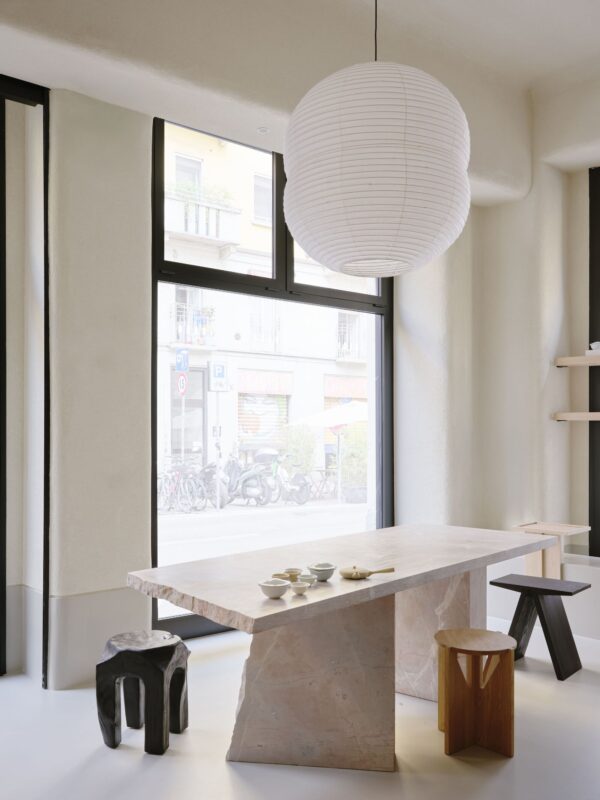 NOÏ Tea House and Pilates Studio, In the vibrant heart of Milan, within the lively Moscova district, a space with an iconic past is reborn as a new hybrid destination: a Japanese-inspired tea house that coexists harmoniously with a pilates reformer studio. The project emerges from the transformation of a historic comic book store, once entirely lined with towering bookshelves. Today, that architectural shell reveals material and volumetric traces of great character, which have guided both the language and structure of the new design.