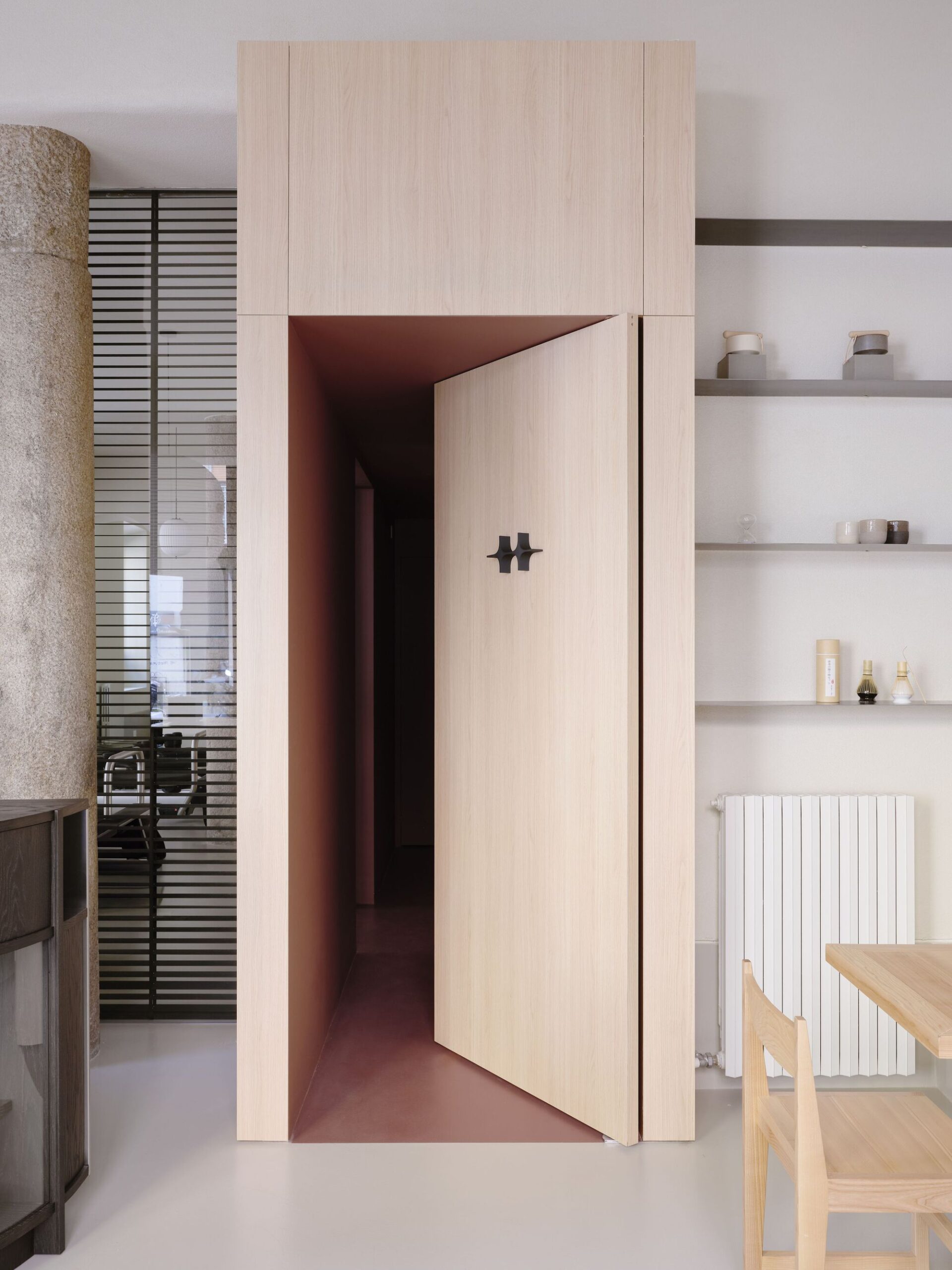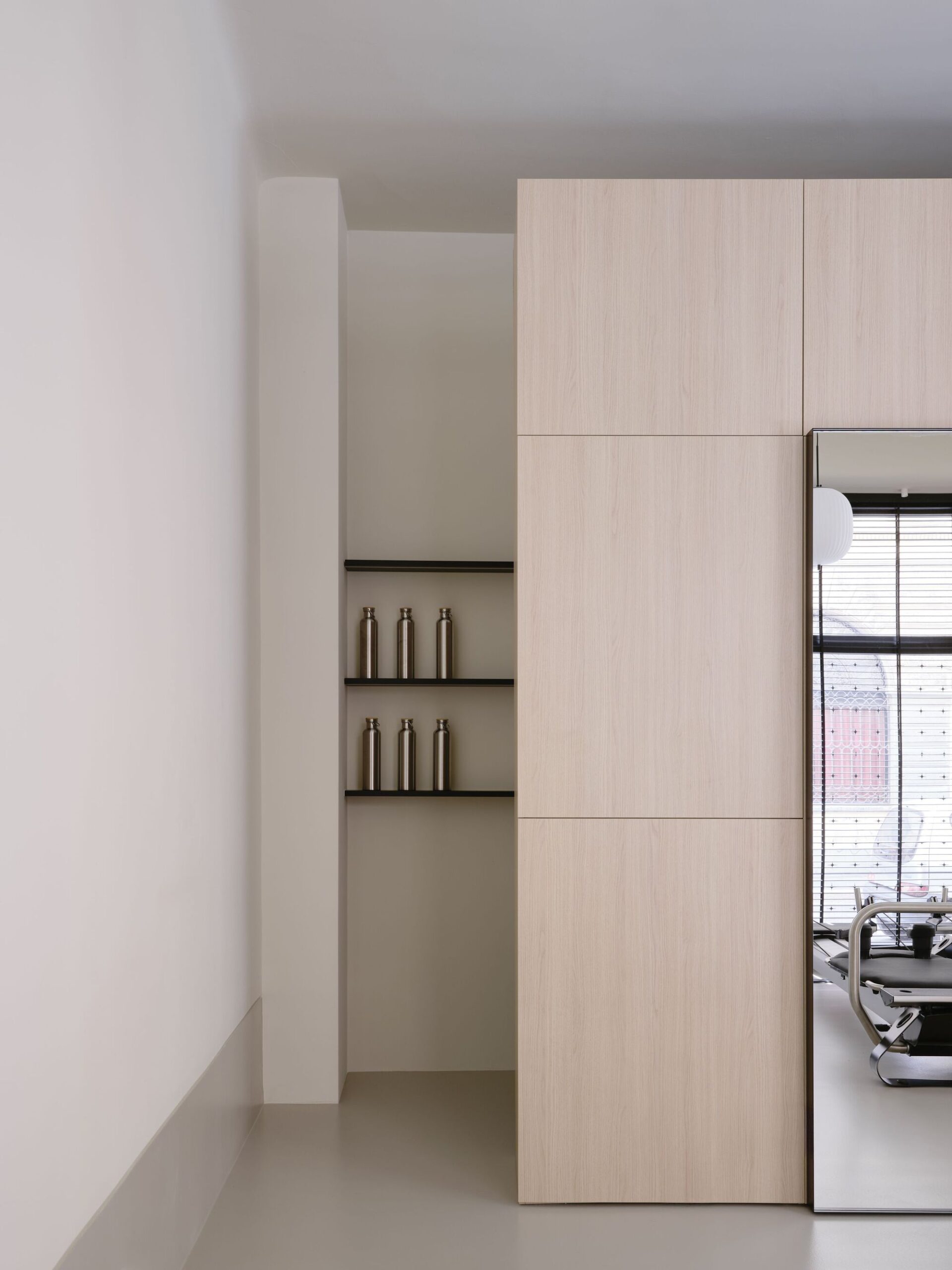 Behind the bar, a glass wall reveals the project’s second soul: the pilates studio. Entry is through a pivoting panel concealed within a wooden architectural partition that cuts across the space like a foreign body, creating sequences and new perspectives. Inside, a corridor entirely clad in deep red walls, ceiling, and floor guides the transition between the two functions, turning the act of passage into an immersive, almost theatrical experience.