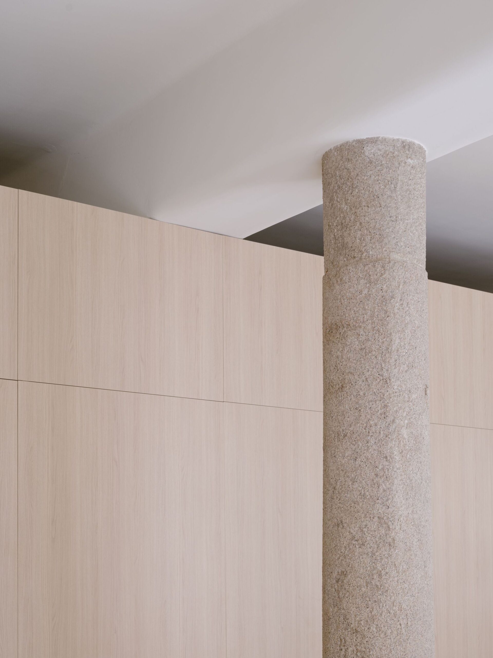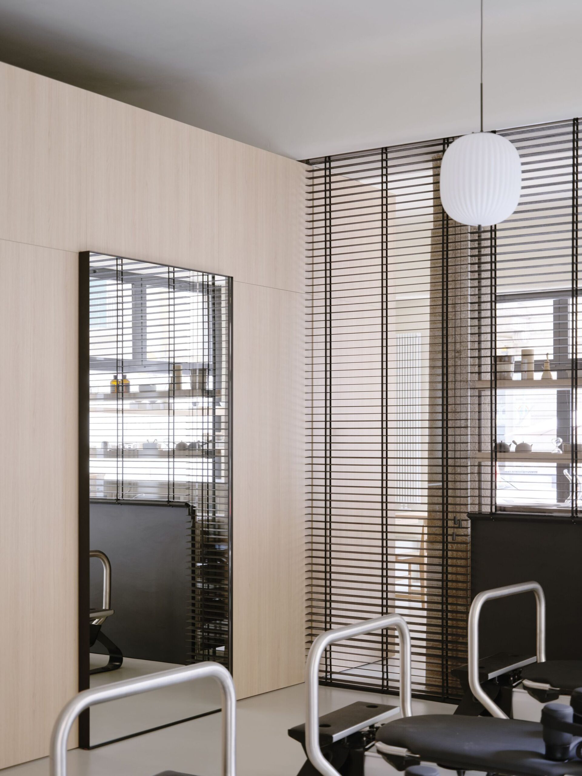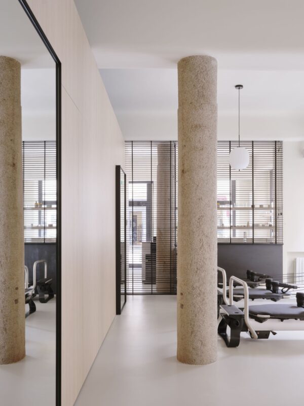 The pilates room shares the same material palette as the tea house, reinforcing the project’s cohesive identity. A large exposed granite column and an arched opening between the two activity zones recall the space’s original structure. Here, the wooden partition is revealed in full, defining without dividing, allowing light and sightlines to flow freely.