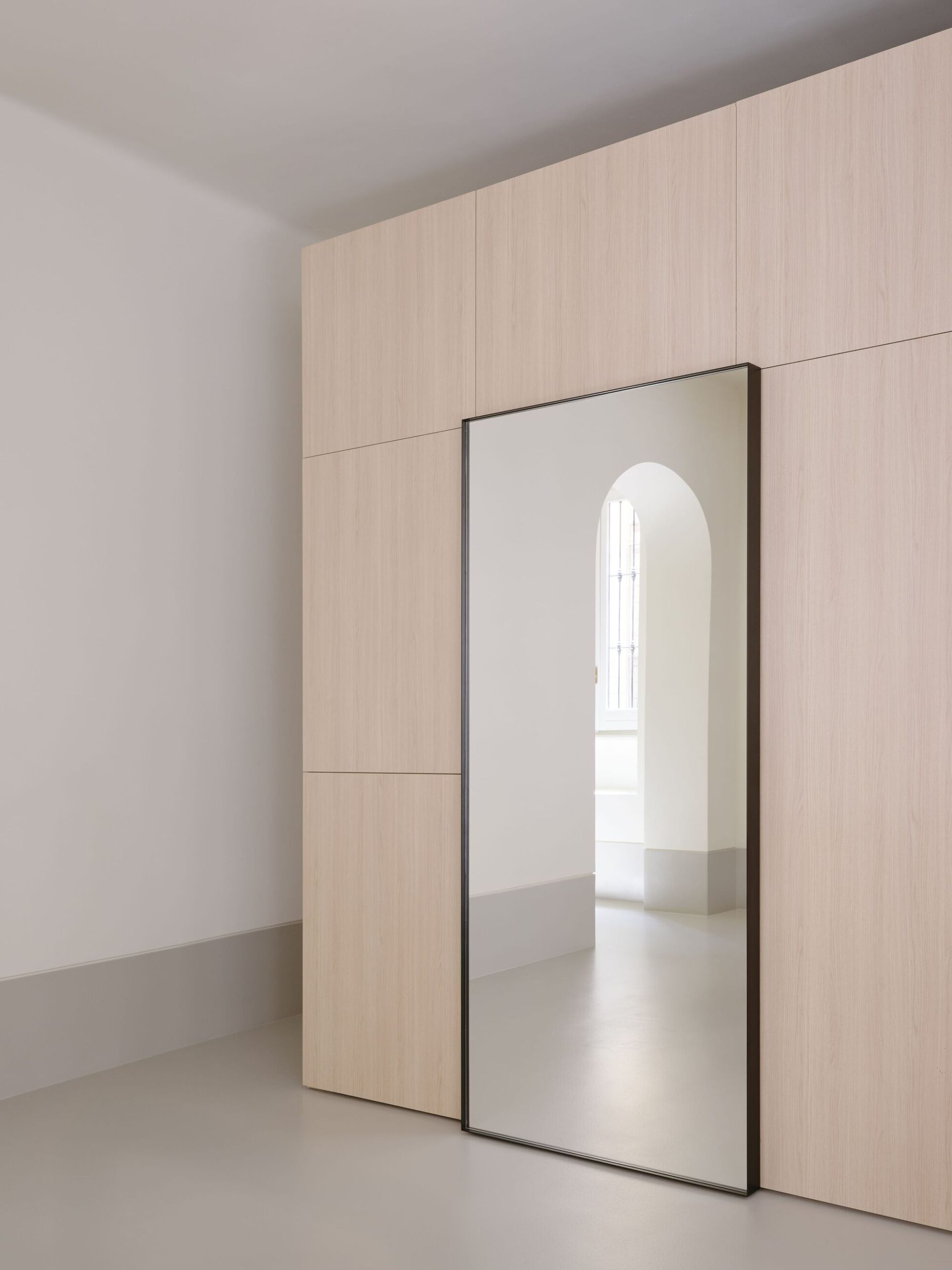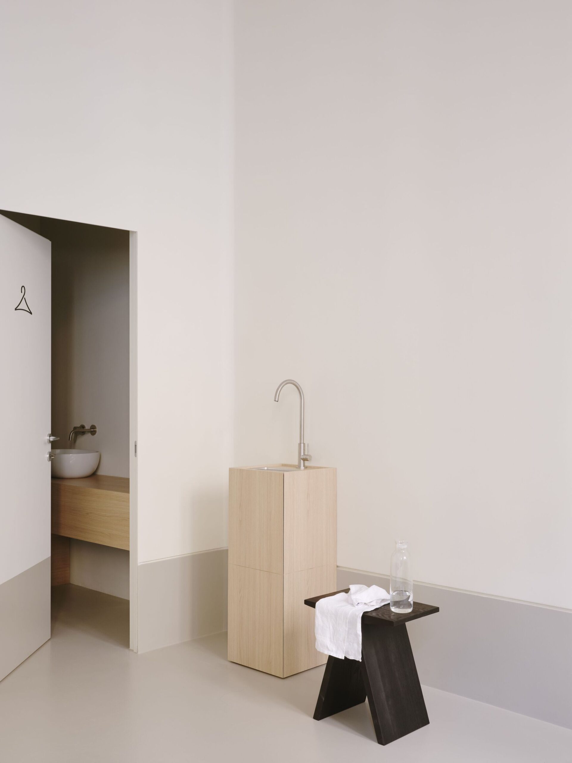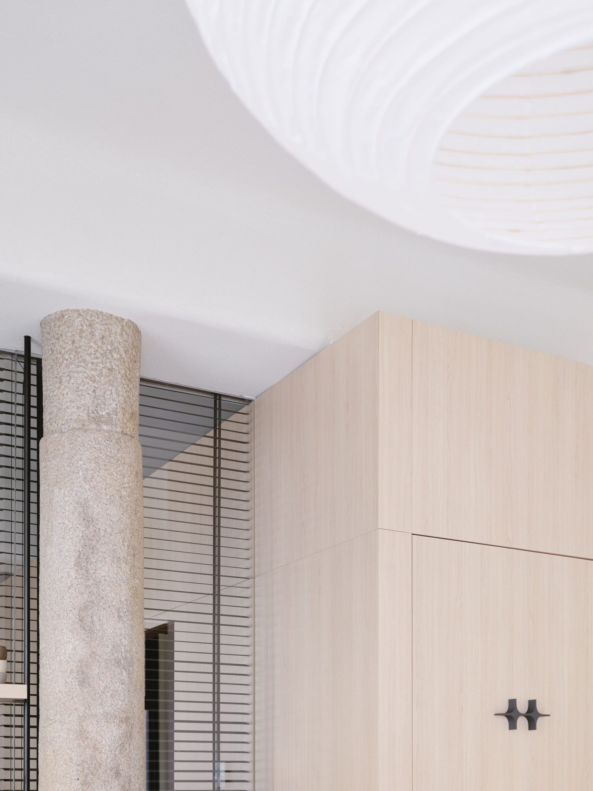 The pilates room shares the same material palette as the tea house, reinforcing the project’s cohesive identity. A large exposed granite column and an arched opening between the two activity zones recall the space’s original structure. Here, the wooden partition is revealed in full, defining without dividing, allowing light and sightlines to flow freely.