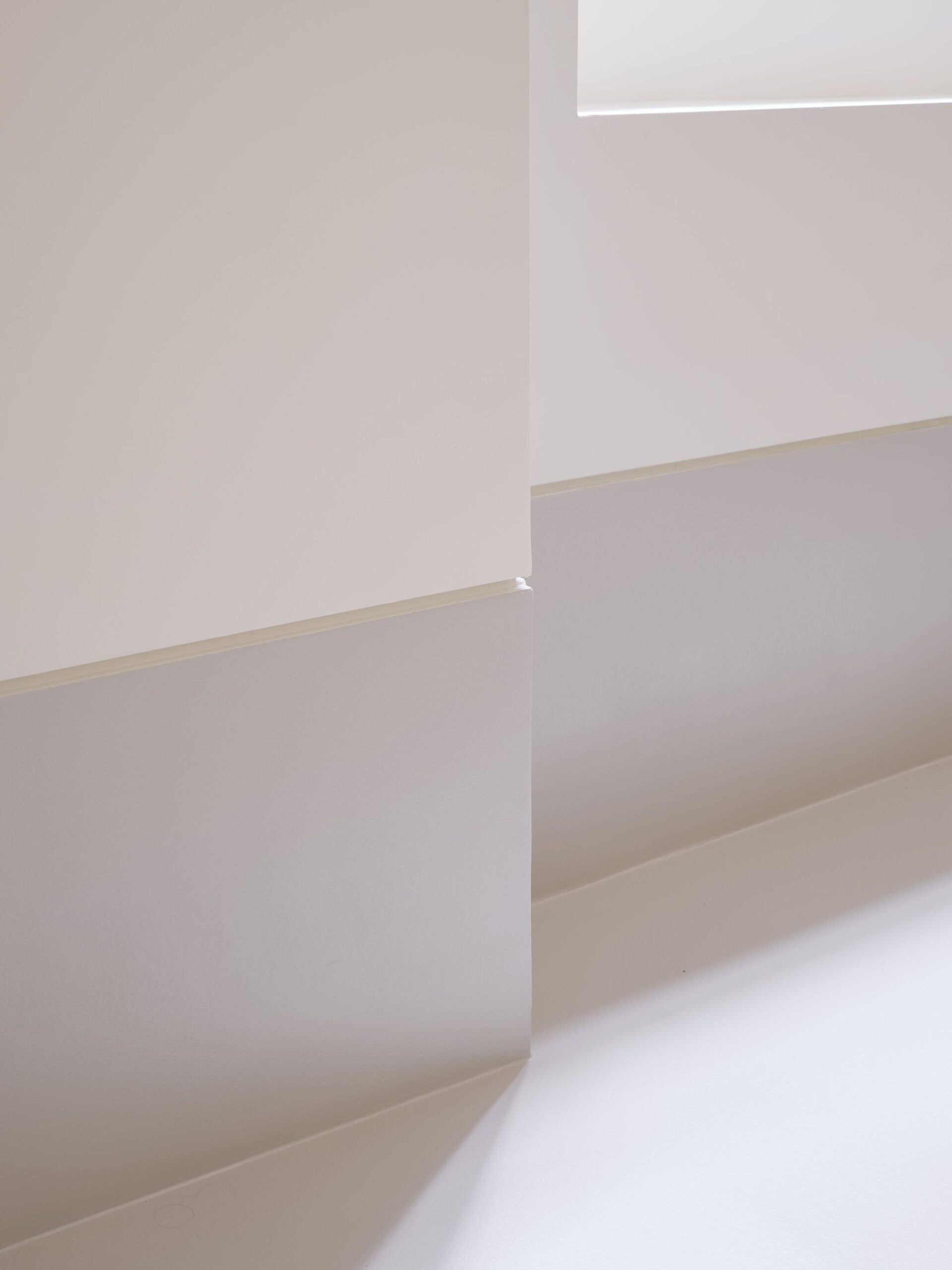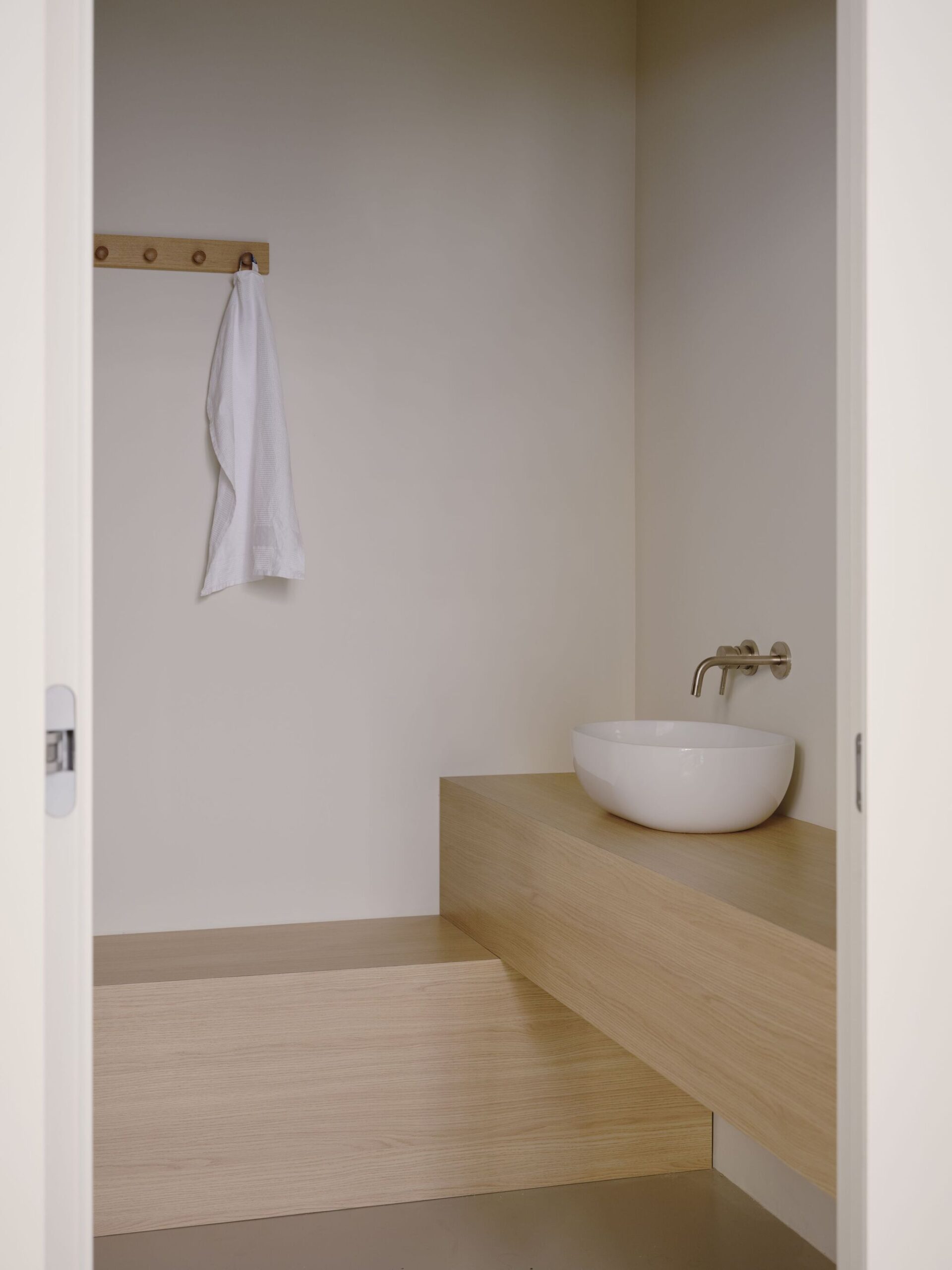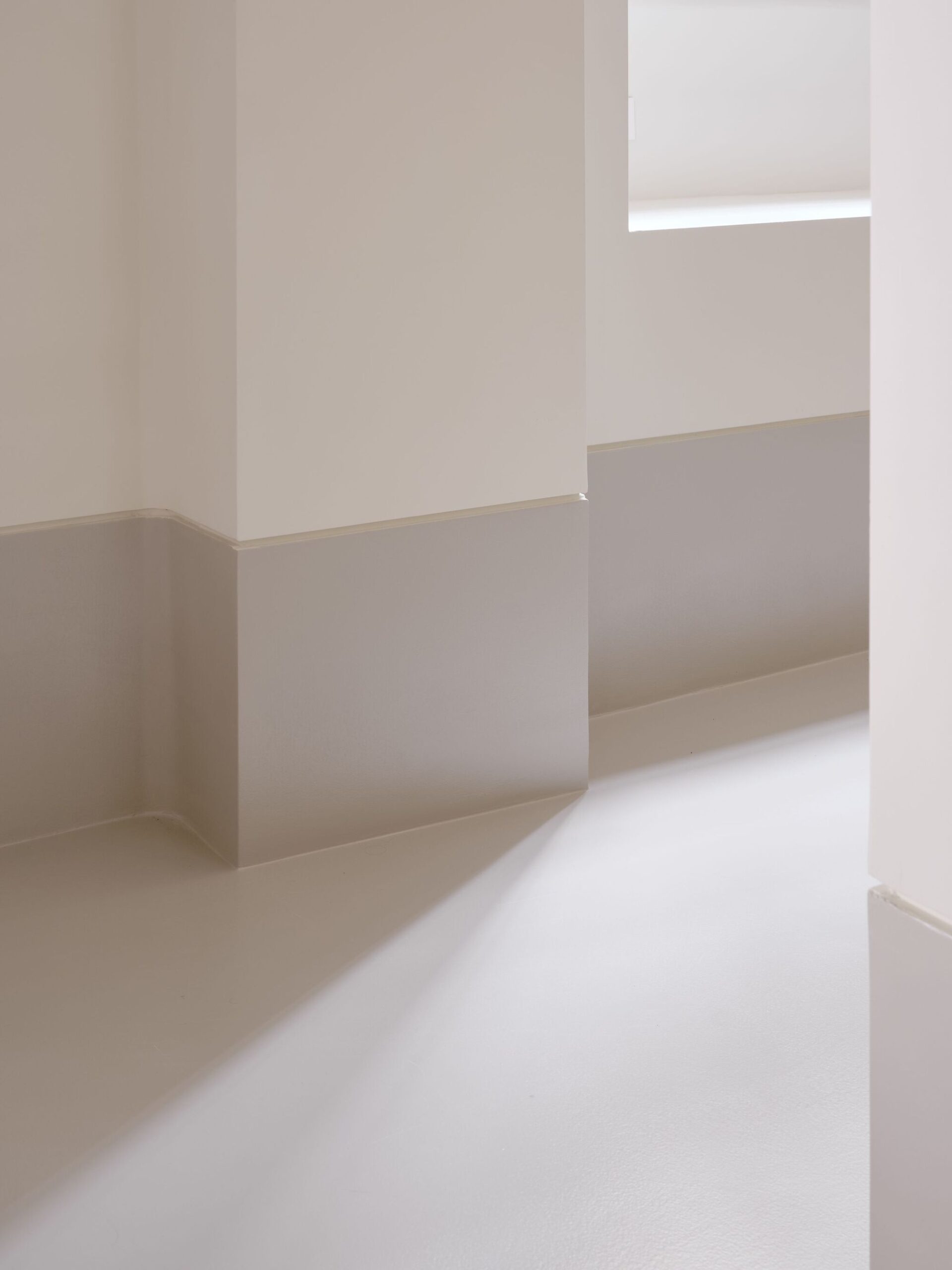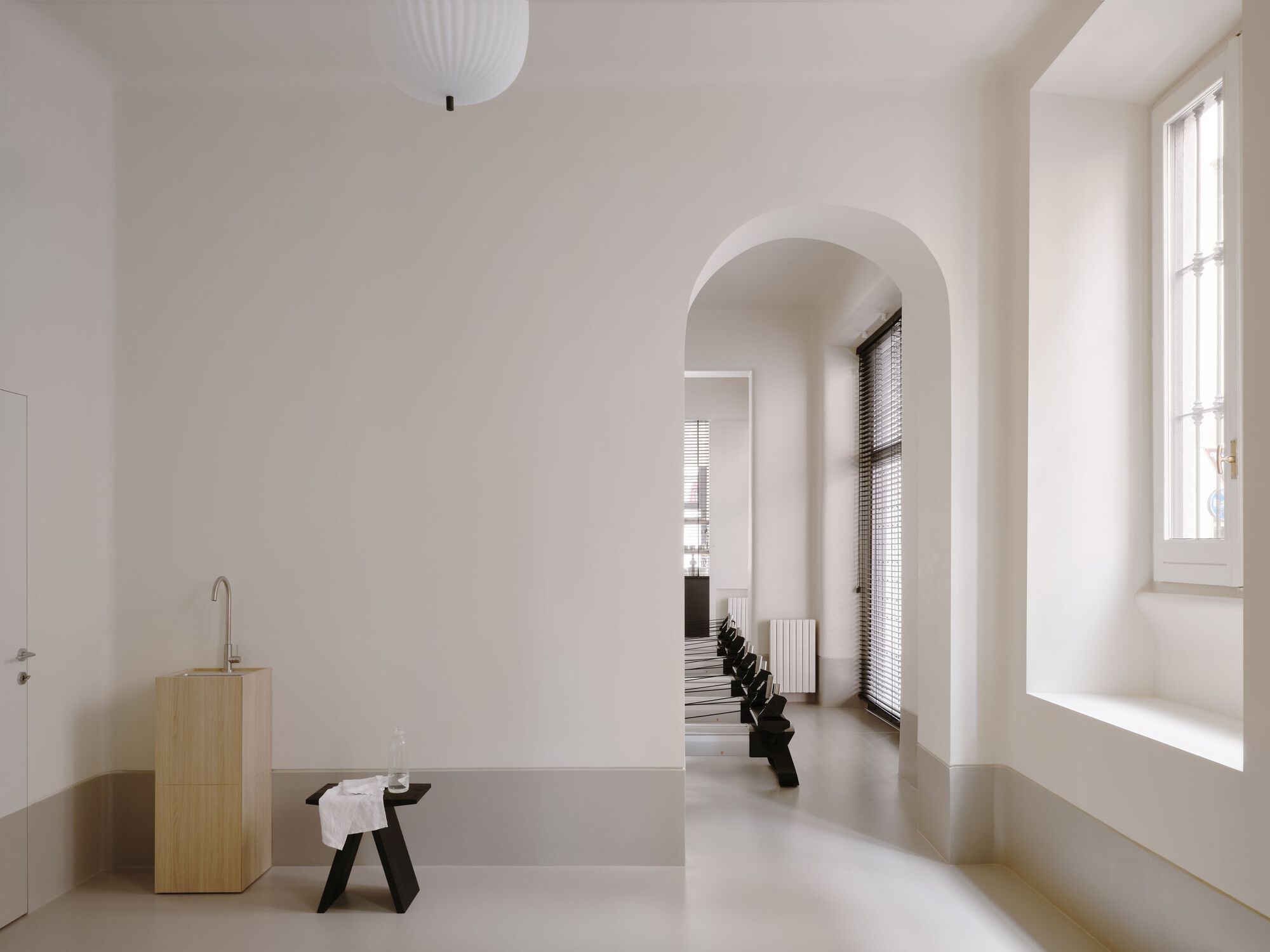 Fluid lines and softened corners define the internal partitions, contributing to a sense of continuity and welcome. The space opens into a unified and permeable environment, free from fragmentation, where perception flows freely and the spirit of the place clearly emerges. A sharp horizontal line runs through the entire space, separating the lower portion, compact and smooth, clad in resin, from the upper section, finished with coarse lime plaster and enlivened by plays of light, transparency, and screens. The contrast between material solidity and visual lightness creates a soft, suspended atmosphere.