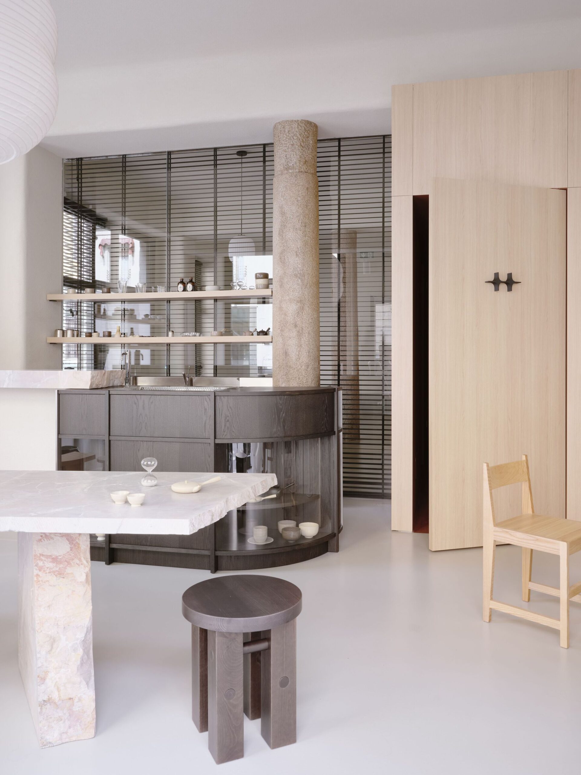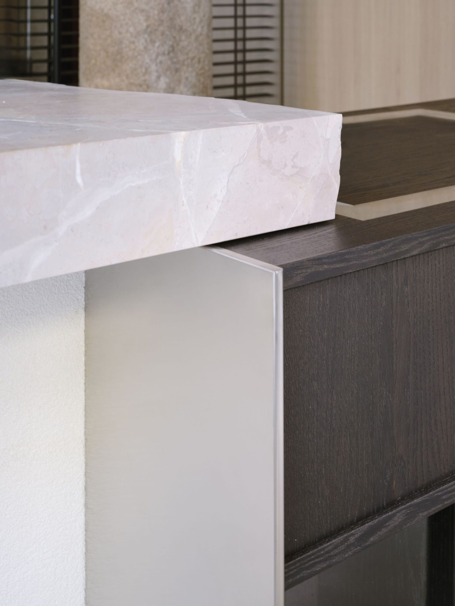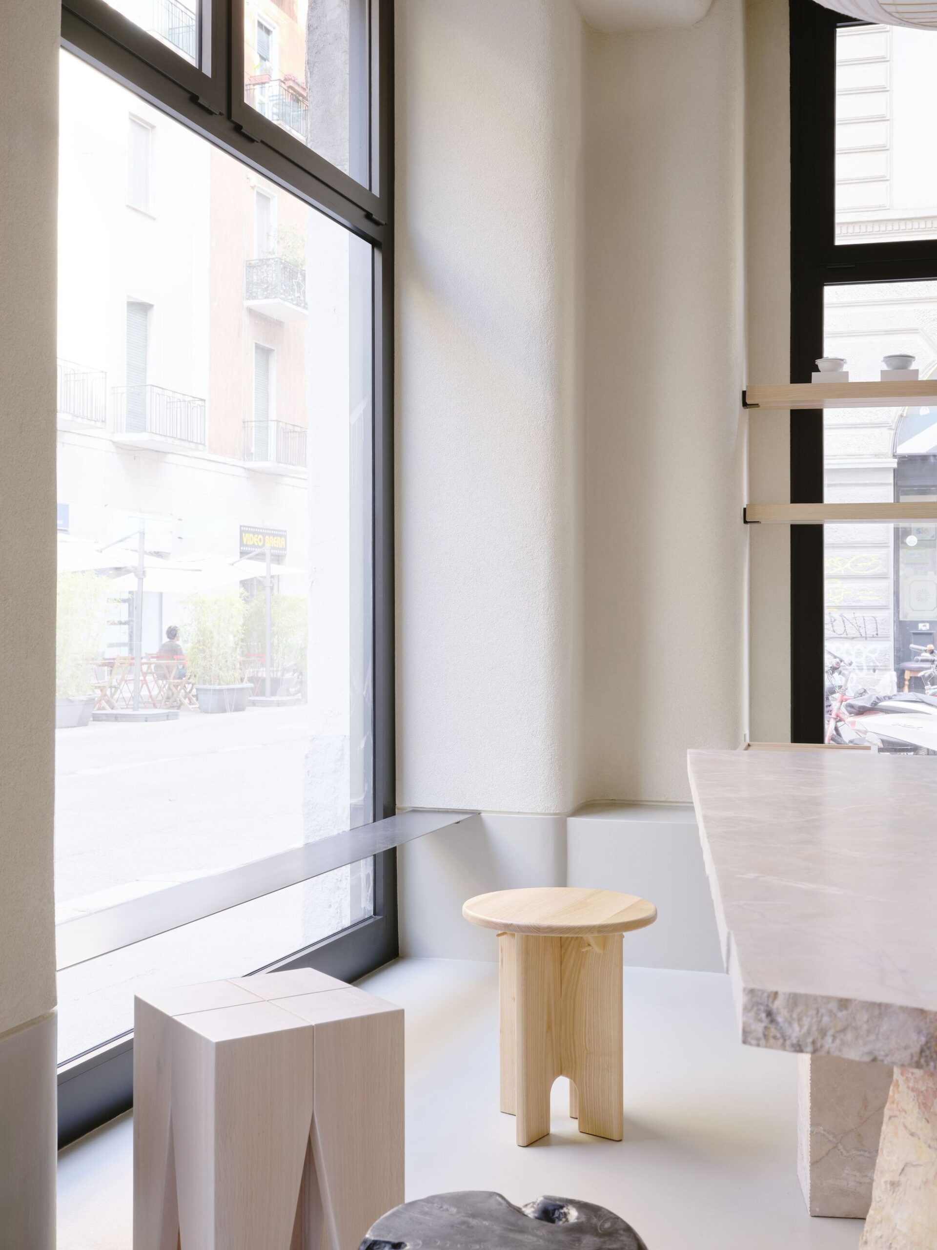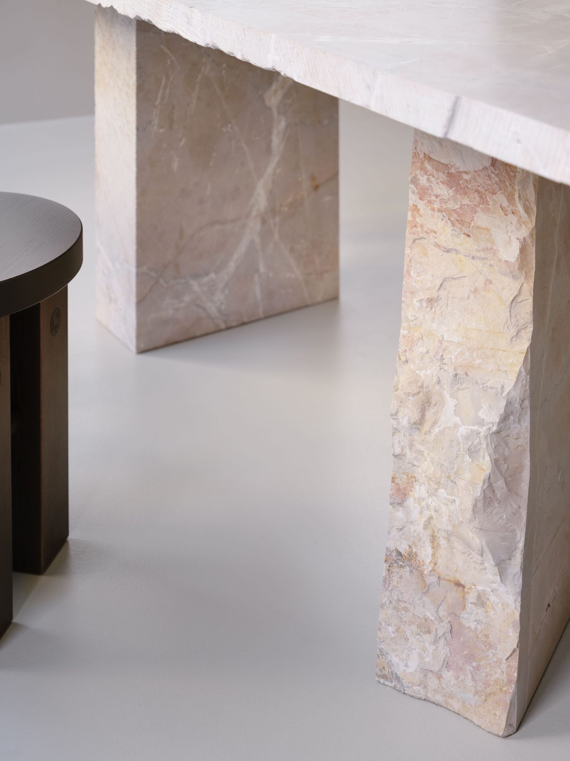 At the entrance, the visual and symbolic focal point is the bar counter, an embodiment of the project’s design language. It features a resin- and lime-finished plasterboard base, a central solid marble block with raw edges, and a crafted wooden section housing integrated display cases. A single element that encapsulates the entire design approach in one gesture. Just beyond, a large custom-made communal table in raw marble anchors the center of the room. Sculptural and monolithic, it is composed of three stacked blocks, two legs, and a top, and accompanied by deliberately mismatched stools. This spontaneous, informal gesture breaks the symmetry and encourages conviviality.
