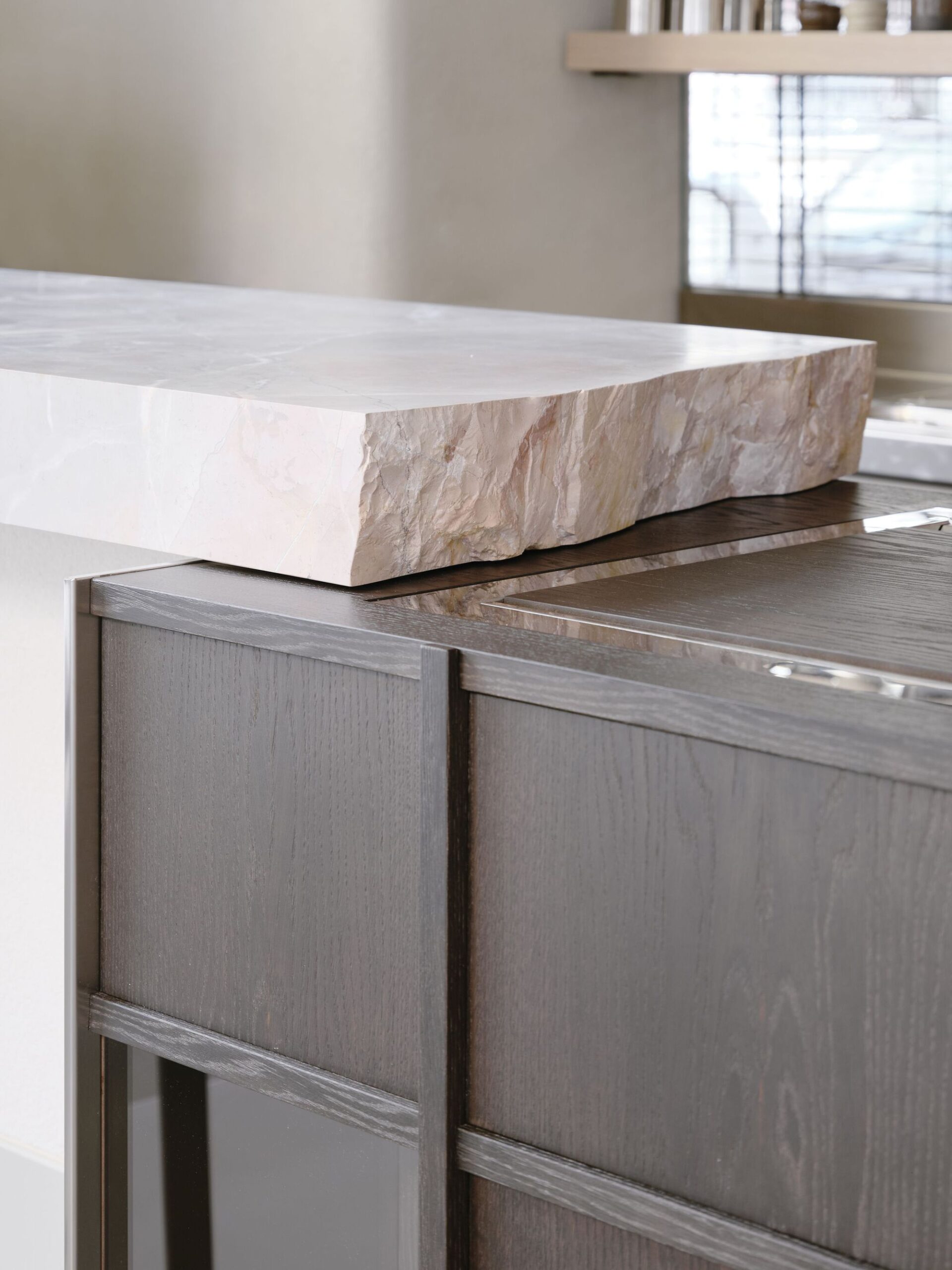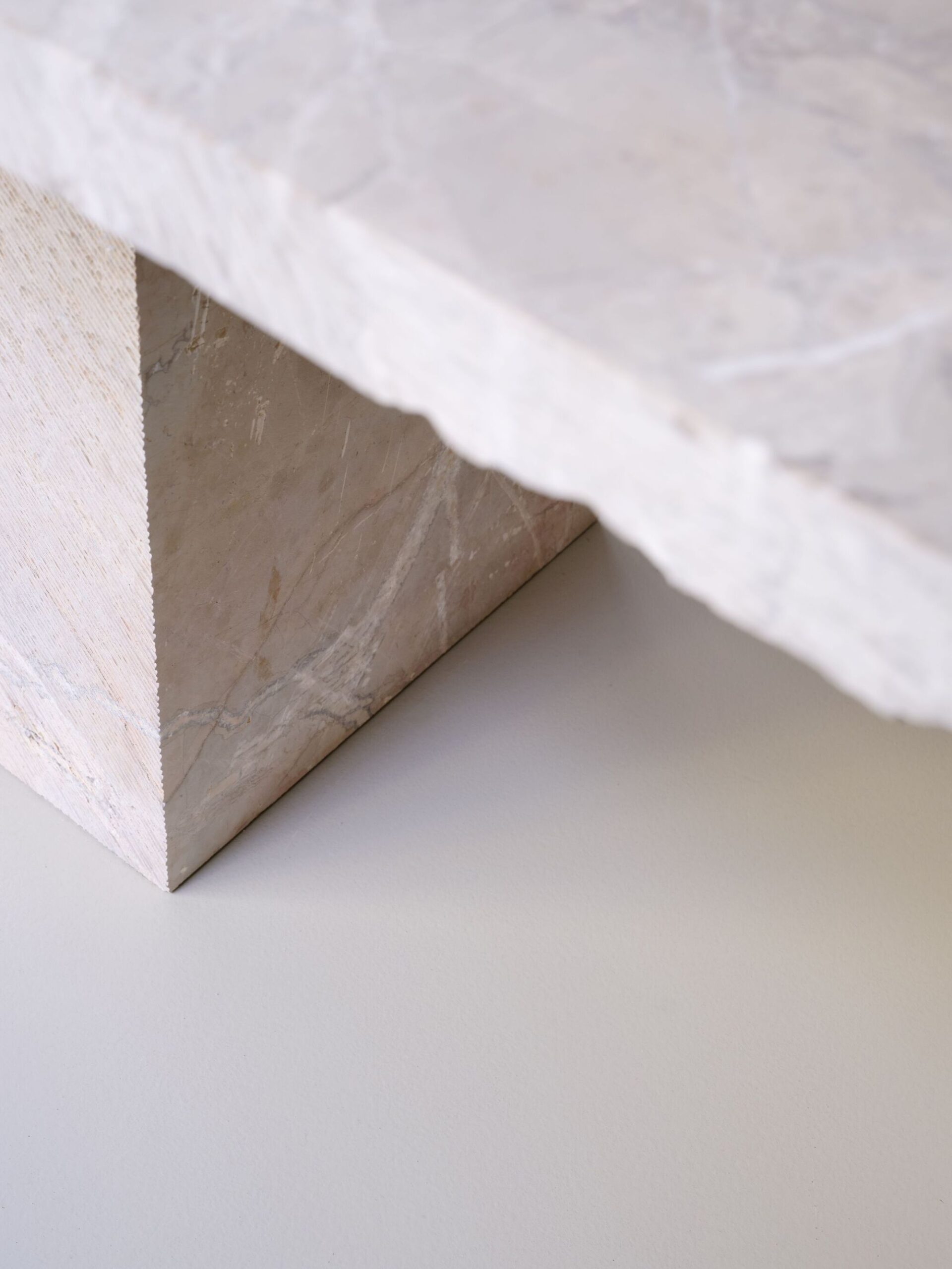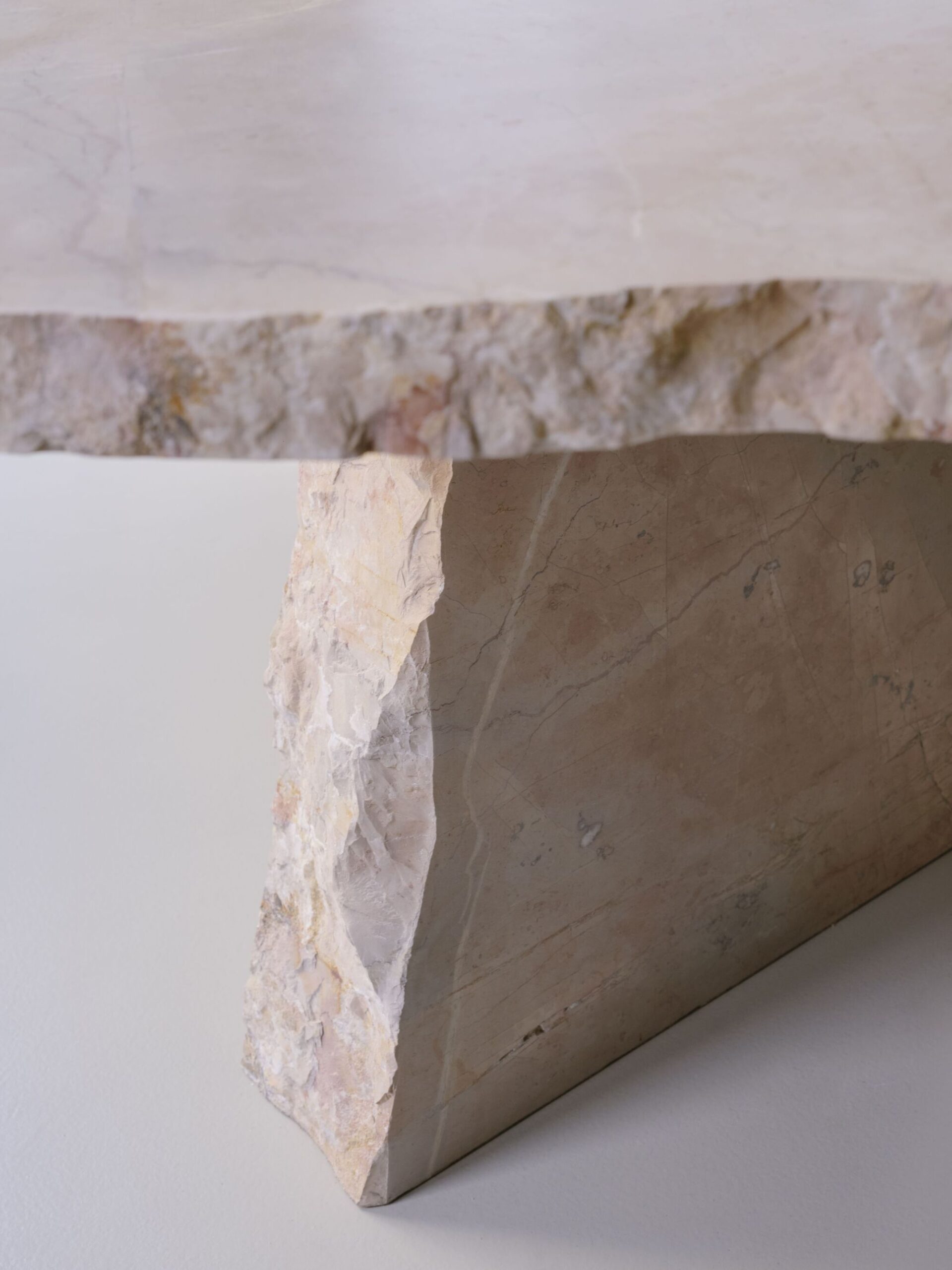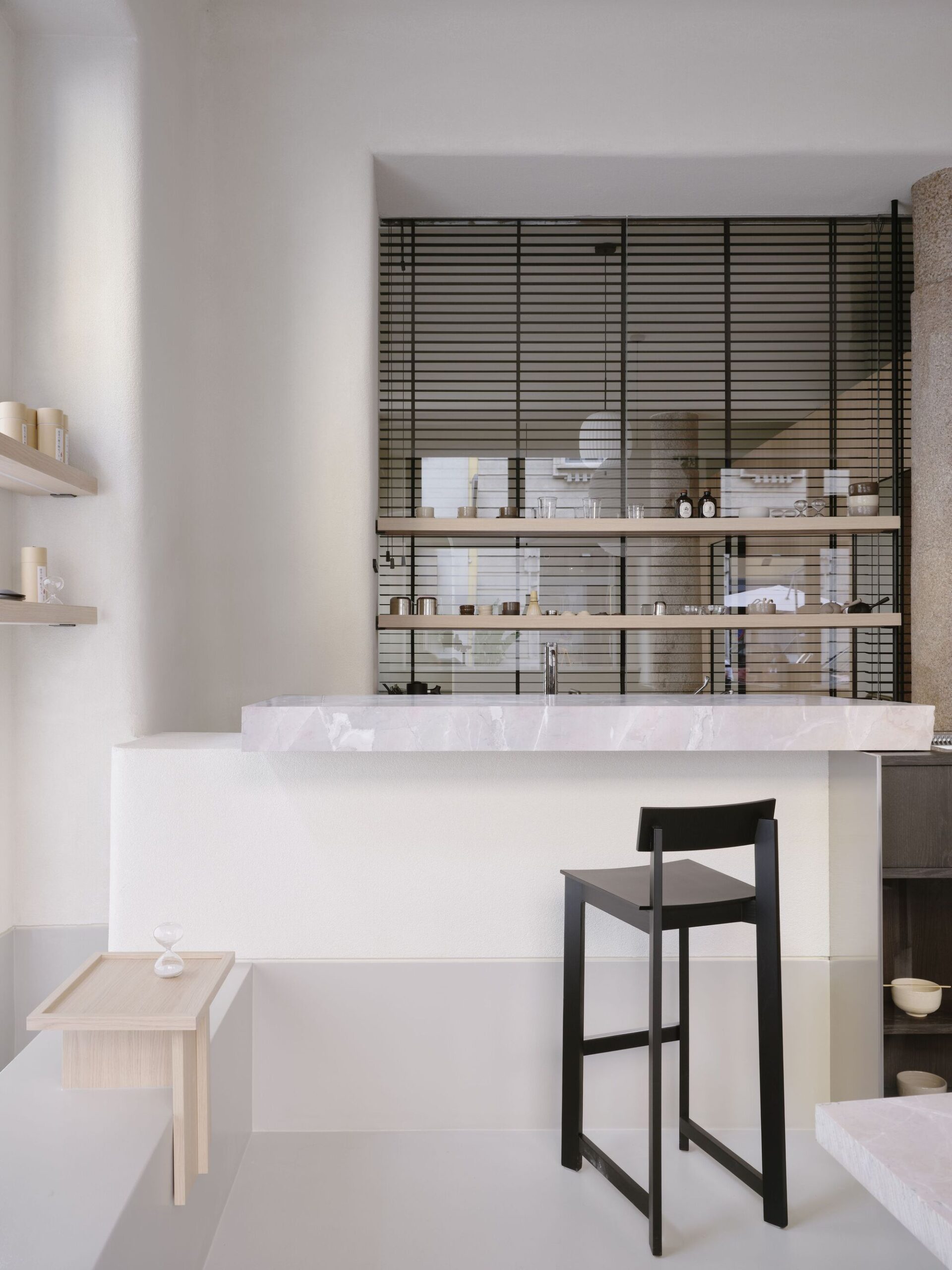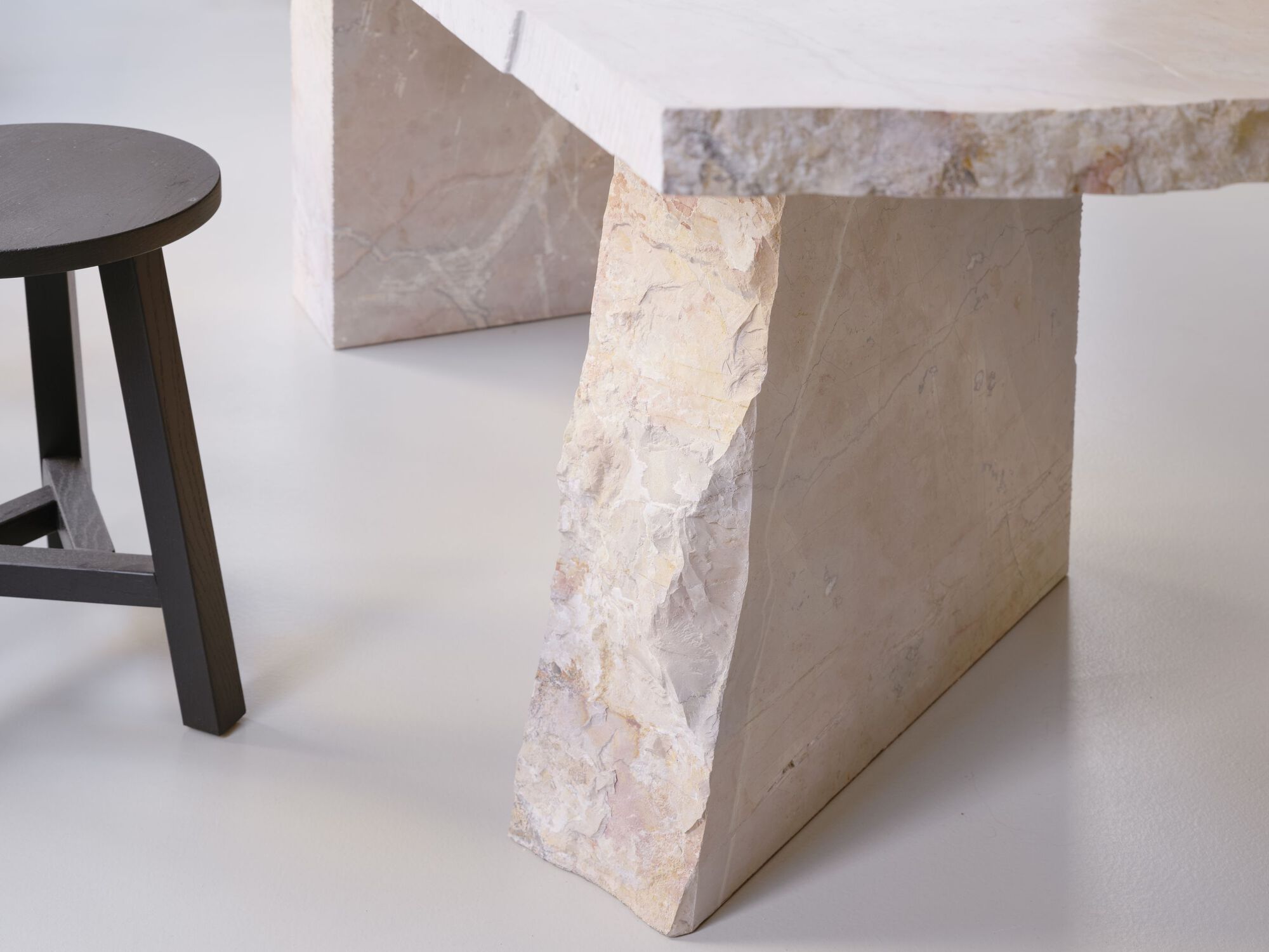 At the entrance, the visual and symbolic focal point is the bar counter, an embodiment of the project’s design language. It features a resin- and lime-finished plasterboard base, a central solid marble block with raw edges, and a crafted wooden section housing integrated display cases. A single element that encapsulates the entire design approach in one gesture. Just beyond, a large custom-made communal table in raw marble anchors the center of the room. Sculptural and monolithic, it is composed of three stacked blocks, two legs, and a top, and accompanied by deliberately mismatched stools. This spontaneous, informal gesture breaks the symmetry and encourages conviviality.
