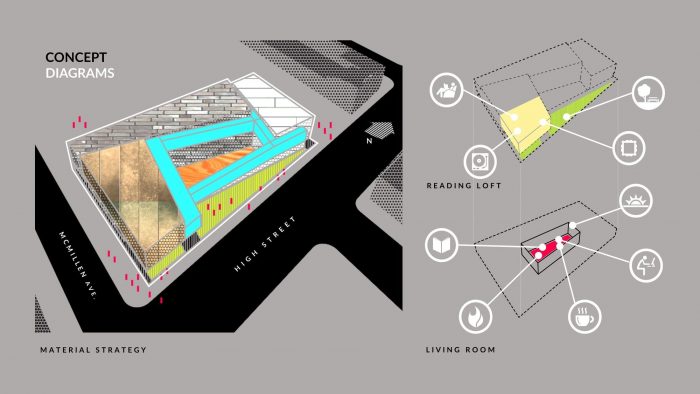 Currently sitting at a junction of four significant urban vectors in Columbus; the Short North growing north, the University growing south, the Peach District bordering to the west, and Weinland Park to the east. Rather than one single contextual driver, the library is a reflection of this unique junction, and as such celebrates the scale, material, and vibrancy of these neighborhoods.