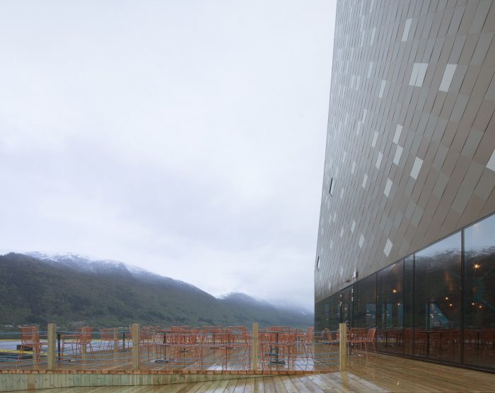 The colors look different depending on the light outside and their reflect their surroundings of the fjord and the mountain peak behind it. The Norwegian Mountaineering Center is an inviting and inclusive building which volume radiates its content while it is rooted in the site culture and landscape through an expressive architecture being a fantastic attraction in Åndalsnes.