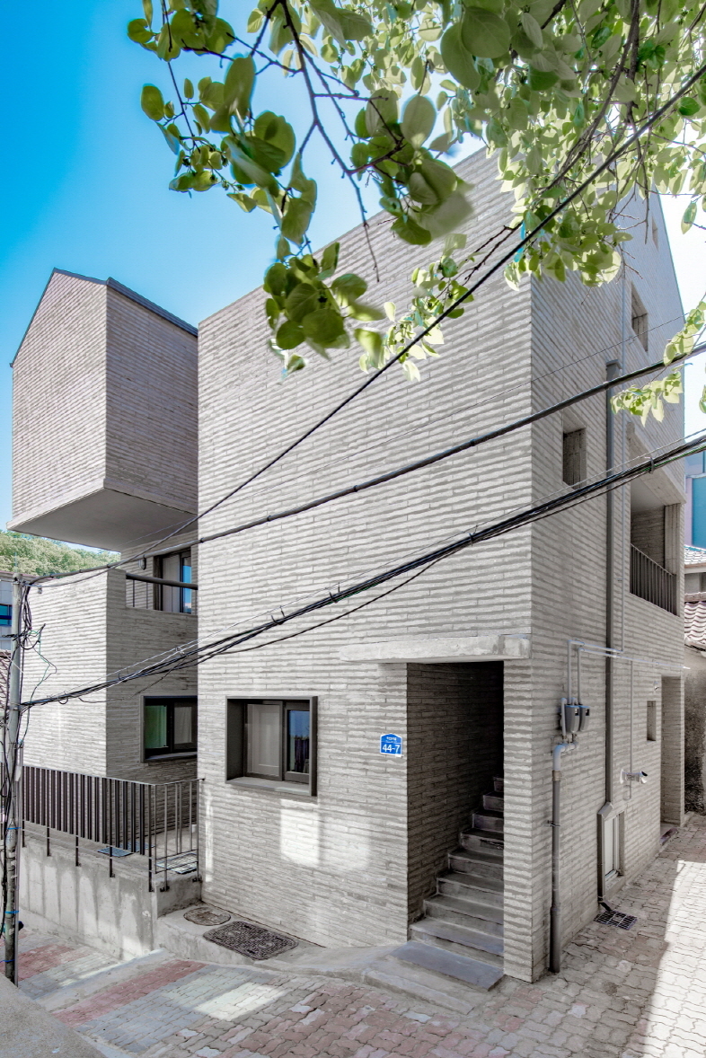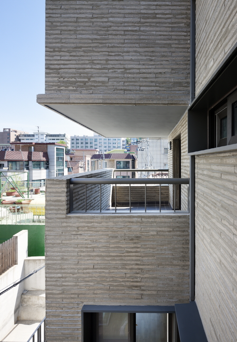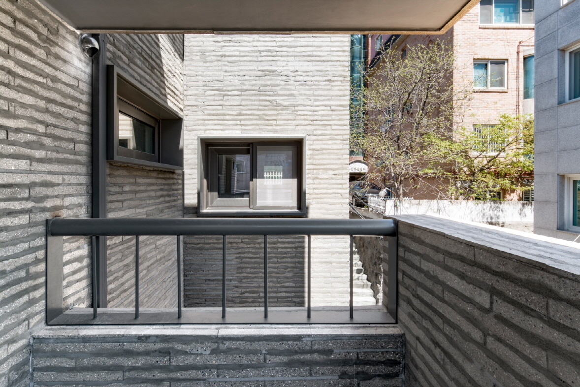 The alley was always kept quiet and there was a very large mountain behind the site, but the view was blocked by many surrounding buildings. The nearby multiplex houses have a very common and boring facade like any other old residential areas in Seoul, mostly finished with lame red bricks or granite.