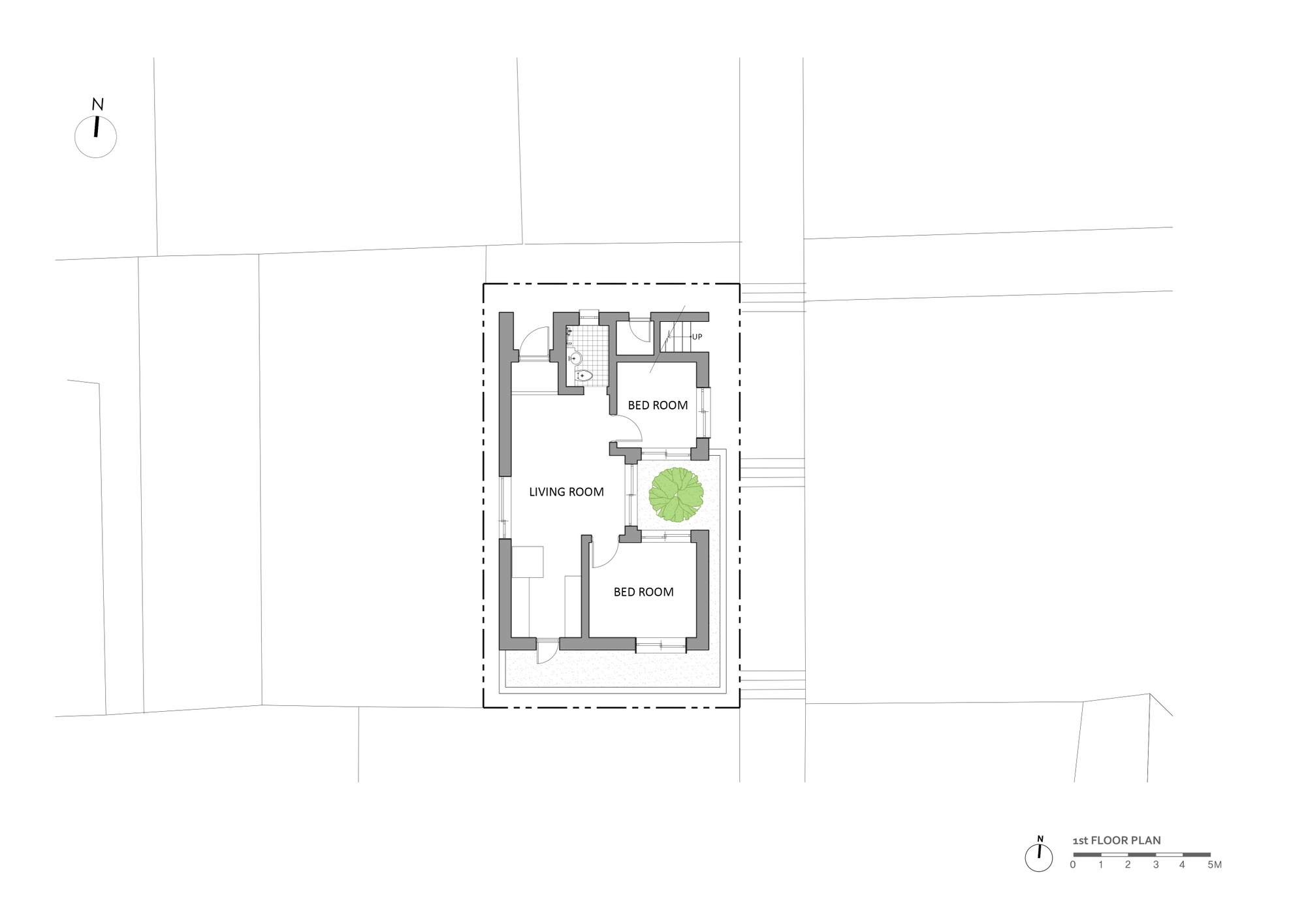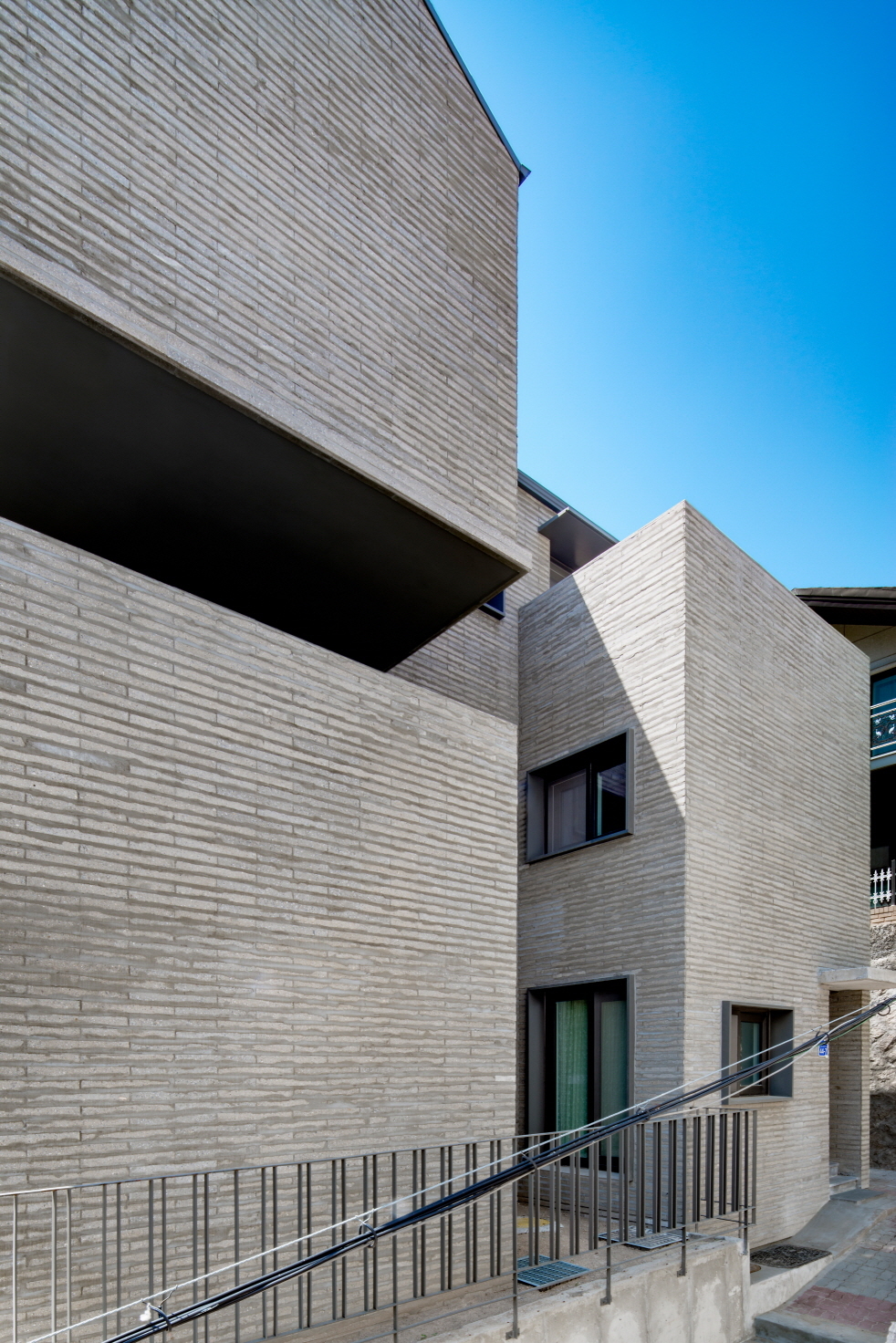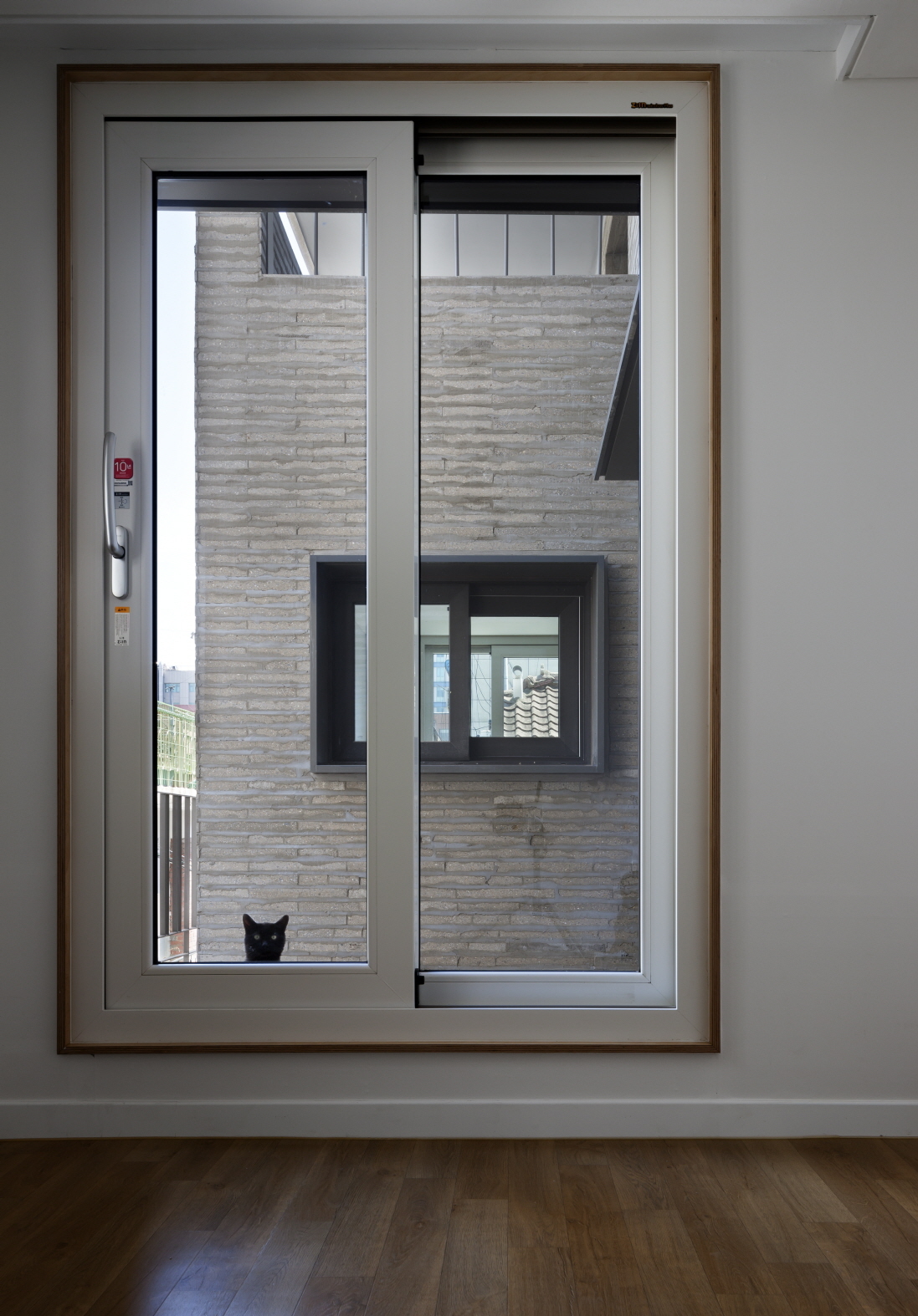 The alley was always kept quiet and there was a very large mountain behind the site, but the view was blocked by many surrounding buildings. The nearby multiplex houses have a very common and boring facade like any other old residential areas in Seoul, mostly finished with lame red bricks or granite.