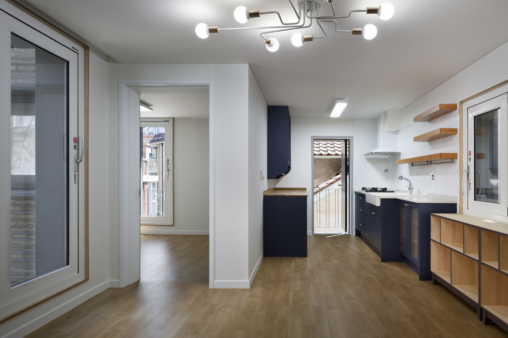 Since the lot is small, each unit space is designed to fit the required function perfectly like a custom suit. A mother’s quarter was placed on the first floor, a couple’s bedroom on the second floor, and a living room and kitchen on the third floor. The courtyard is naturally on the ground floor with the terraces on the second and third floor. On the third floor terrace, a view to the disheveled cityscape slowly encroaching solid Inwangsan Mountain is available for the occupants.