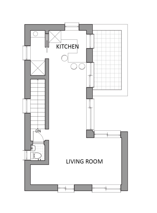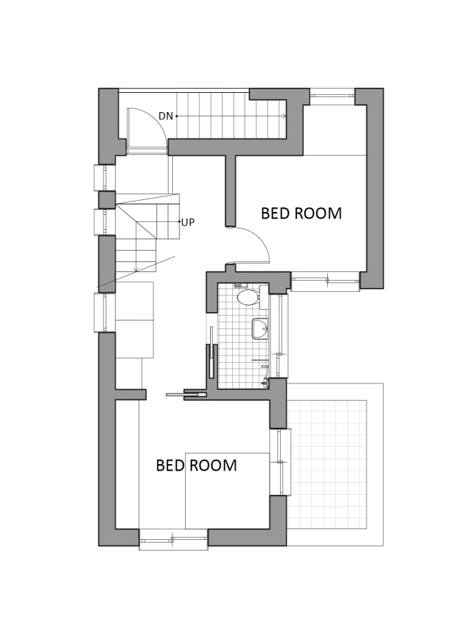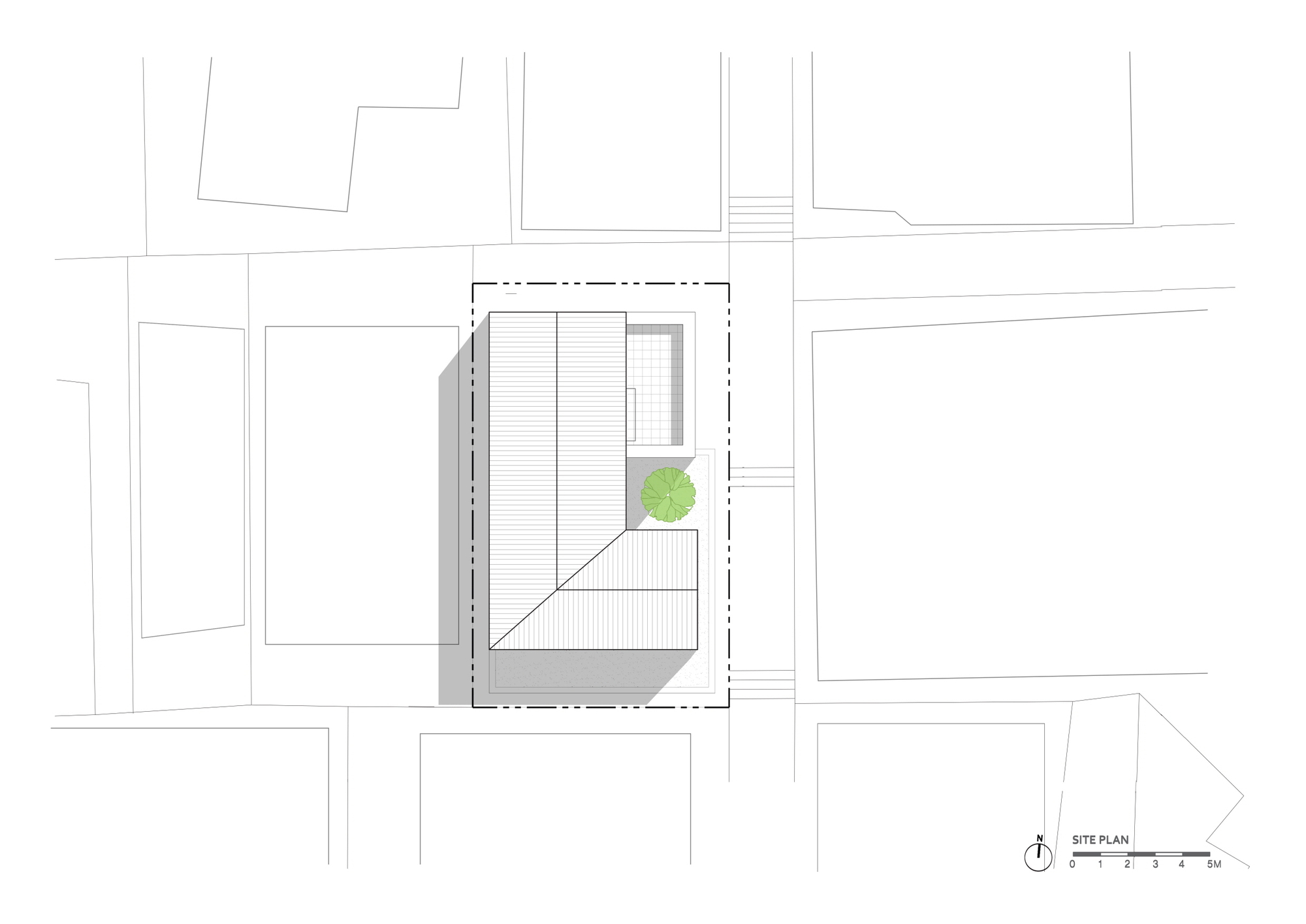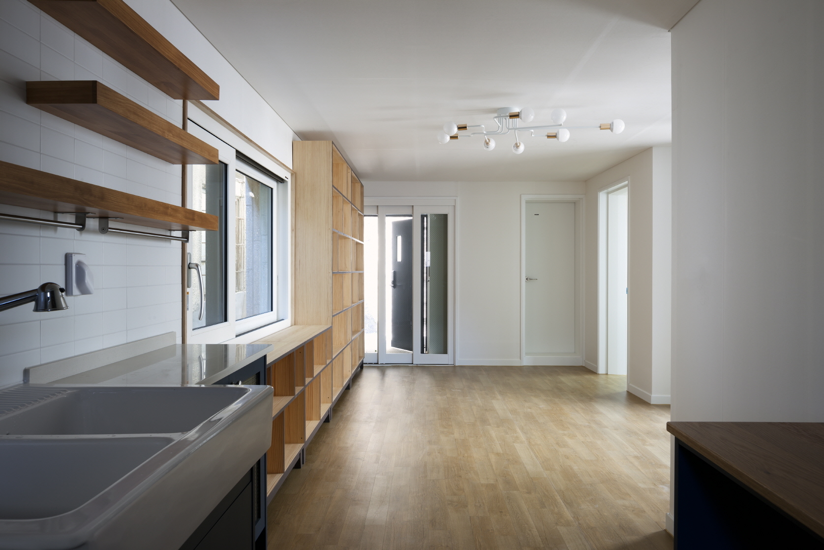 From the shape of the long, narrow site, we drew a ‘ᄃ’ shaped plan to make space for a small court-yard. The residential functions are located in the east and the south wing, allowing as much natural light as possible, and service functions like kitchens and toilets are to the west wing. The courtyard is seamlessly connected to the alley, allowing expansion of outer space.