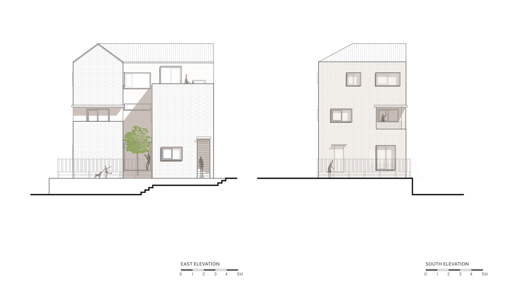 We separated each generation by a vertical split and set separate entries for each, then created a shared space in-between. This scheme caused friction with the administration office since they insisted that the house should be interpreted as a multiplex house, not a single house. (Eventually solved by numerous visits).