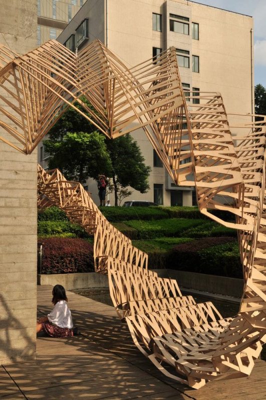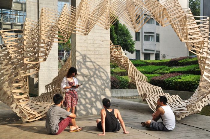 Relying on parametric design they designed 484 unique pieces that come together and create a curved loop. Using parametric design has given students control over the shape, geometry and assembly of the structure.