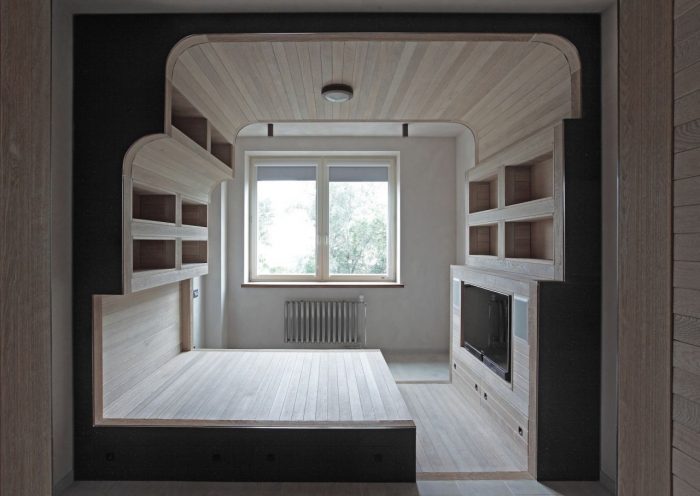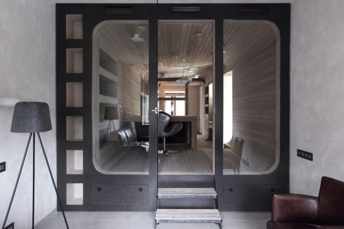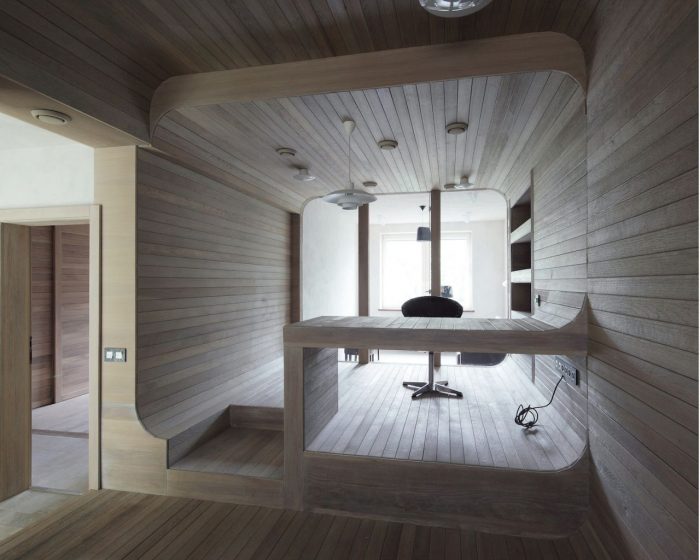 The interior treatment with light oak is a design decision that adds both to the aesthetic of the space overall, as well as to the lighting conditions within. Light reflects and bounces with more vivacity and life off these wooden planks than it would off any whitewashed plaster wall. The linearity of the space is accentuated by the horizontal running of the planks and made to feel… alive- there seems to be no other word that quite does it. Cabinets, closets, tables, shelves, beds- these things are fluidly incorporated into the ‘oak tube’ which unifies floor, wall, and ceiling. This ‘oak tube’ has a strange calming effect. It just doesn’t feel as if it is located five floors up in a building in Moscow, Russia. Instead, perhaps somewhere with an ocean nearby.