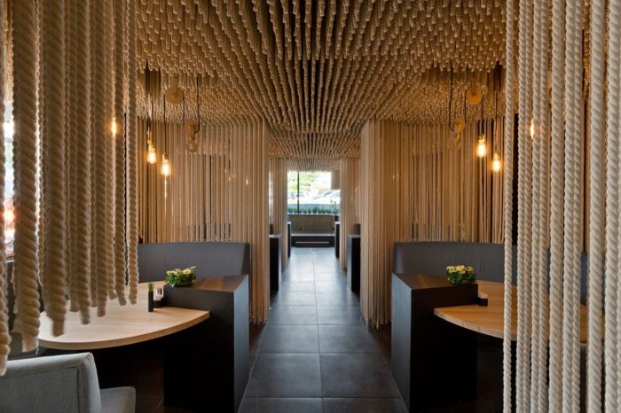 The atmosphere was formed largely by perception of materials and light. The space of the main hall is formed around the island lounge zone decorated with ropes stretching for about 30 km in total. In the evenings floor lamps directed at the ropes create a cosy lounge atmosphere changing the emotional perception of the place drastically. The play of light can be well seen from the façade attracting a visitor to look inside.