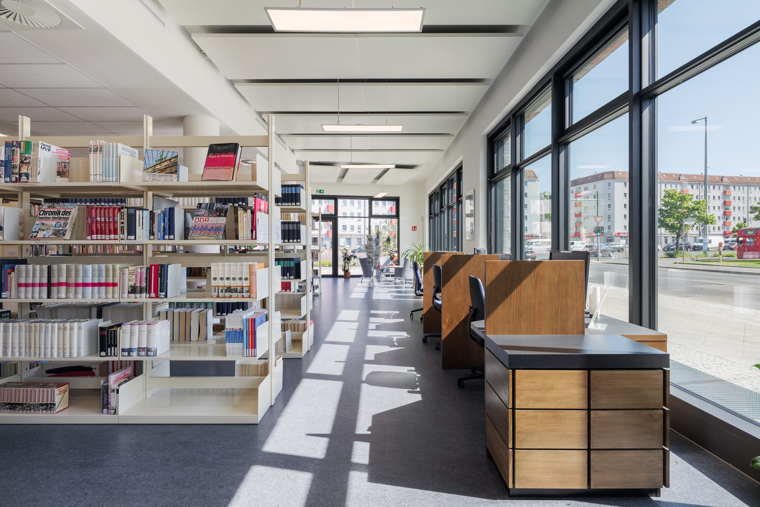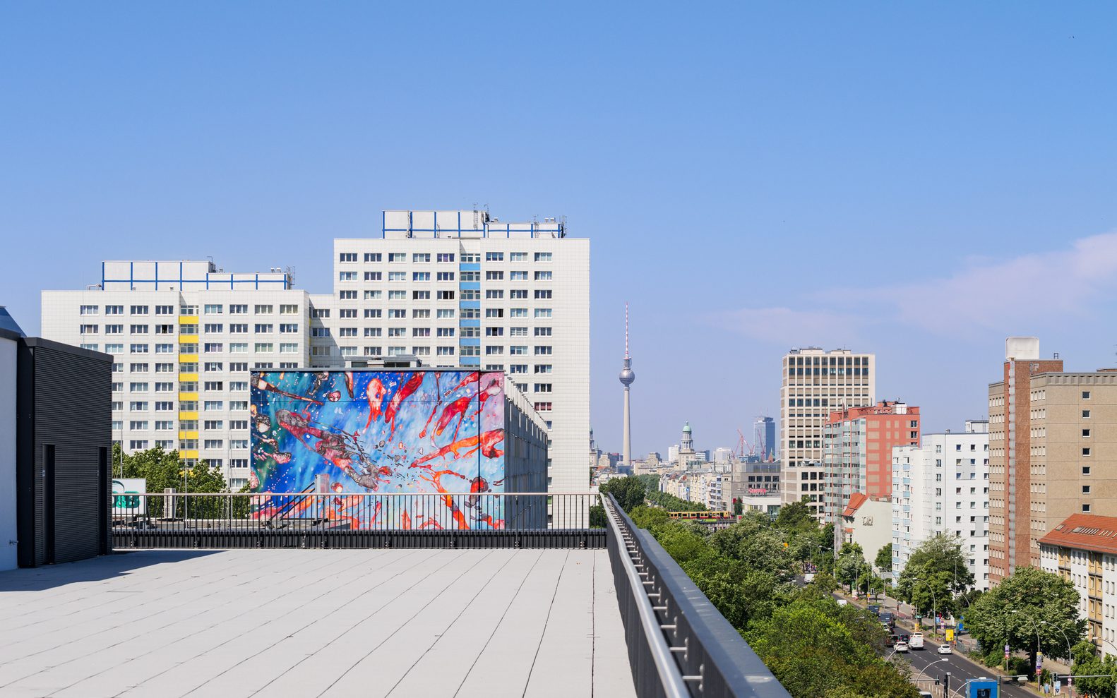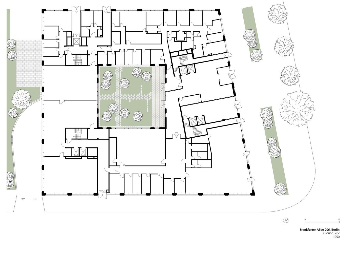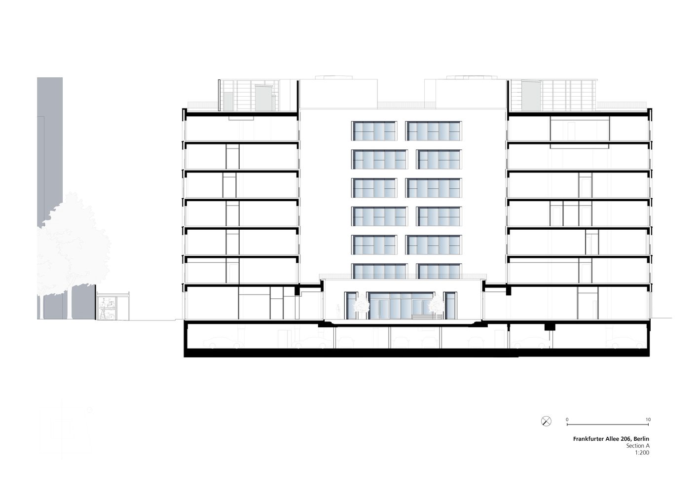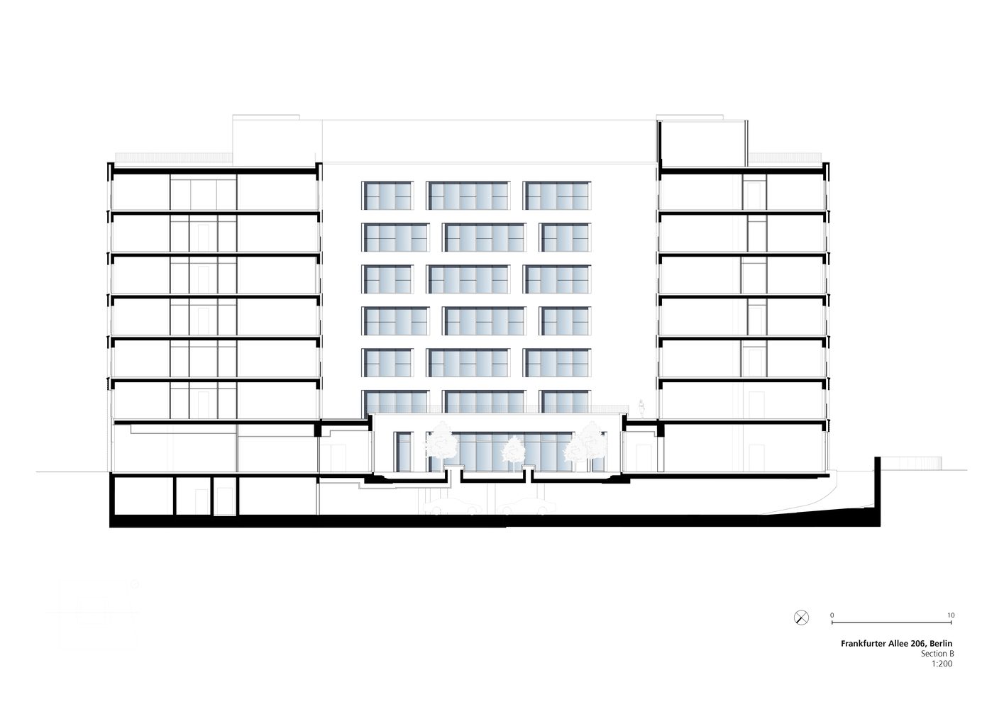 Seven storeys high and made from reinforced concrete, the building has a single-storey underground car park. The building’s horizontal top is a partly landscaped flat roof, which functions as a retention roof capable of storing water. A roof terrace with panoramic views towards Frankfurter Tor and the Berlin Television Tower can be used for events. The landscaped square inner courtyard has seating and a pavilion.