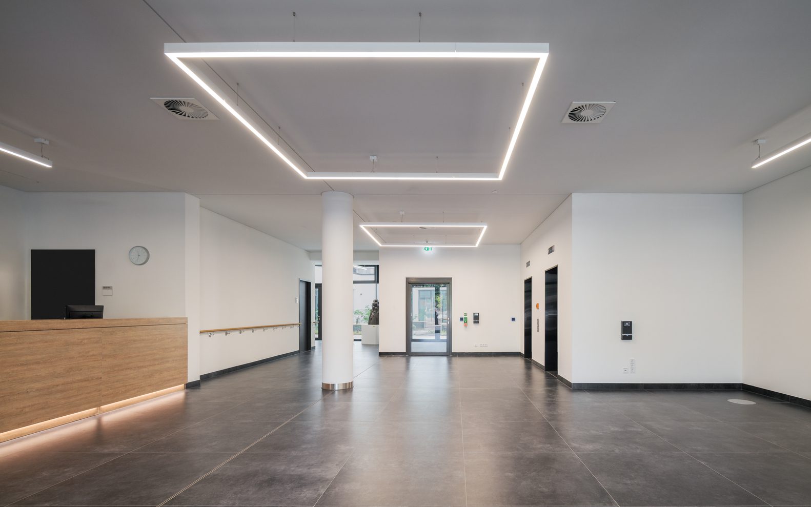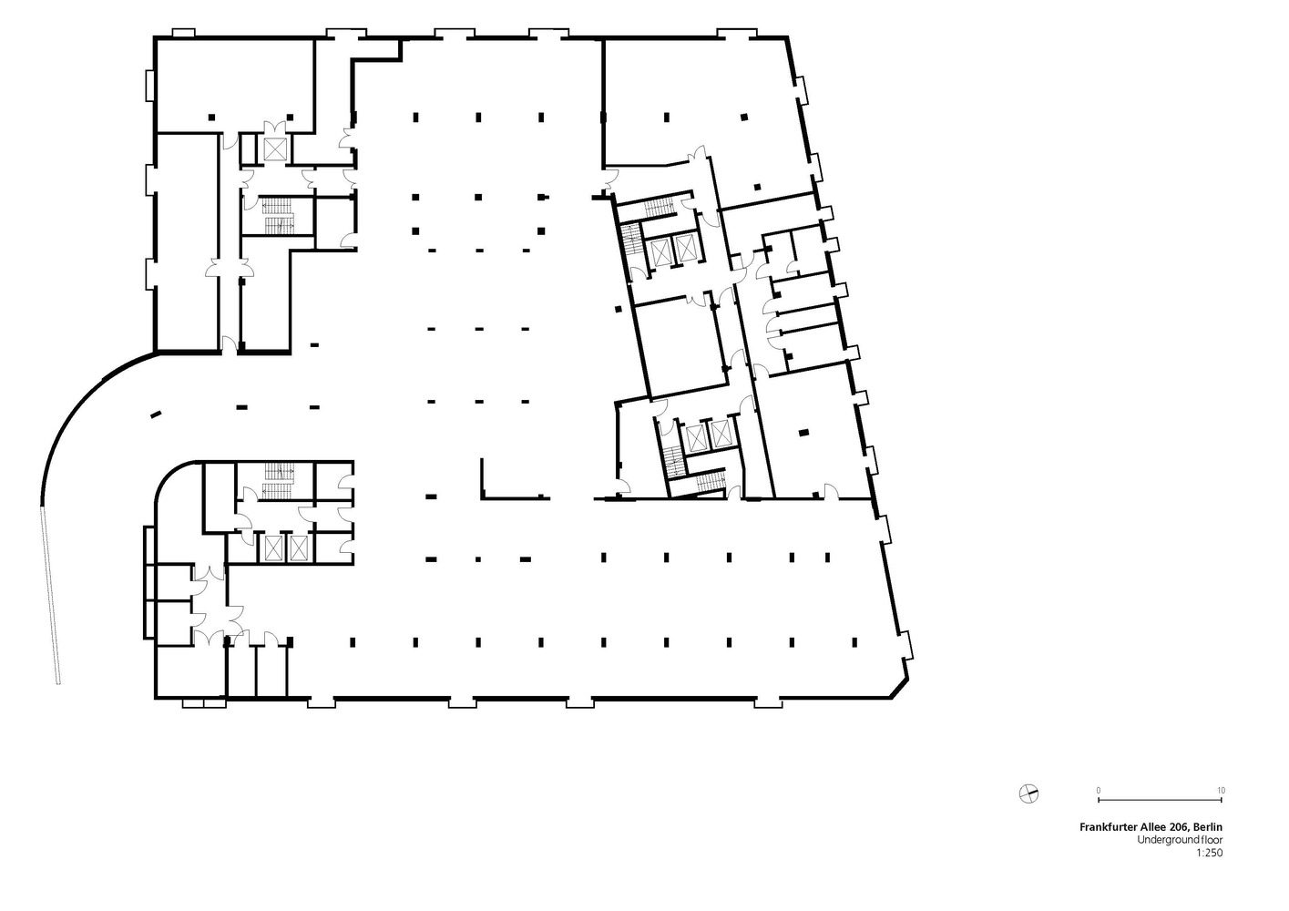 The office areas are accessed via two entrances from Frankfurter Allee and one from Buchberger Strasse. The ground floor contains public areas belonging to the main tenant, office space, and a delivery and waste-disposal area. To achieve a high degree of flexibility of use on the upper floors, each floor has been given four user units. Each user unit has its supply core, which is located close to the stairwell in each case. The underground car park has an access ramp at the rear of the building and provides sufficient car and bicycle parking spaces. Additional bicycle parking spaces are located on the grounds and in front of the building. This project has received gold certification from the German Sustainable Building Council (DGNB).