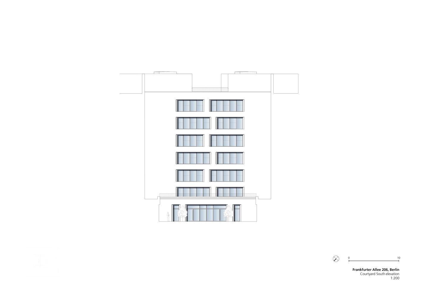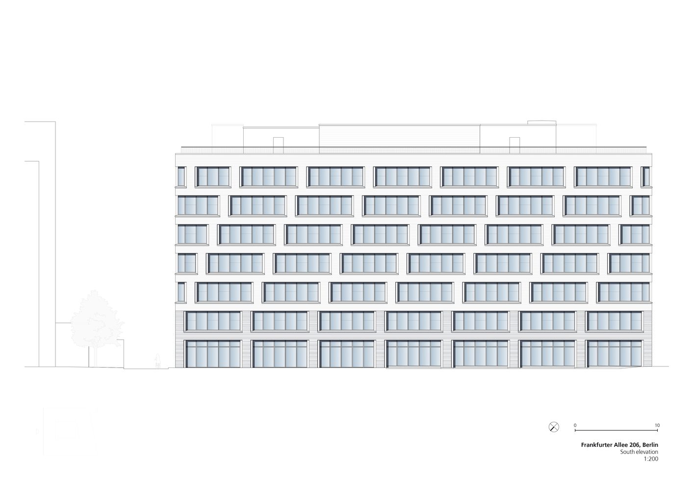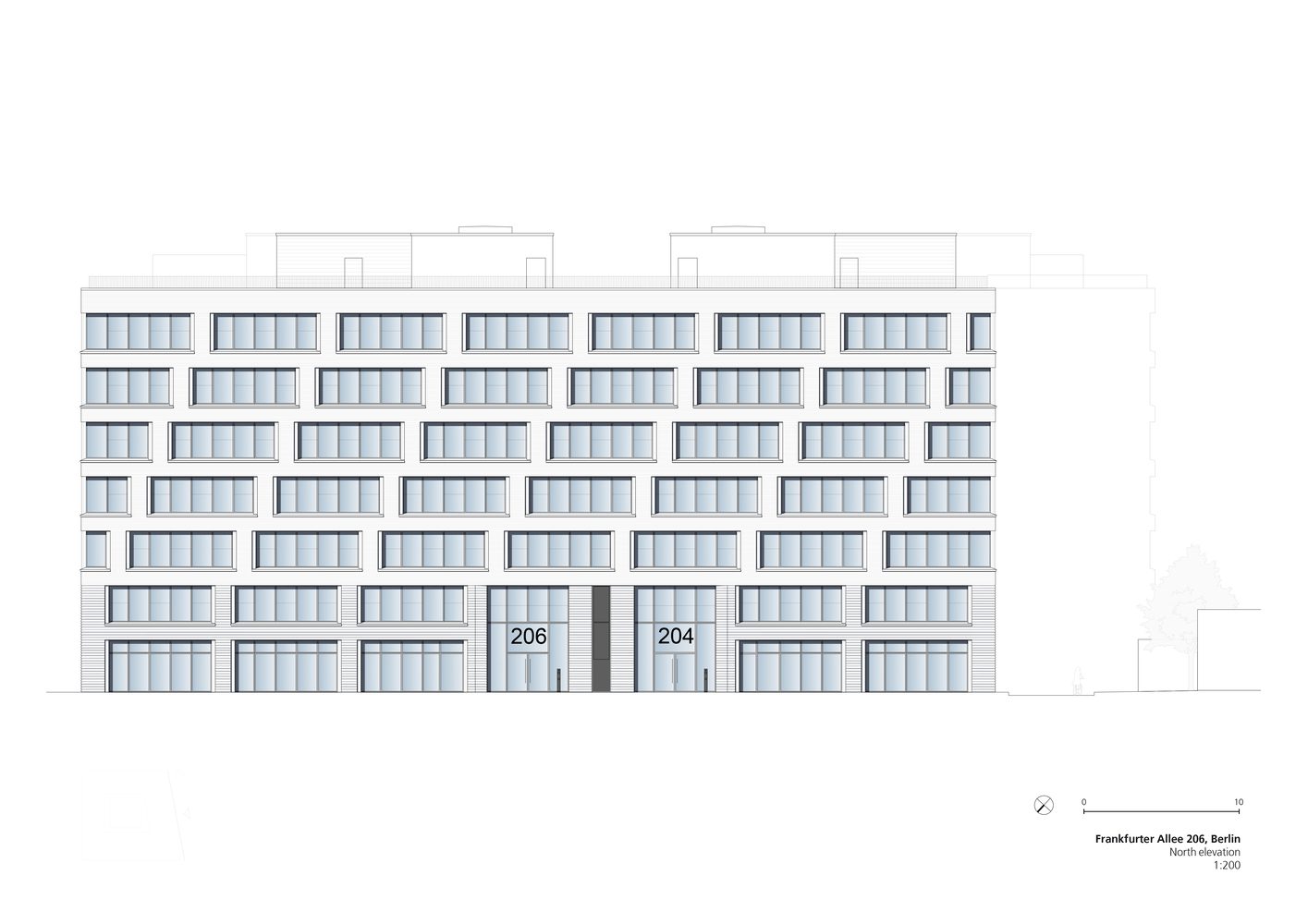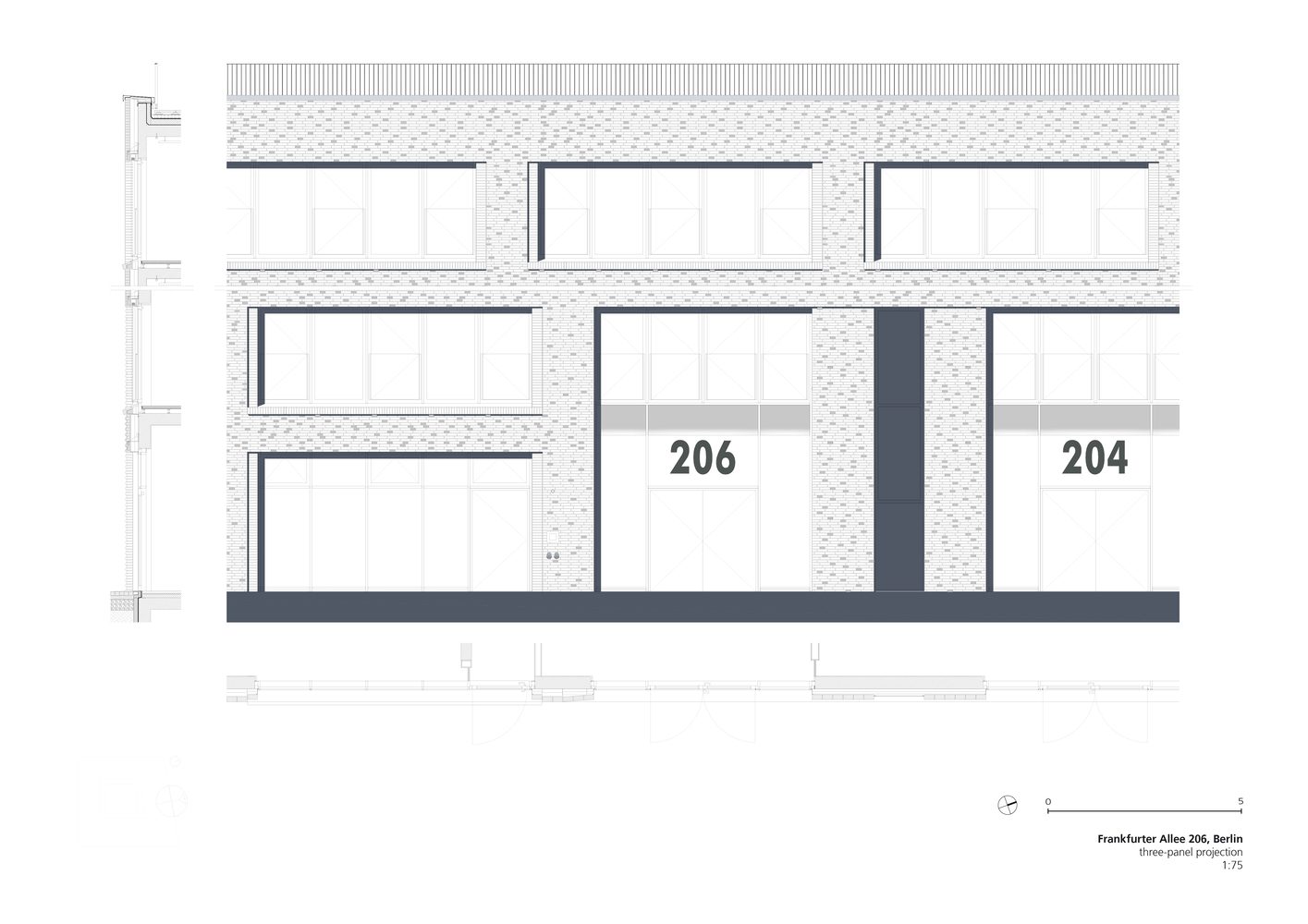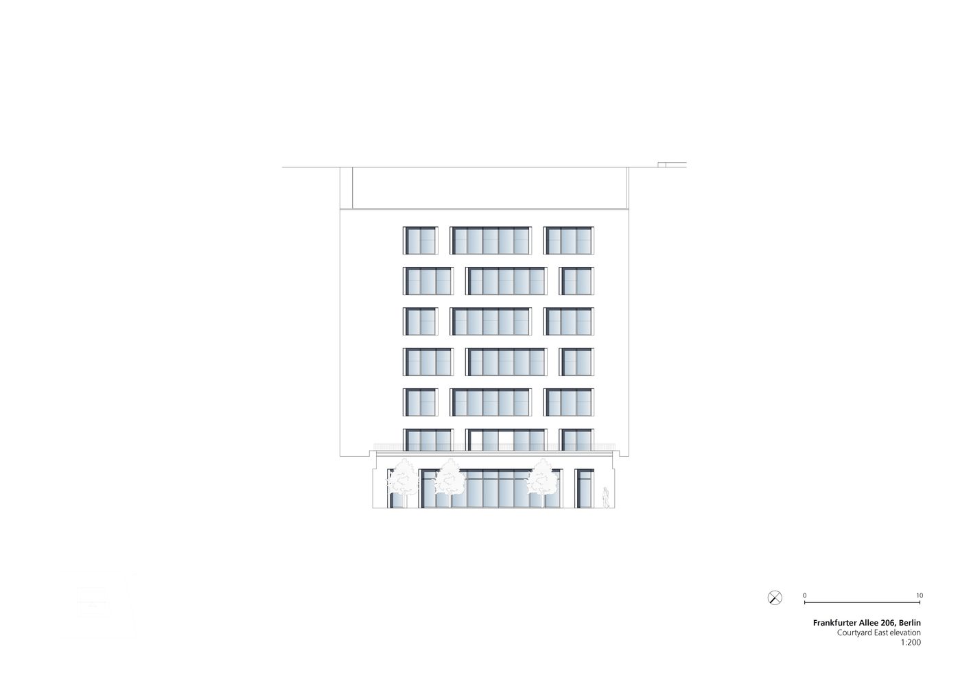 A new modern, trapezoidal office building FA 206 now occupies an approximately 6000-square-metre corner plot between Frankfurter Allee and Buchberger Strasse in the Berlin district of Lichtenberg. The building has a green inner courtyard and an expressive rust-red clinker brick façade whose materiality and colour refer to historical industrial buildings from the beginning of the 20th century and set up an emphatic new contrast with the otherwise postmodern architecture of surrounding buildings from the GDR era.