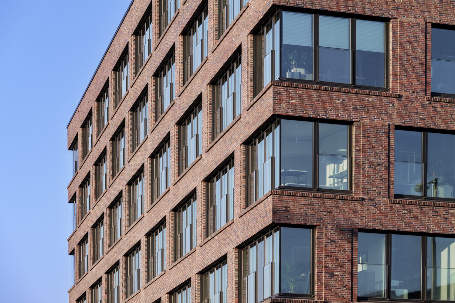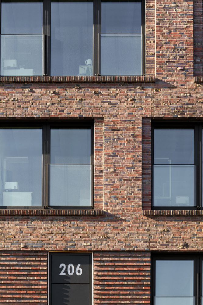 Impressive for its tactile quality and detailing, the façade is visually divided in two by a change in the pattern of the windows and the structure of the clinker bricks. The building’s plinth comprises the ground floor and the first floor. The linear, horizontal clinker brick relief here calls to mind Expressionist architecture. The window elements are positioned one above the other; the corners of the plinth have no openings. The entrances seem two-storey. Large-format house numbers ensure that the building’s address is clearly visible from afar. The clinker brick structure of the storeys above the plinth is predominantly smooth. Here individual clinker bricks with convex textured surfaces created by coal firing and arranged in irregular patterns stand out from the smooth surface and form exciting accents, particularly when the sun is at different angles and changes in the light create different moods. The floor-by-floor shifting of the individual, floor-to-ceiling window elements around a grid field creates a unique façade dynamic. The corners of the building are glazed following the rhythm of the grid.