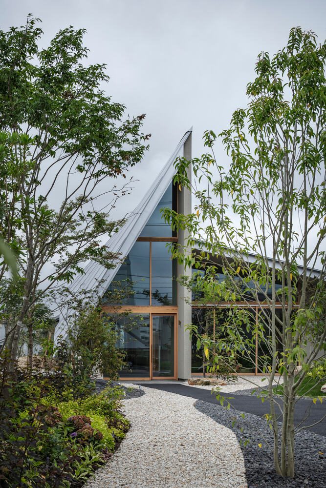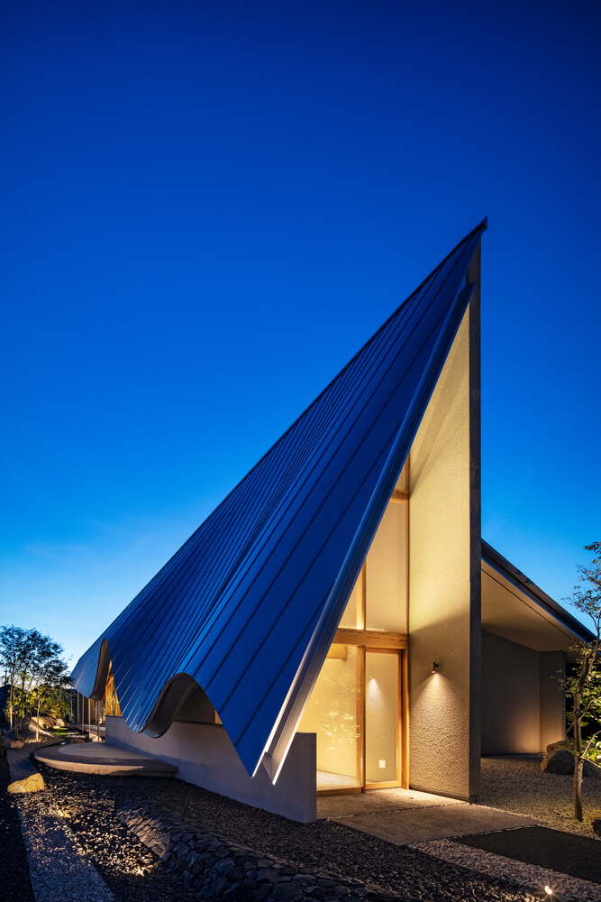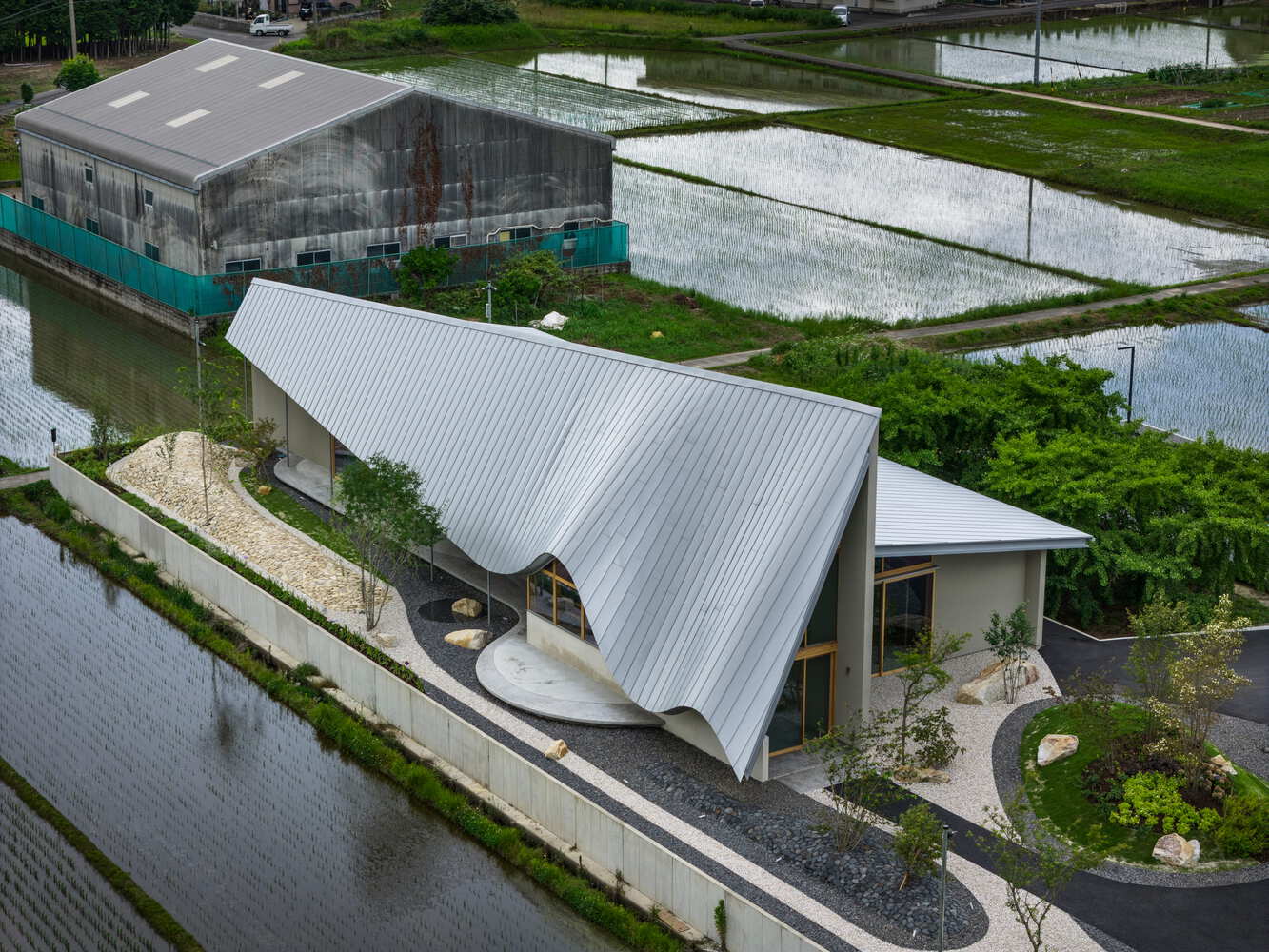 The roof is the building’s most distinctive feature. It rises dramatically toward the east, cutting a bold profile against the sky, while its eaves descend close to the ground. A gentle undulation in the roofline introduces a subtle irregularity, highlighting the reflected light, the color of the sky, and the movement of raindrops—bringing natural phenomena into focus and enhancing the charm of the surroundings.