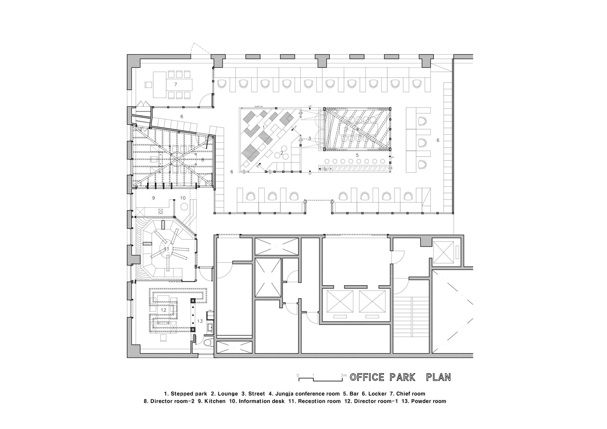 By blending the concept of park for resting and enjoying, and working place, we designed the programs of stepped garden, JungJa, bar, lounge, etc, to enjoy the free strolling. Thereby, all the places are characterized as various places of working we expected to improve the efficiency of working by interaction of hybrid behavier, working, resting, strolling.
