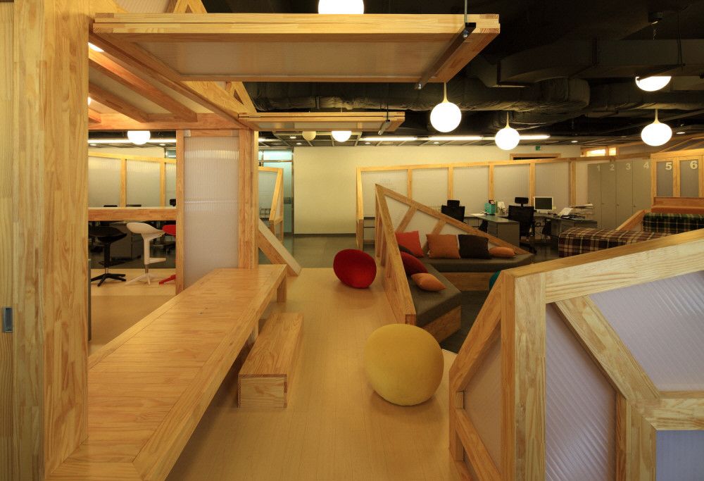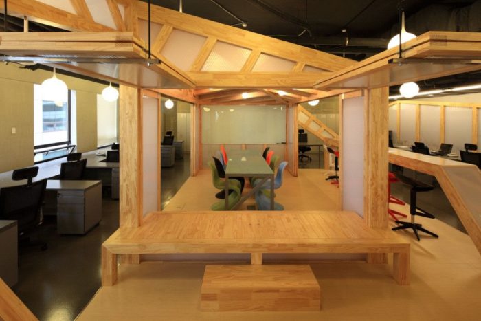 Young people, the user of this space, require to use wood for main material because of it’s ecological property. We decided to use translucent poly carbonate glass as a sort of partition. thereby, we try to produce a traditional but modern office landscape by contradistinctive harmony of wood and plastic glass, in terms of material.