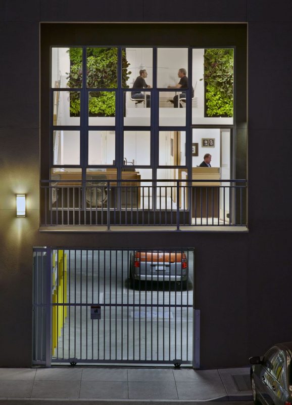 The focus of the space is a living wall of mixed plants that takes filtration a step further. The plants are affixed to a perforated stainless screen that is connected to a fan. Air is drawn through the plants, thus providing natural filtration, and then recycled back into space. The office space is on track to achieve a LEED (R) Gold rating.