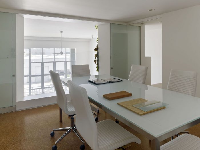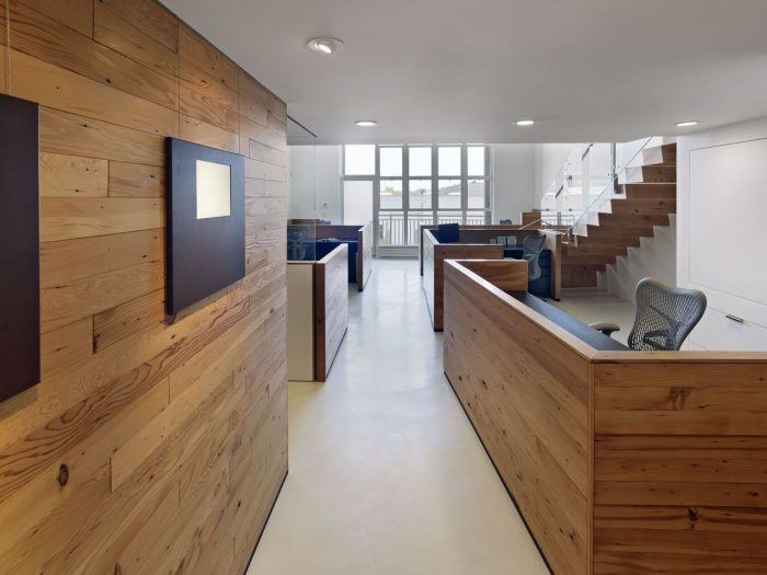Particular attention was given to green and recycled materials. Reclaimed Douglas fir was used at the partitions, entry wall, and cantilevered stair. Workstation counters are recycled paper stone. Cork tile was used in the conference area, bathroom, and kitchenette. No VOC paints were selected for all walls and ceilings. Energy efficient fixtures were selected and instead of a traditional HVAC system, each workstation has an independently controlled radiator.