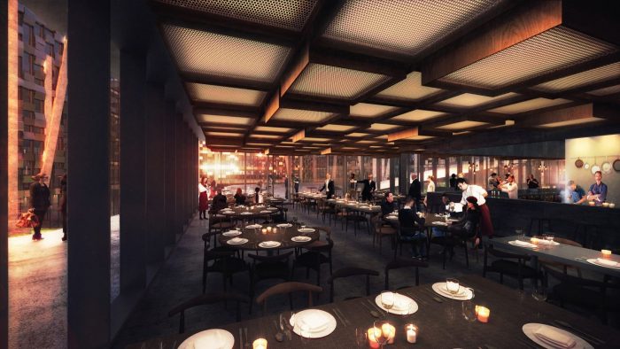 In order to maximize public availability, the building is cantilevered to allow the neighborhood park to flow through the site. The park and surrounding infrastructure are lined with public functions such as dining, markets, and leisure opportunities, aiming to generate life and activity at all hours.