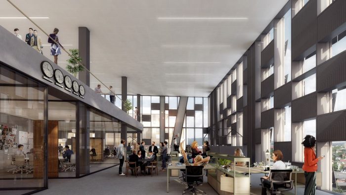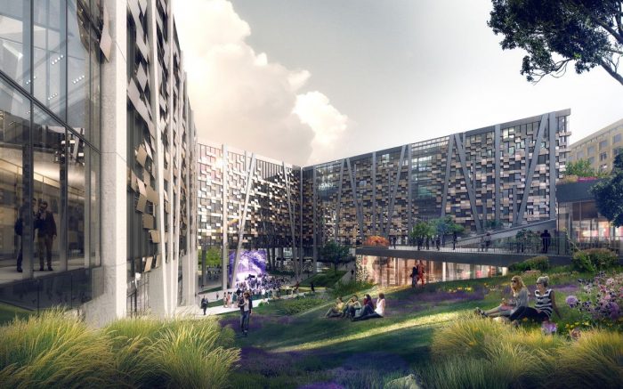 The new building takes the shape of a forest with pathways connecting the urban zone to the east and suburbia to the west. The stems grow out of a lightweight base, branching out to hold the structure. The “leaves” cladding the façade are faceted to catch the light and create movement.