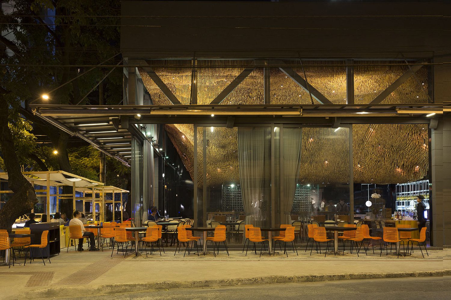 The design philosophy is to amalgamate the intramural ambiance with that of the street, while, promoting a clear distinction between the two. With the clever employment of special lighting and a strict color pallet, the intimate interior stands in contrast with the informal exterior where a set of tables paired with orange chairs are positioned by the sidewalk and fabric pergolas stand suspended sheltering spaces. Wood, black lacquer, building steel rods and glass have been used authoritatively, while the unique and vivid furniture design of steel shelving units and wine cellar and Olga high wooden bench-in pinus-is also created by Arquitetos Associados.