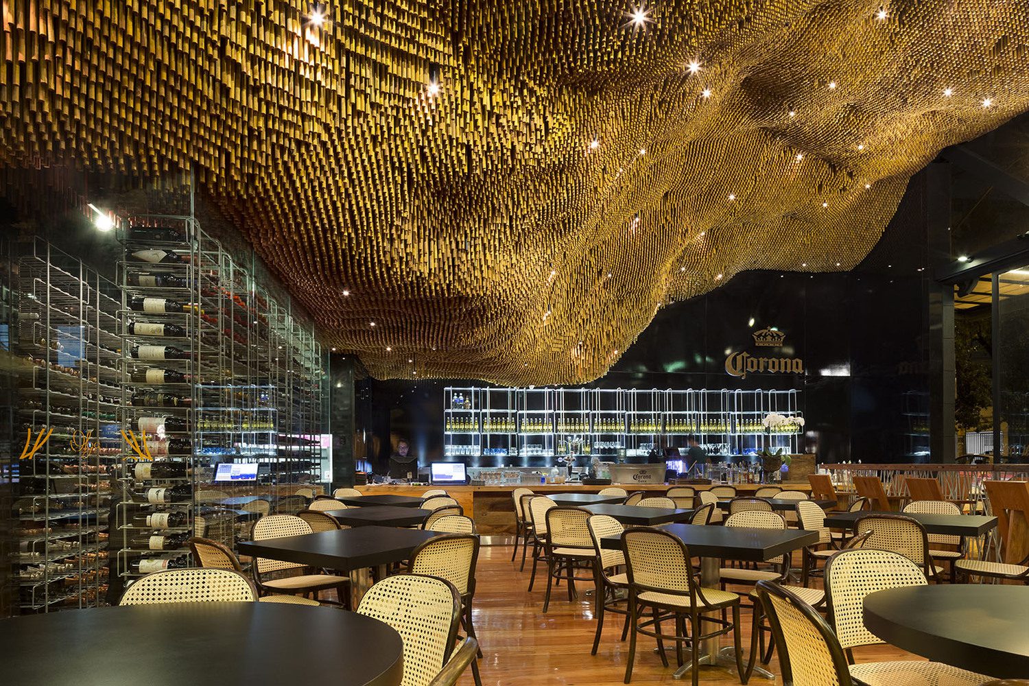 A chronological investigation regarding the usage of dowels reveals its expansive utilization in manufacturing and woodworking. Tracing influences as integral structural elements for Japanese shrines (AD 690) to reliable constructional elements in a ship for Leif Erickson’s saga (AD 1000), dowels have today, found reality in a new domain. A rhythm-filled picturesque expression, reflecting the beauty of a majestic land painted with powdery white sand beaches, immaculate rain forests, Arquitetos Associados have recounted a tremendous personification of Brazil’s topography. Belo Horizonte now stands acquainted with a design marvel.  Arquitetos Associados crowned the completion of Olga Nur Restaurant by defining the project with a distinctive ceiling, furnishing it in character, with a wave-like topography. A rather conscious notion of wonderment is induced into the observers, who witness the 80,000 dowels suspended from the roof canopy. With each dowel unique in length, the ceiling can be held synonymous to an inverted wave-like topography.