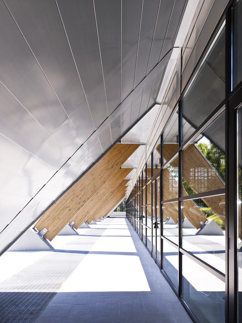The boomerang shaped beams are made up of glulam, designed and produced by Holzbau in Italy.