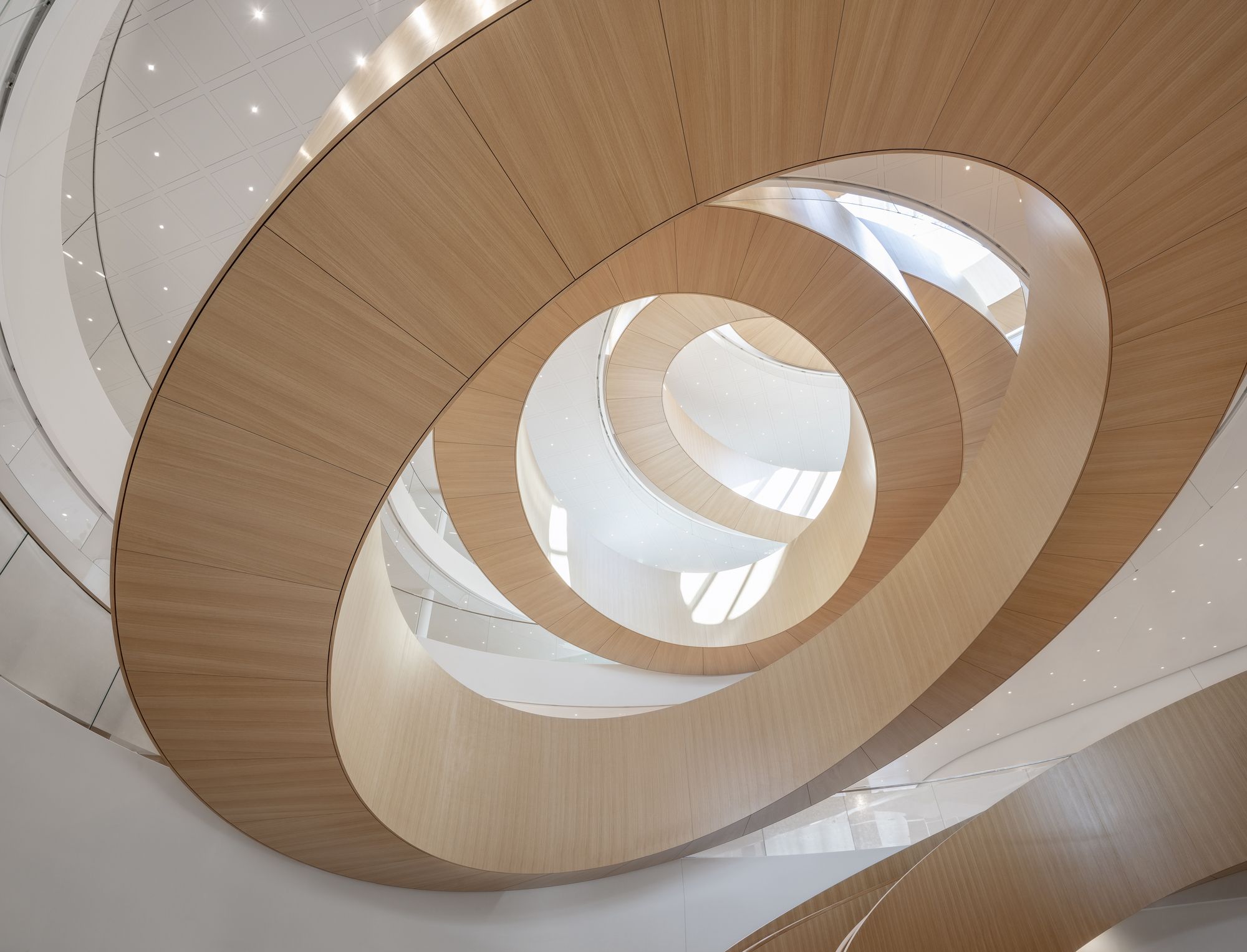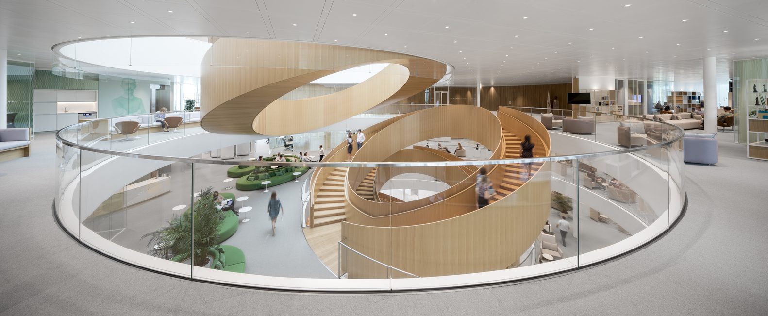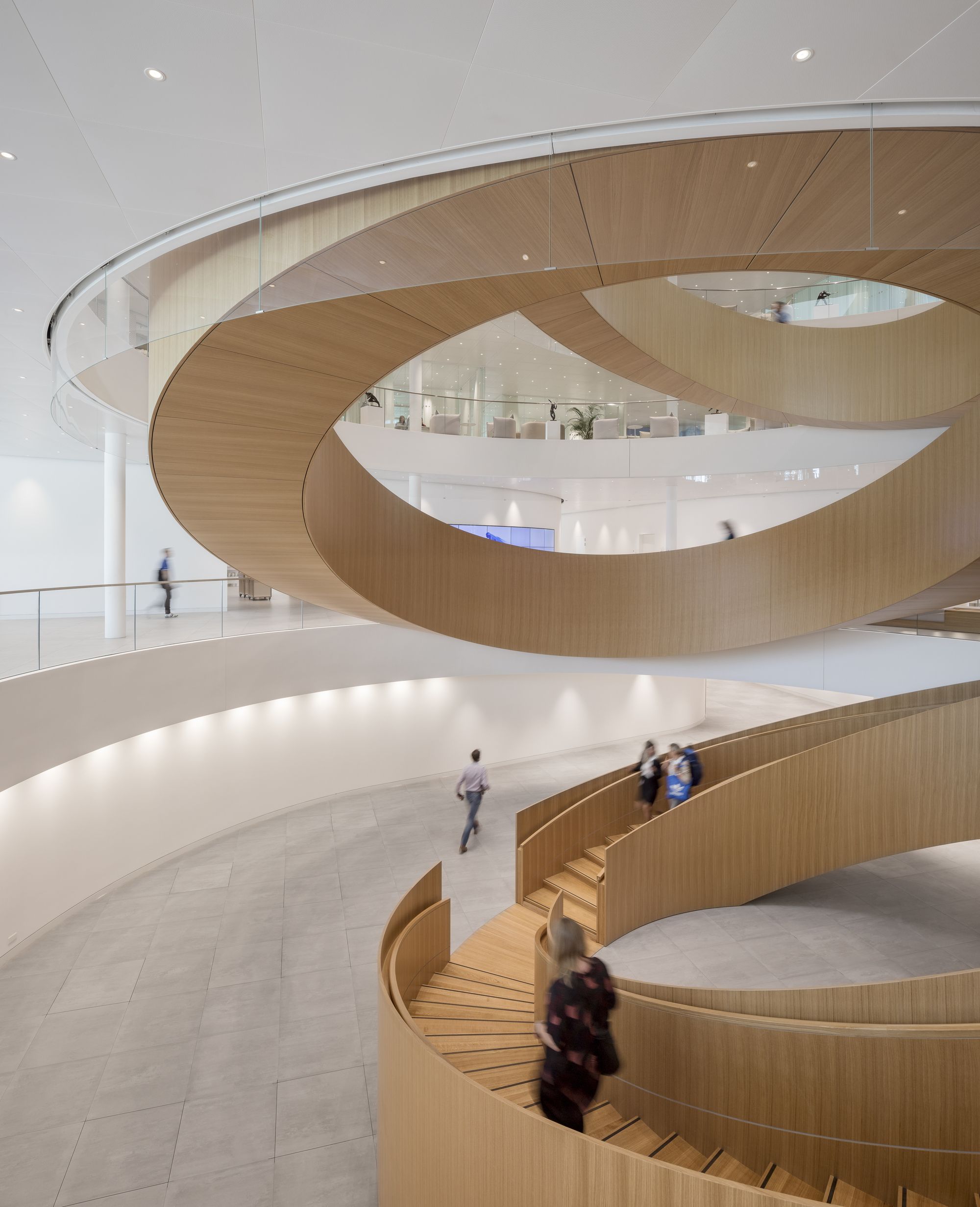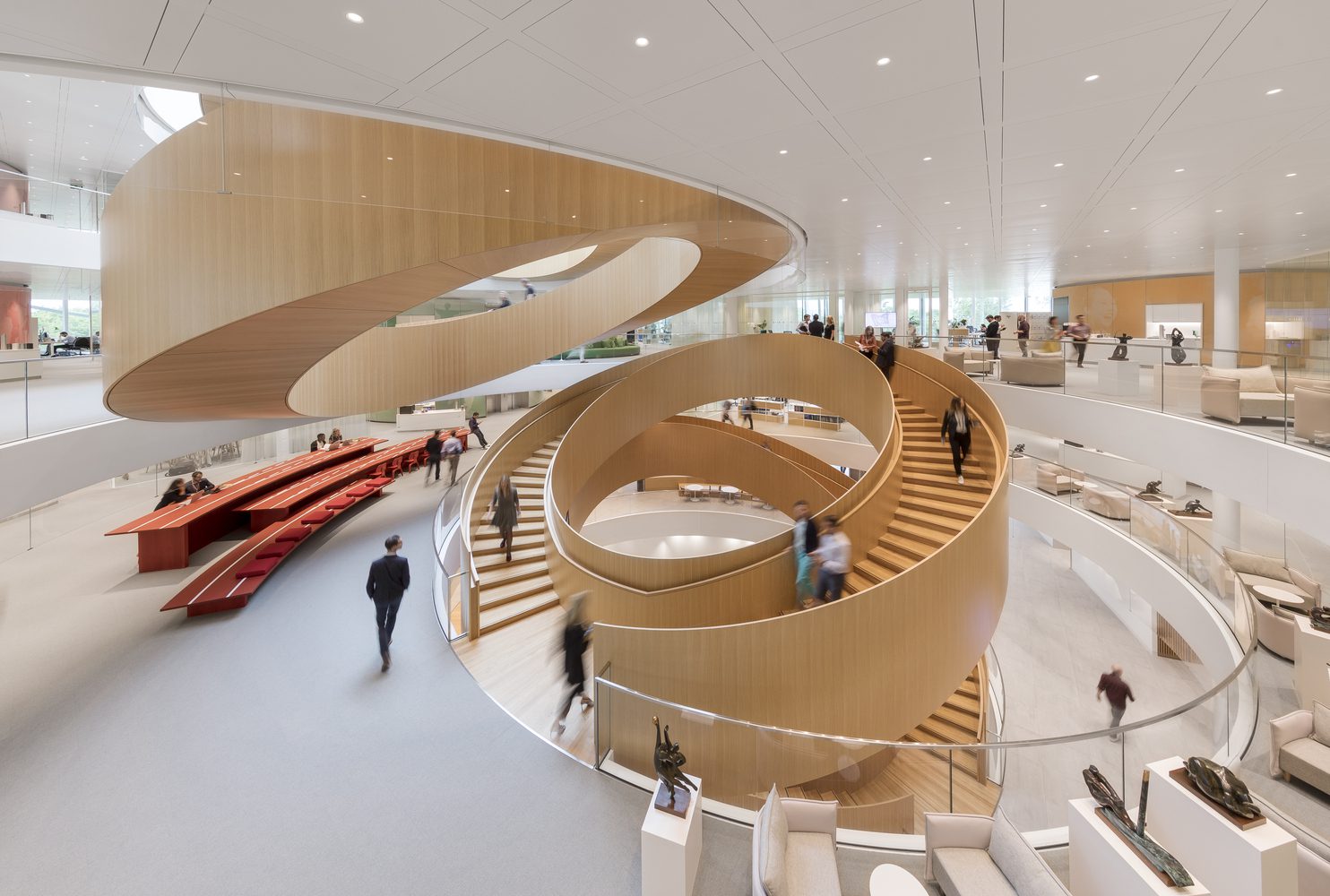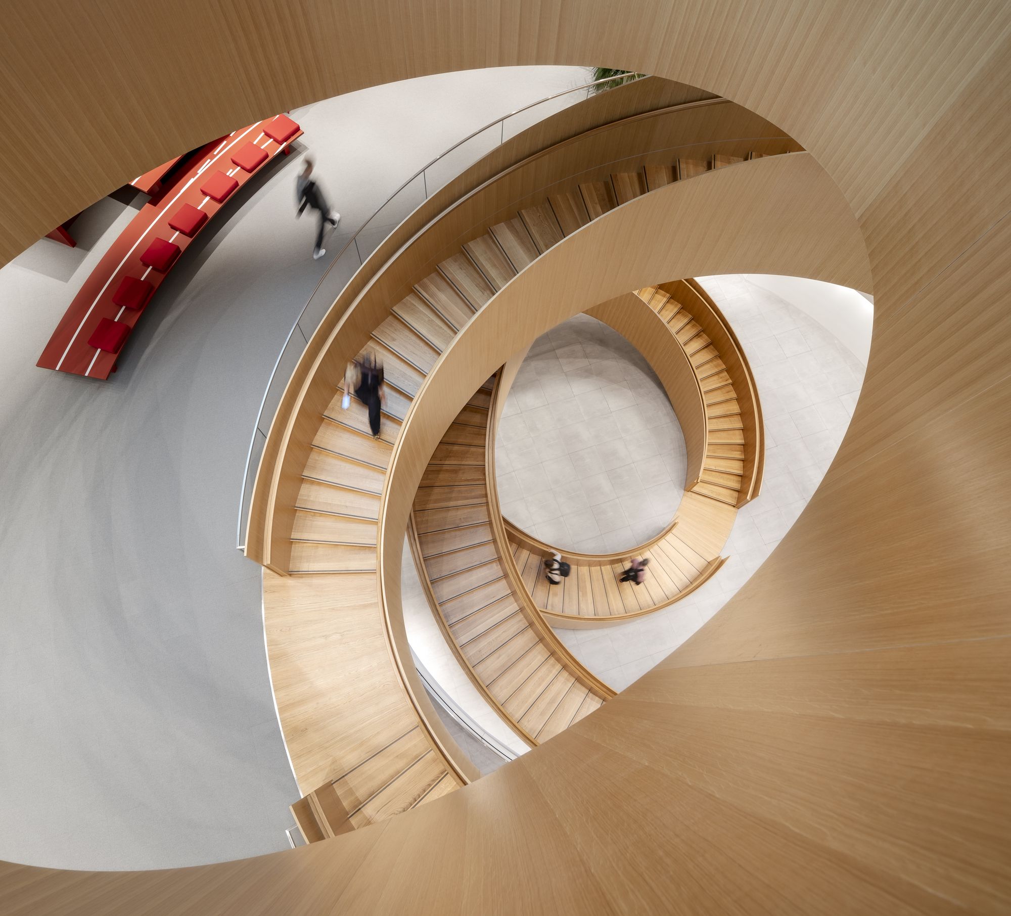 The Unity Staircase, which references Baron Pierre de Coubertin’s Olympic Rings, soars the full height of the building and connects all floors through a central atrium. Following the principles of active design, the oak staircase and its periphery define the central area for social activity and movement. The staircase is a visual expression of the unity and collaboration between the IOC staff and stakeholders. Exhibition spaces, a cafeteria and meeting rooms are also arranged around the central staircase, promoting a sense of community for the 500 regular users. Olympic House is also a unique example of an innovative collaboration between many different stakeholders, including some of the IOC’s commercial partners (Dow, Toyota, and Panasonic), sustainability certification bodies, local authorities, suppliers and academics, as well as the IOC staff.