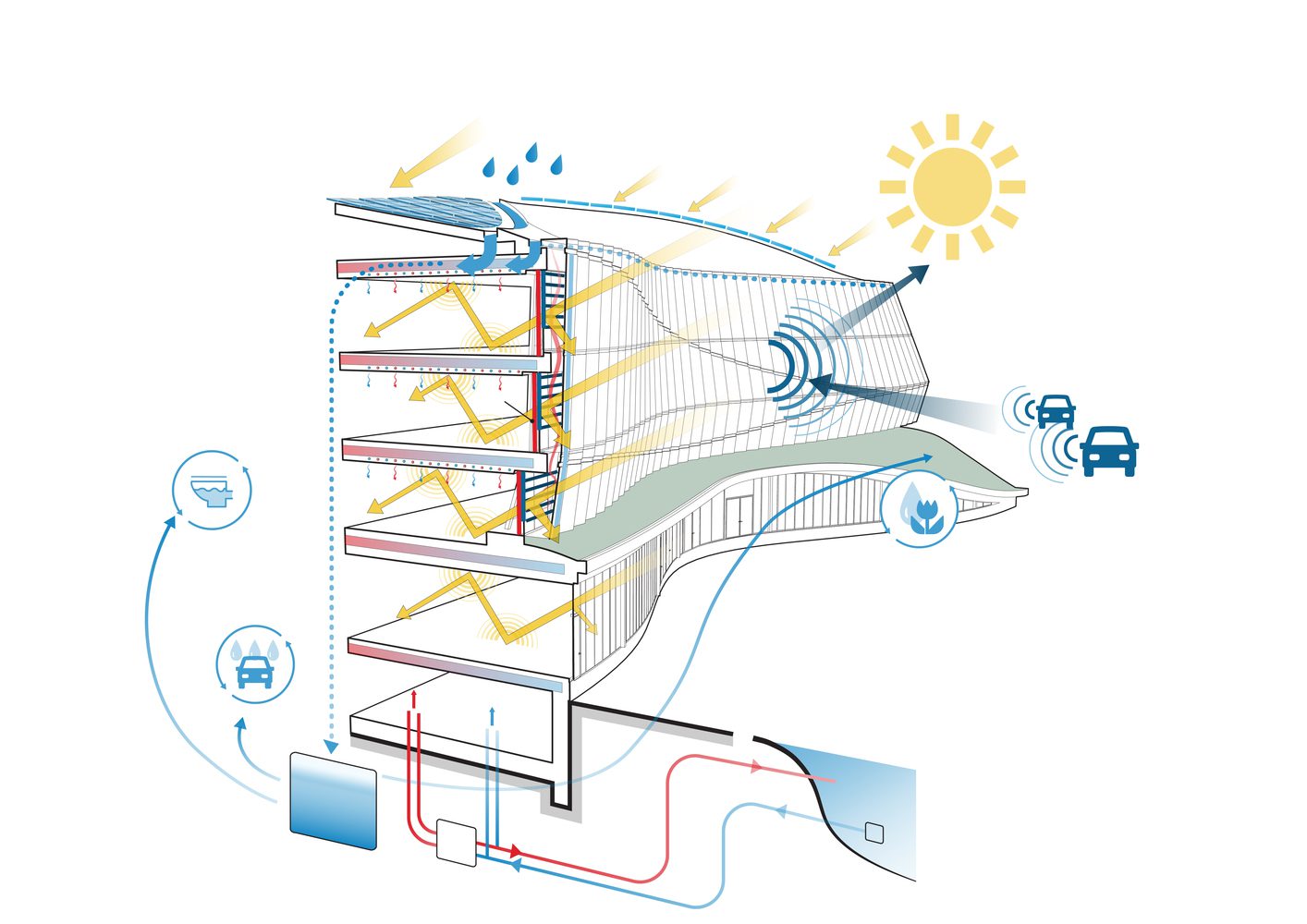 The IOC’s commitment to sustainability has been integrated by 3XN not only into the design and the construction but also through the development of operational concepts for Olympic House. Through innovative features, the building’s environmental footprint is minimized without compromising the quality of the working environment. The building’s envelope allows for excellent insulation through airtightness and the triple glazing on the internal skin facade. The inner layer of the façade provides thermal insulation while the outer layer enhances the design, protecting the building through an integrated sunscreen system and reducing noise from the nearby highway. The envelope of the building is designed specifically to push and flow inward and outward, gaining additional façade surface area for daylighting and views.