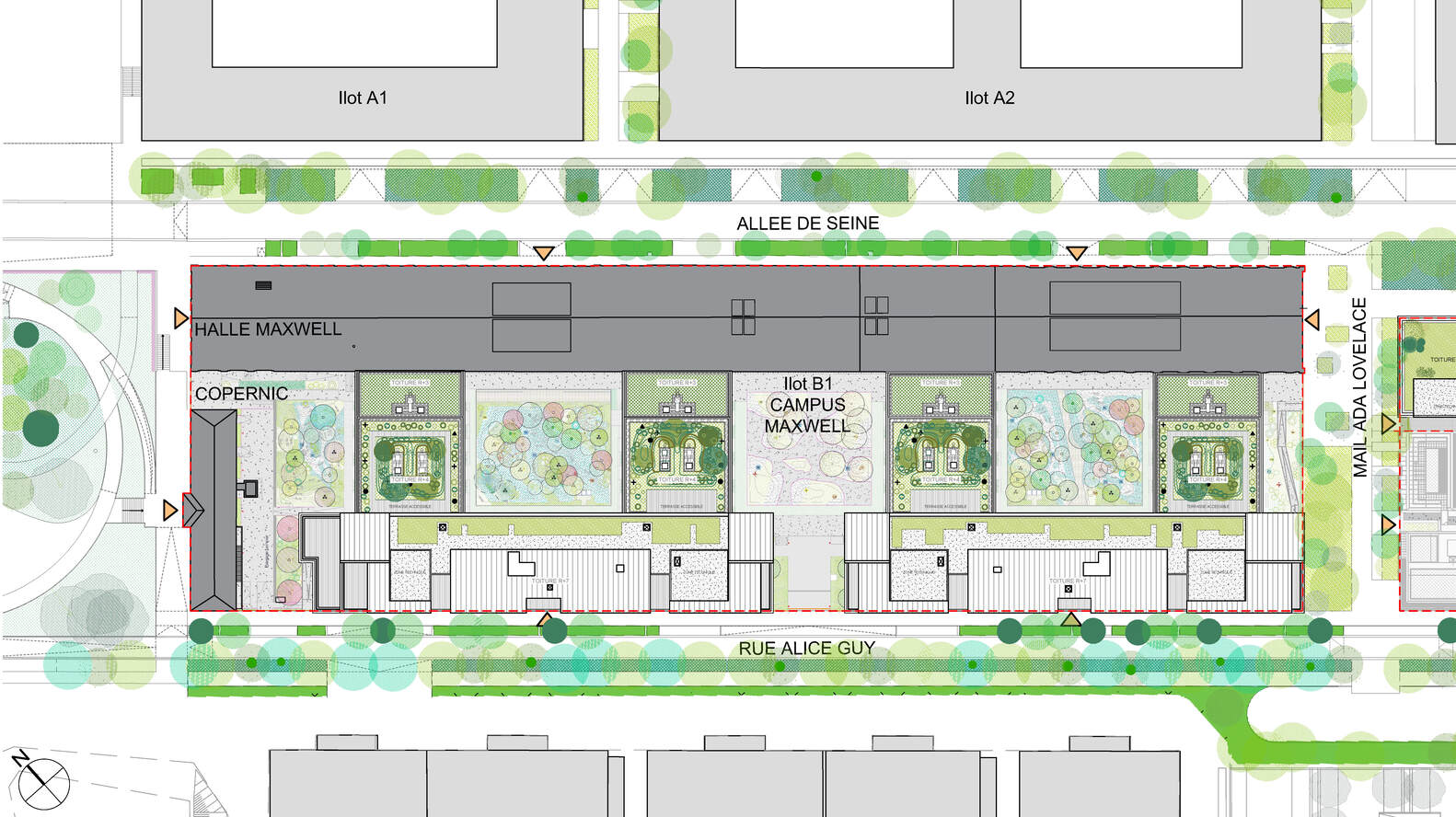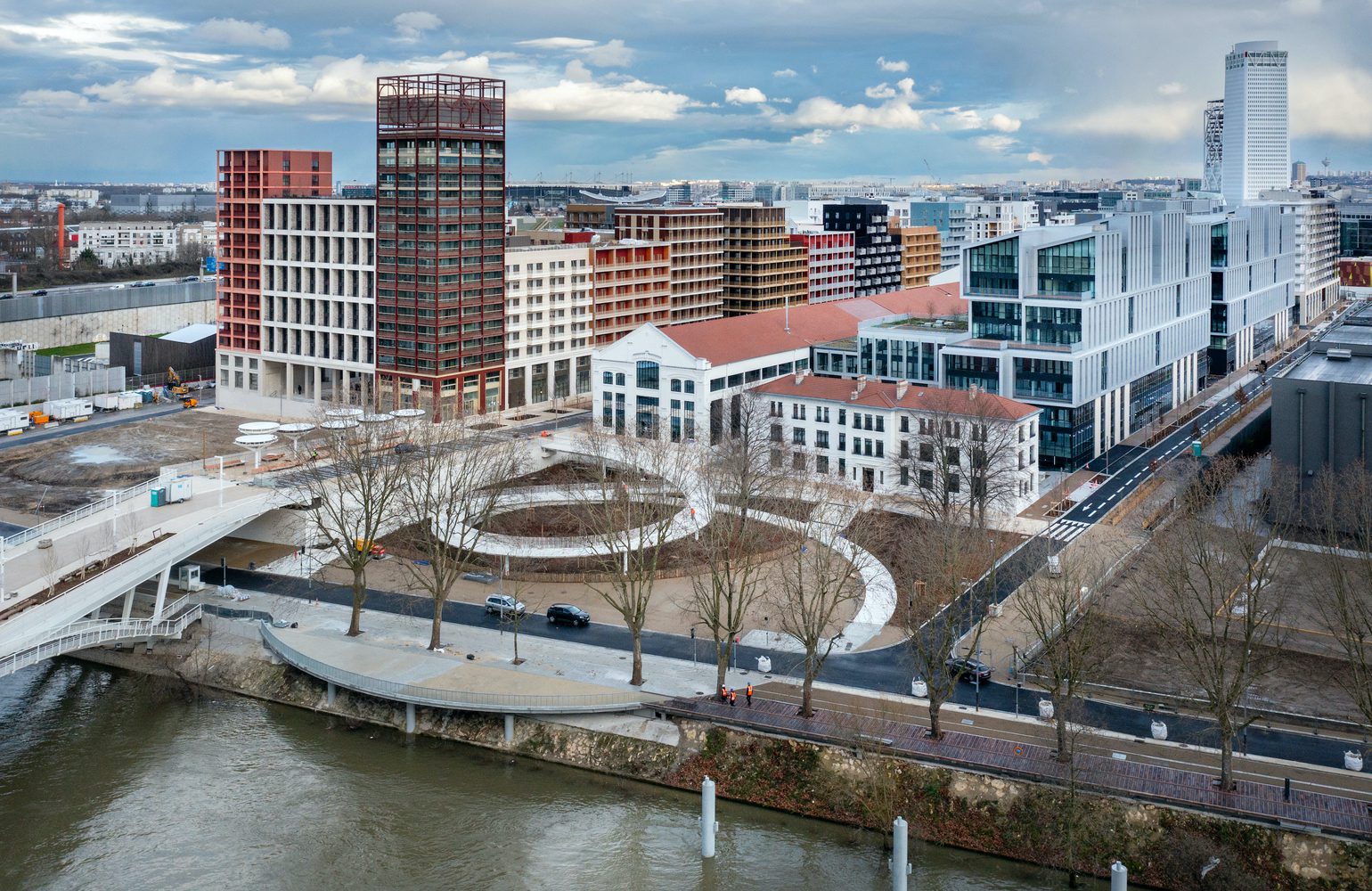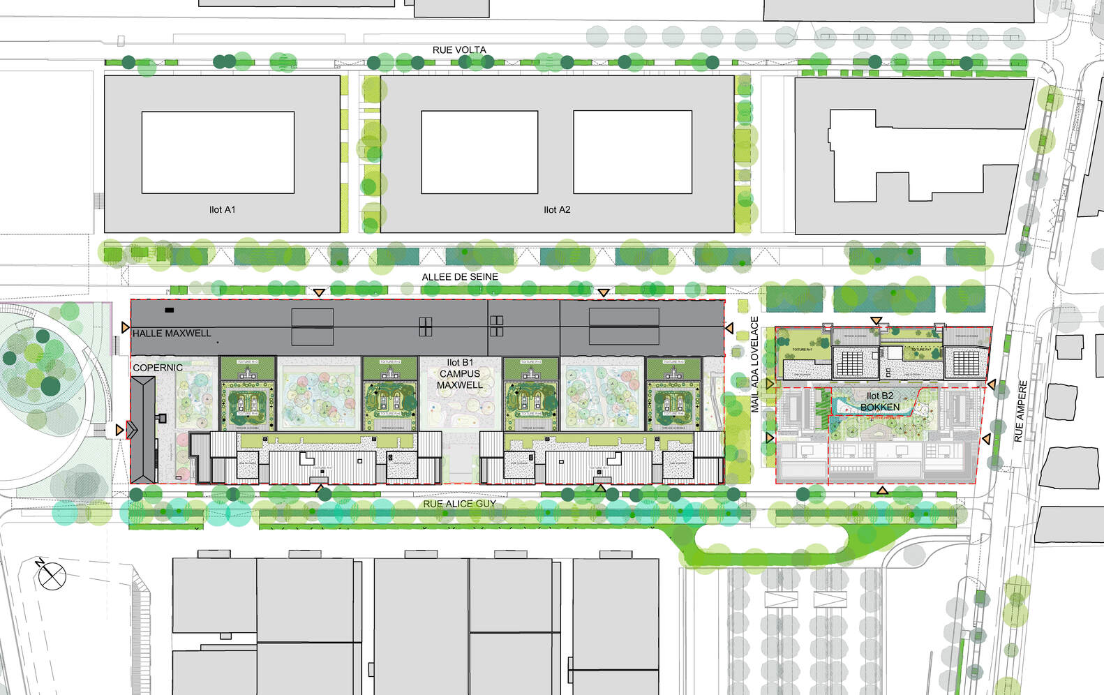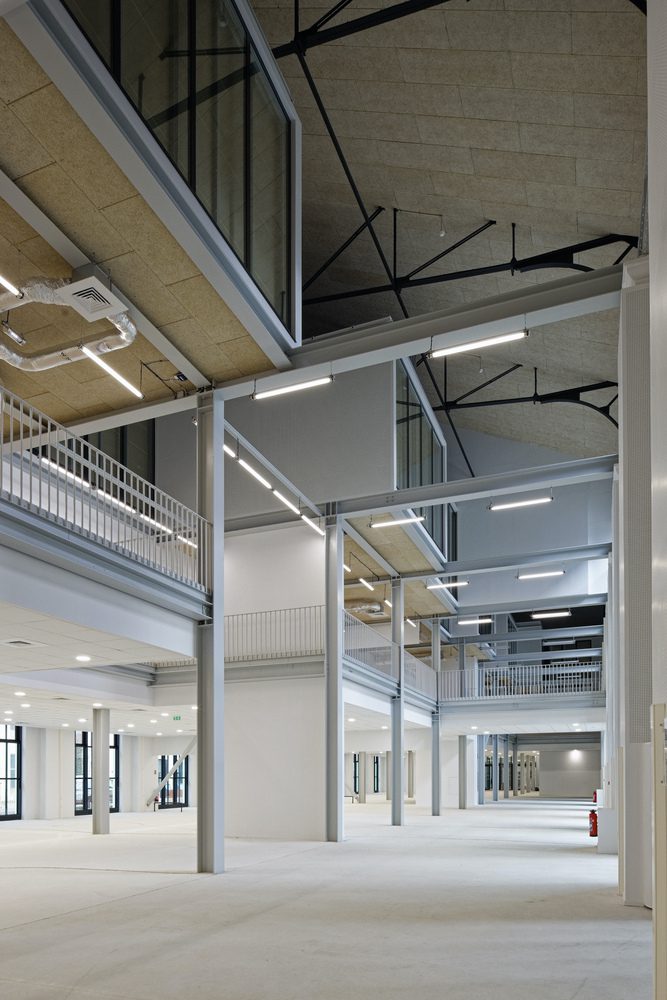 The Eco district is located in the northern district of Saint-Denis, on the banks of the Seine, in the heart of an urban fabric that includes several remarkable industrial buildings, including a former power station (Halle Maxwell), industrial architecture from the early 20th century, as well as its engineering building (Pavillon Copernic). Residential and large-scale commercial buildings have been naturally integrated into this fabric, giving the district a harmonious mix of uses. The program complements the current dynamics of the Saint-Denis plain, which is currently undergoing a major transformation. The campus is structured around the Maxwell Hall, along a strong east-west axis that forms the backbone of the site. The two existing buildings have been renovated to match their original dimensions and colors. Entrances were created for the new business. The existing architectural heritage is thus preserved at the heart of the new campus and is an integral part of it.