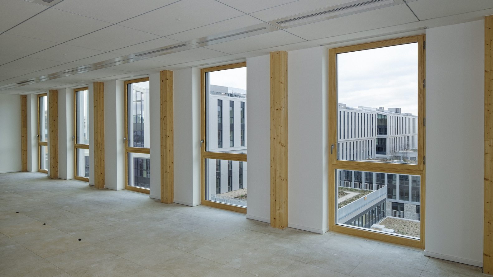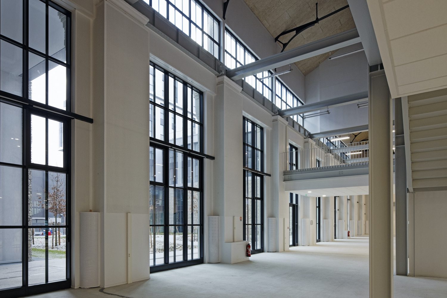 The campus is structured around them, along a strong east-west axis that forms the heart of the new site. A timber hybrid construction method was used for the new buildings. Many existing materials were reused on site (e.g. demolition concrete in the wire ballast boxes of the new plinth zone) or were taken from demolished buildings elsewhere and given a new life cycle (e.g. raised floors in the office areas). The CO2 footprint was already reduced by around 40% compared to similar projects during construction and will also result in significantly lower energy consumption during future use – first as an Olympic village and later as office space.