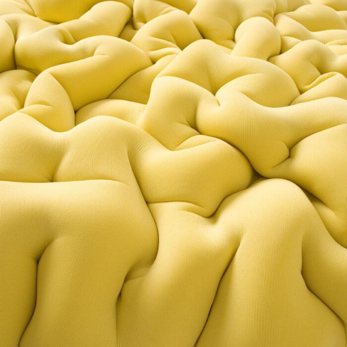 Designed by French designer Mattis Esnault, Ondule is a slip-covered chair that undulating waves of foam similar to brain casserole, according to the Mattis “the chair is an exploration of sound waves and frequency as well as the potential of the materials”. The chair is covered by a skinny yellowish layer of Kvadrat fabric, as it has been arose during a call for projects from the French design schools.
