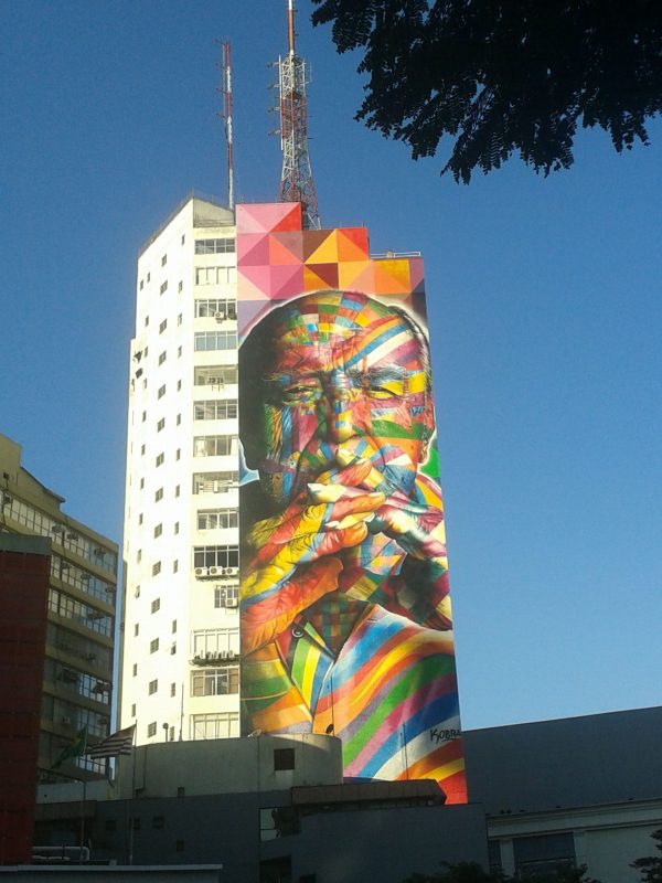 Oscar Niemeyer Street Art, Brazilian Street Artist Eduardo Kobra and four other painters have been working six hours a day since January 14thto complete a 52 meter high mural that honors architect Oscar Niemeyer who passed away in December just days before his 105th birthday. Covering the entire side of a skyscraper on Paulista Avenue in São Paulo’s financial district, the artwork is inspired by Niemeyer’s architecture, his love of concrete and Le Corbusier.