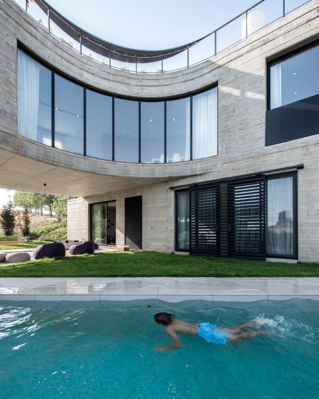 Out-to-Out House designed by L.E.FT Architects, Located in the snow resort of Faqra – Lebanon, the two-story concrete house hugs its triangular corner site through a gently curved geometry, to create different outdoor spaces of varied spatial and environmental qualities. The house is formed of a rectangular ground floor (5.5m X 20m) volume containing the bedrooms and a hovering curved first floor above it (5.5m X 24m) containing the living quarters.