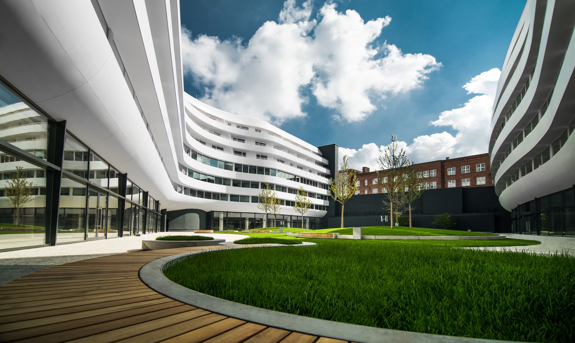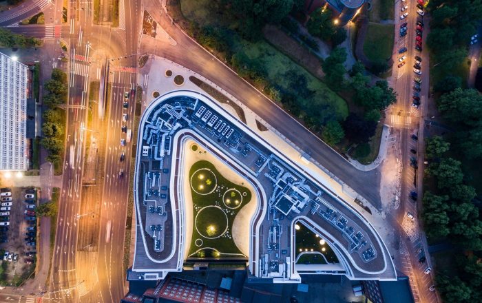 The amorphsc design that was envisioned requires alternative building techniques in order to be properly realized. After considering various options, Gottesman-Szmelcman Architecture chose to clad the building in Corian panels. According to Asaf Gottesman, the particular form of the building is a result of the traditional urban guidelines of the city of Wroclaw and the desire to envelop the diverse set of spatial requirements within a unified skin. Asaf Gottesman comments: “Designing the OVO was a group undertaking, a process of research that required several members of the practice to contribute from their accumulated experience, technical skills, and emotional intellectual sensibility. To varying degrees, OVO Wroclaw is a sculpture, an expression of culture and manifestation of optimism, a functional and efficient building, a social and cultural generator; a miniature city.” Within the OVO Wroclaw is a DoubleTree by Hilton, featuring 190 spacious and sophisticated rooms, a magnificent ballroom and state-of-the-art conference and meeting room facilities. OVO Wroclaw’s 5000-square-meter retail space is the city’s most sophisticated leisure piazzas with a massive inner-green courtyard that will host cultural events throughout the year. Gottesman-Szmelcman Architecture has created a unique and superbly designed environment that holistically integrates living, culture, business, and commerce in the heart of the metropolis. The truly stunning architectural form has already made the building a landmark in the city’s skinned and visual repertoire.