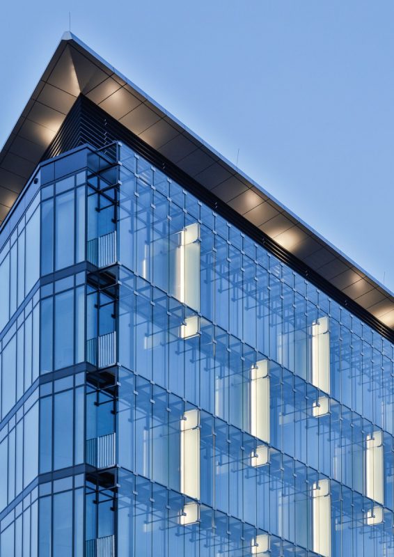 The outline of the building has been dictated by the road layout on the South and the Westside, while both remaining elevations have been located in a way that allowed to simplify the building’s shape. As a result of this combination, a building with a rhomboid base has been born. The untypical outline of the building required a provision of an unusual structural grid, which in that case follows a triangular modulation, with an independent structural grid for the underground part of the building (housing a car park). Whole project follows Breeam recommendations. Advanced technologies have been employed in order to provide the highest level of building’s quality (including structural elements and finishes), quality of office environment, energy efficiency, sustainable performance, building’s accessibility, as well as, building’s management and maintenance during the construction stage as well as operation phase. A great effort has been put into designing of all four elevations of the Pacific building. In order to prevent the accumulation of heat the East, South, and West elevations have been designed using a double curtain wall system with openings on the bottom and on the top of the façade – a combination that allows for natural circulation of the air in summer and limits the heat loss during the winter period. Technical bridges have been located between both curtain walls layers.