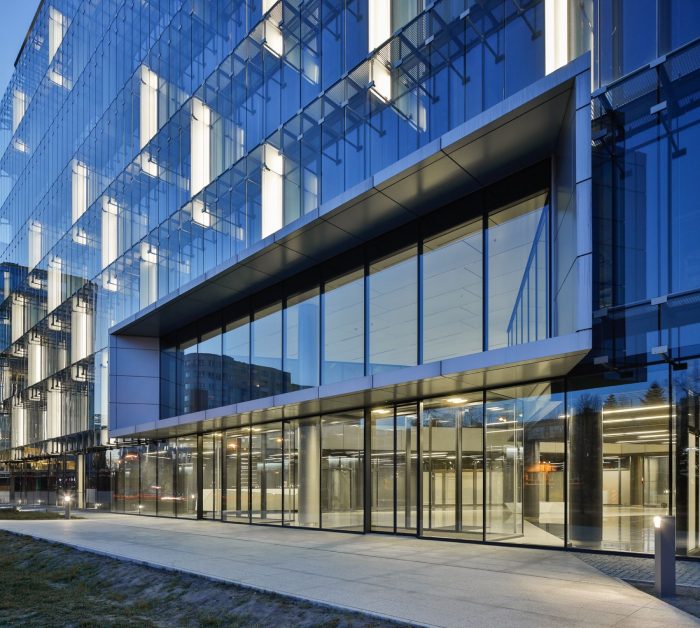 Proposed building’s envelope solution enabled an esthetically coherent image of external all-glazed elevations in symbiosis with the building’s physics. Additionally, the possibility to open the windows from inside of the office space allows for a higher level of environmental comfort of the office space, which is extremely transparent but not fully enclosed. The North elevation which is similarly fully glazed is turned into the proximate greenery and Warsaw’s cityscape. Elevations have been equipped with additional decorative illumination in order to highlight the depth of the facade, which results in a very attractive look, especially just after the sunset. The extensive view can be enjoyed as well from the building’s top terrace, which is accessible from both staircases equipped with glazed canopies at the last level. The accessible, open part of the terrace is intended to be a cozy, relaxing space, for this reason, it has been separated from the busy Domaniewska Street and from the technical part of the terrace by horizontal louvers. A smaller landscaped terrace has been located at the first-floor level.