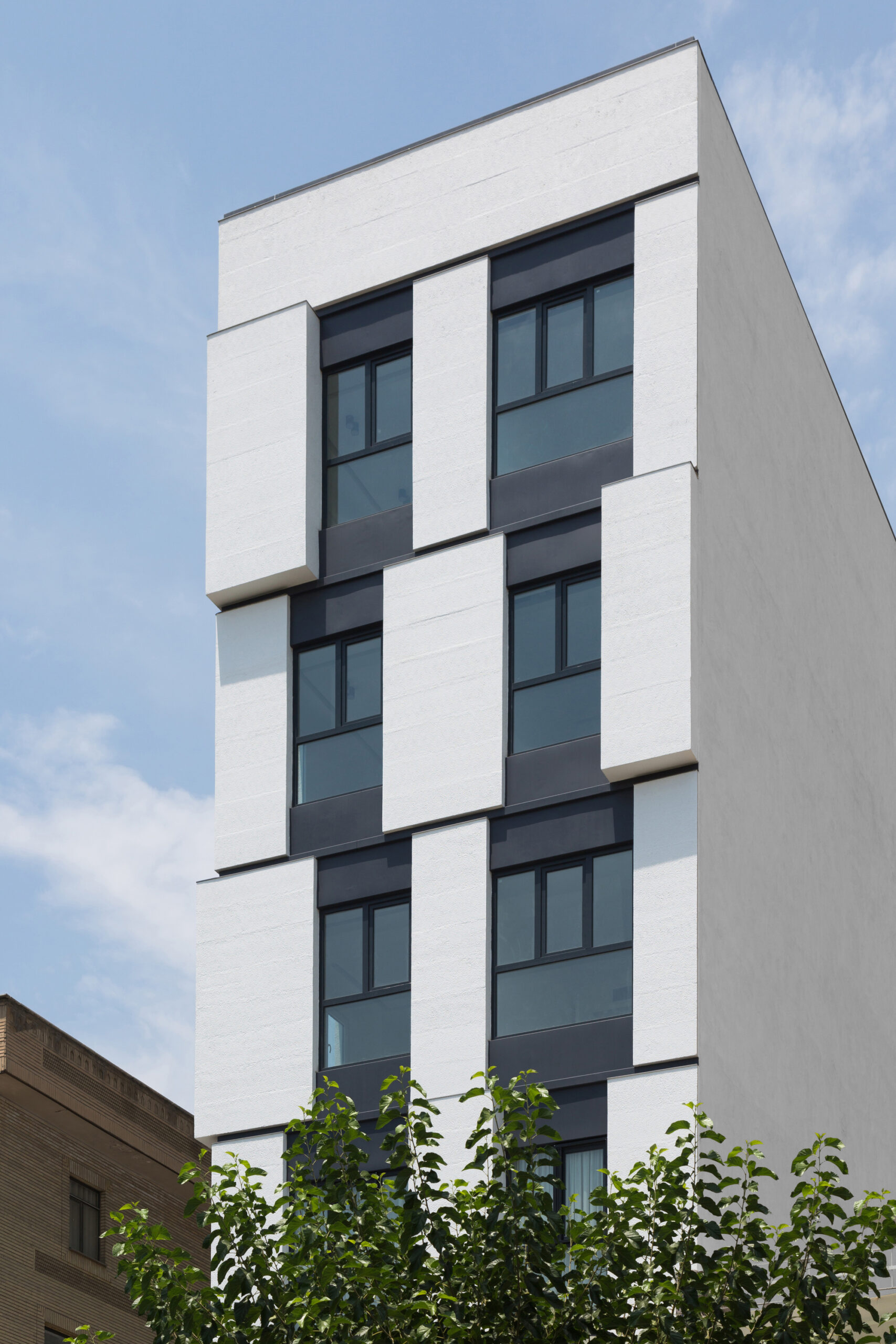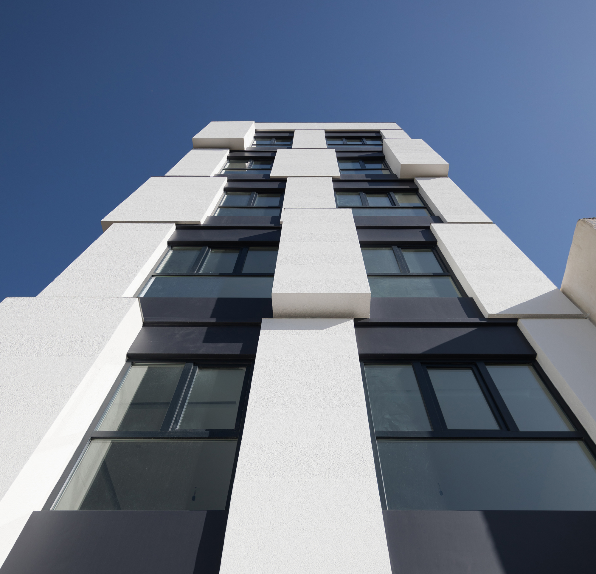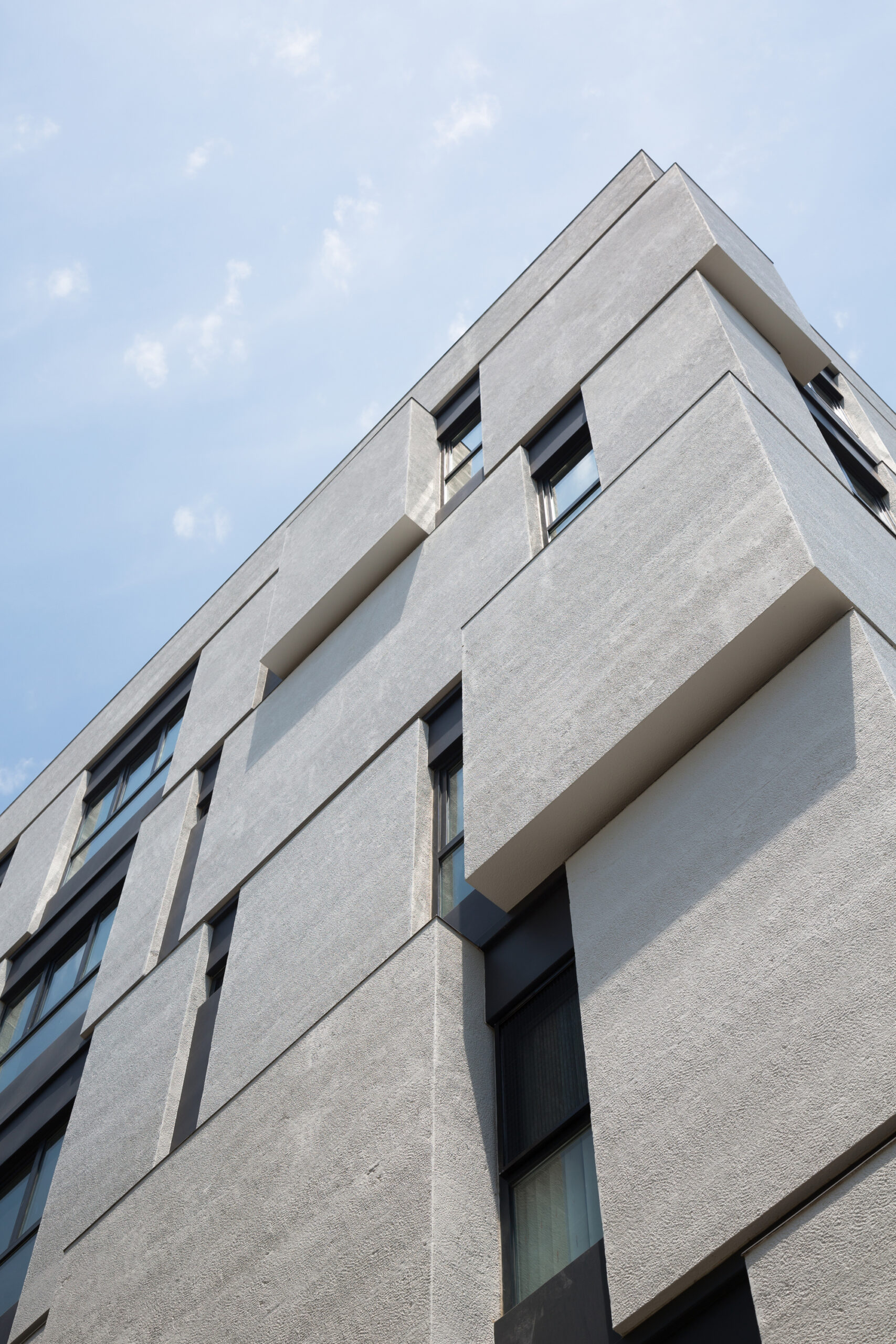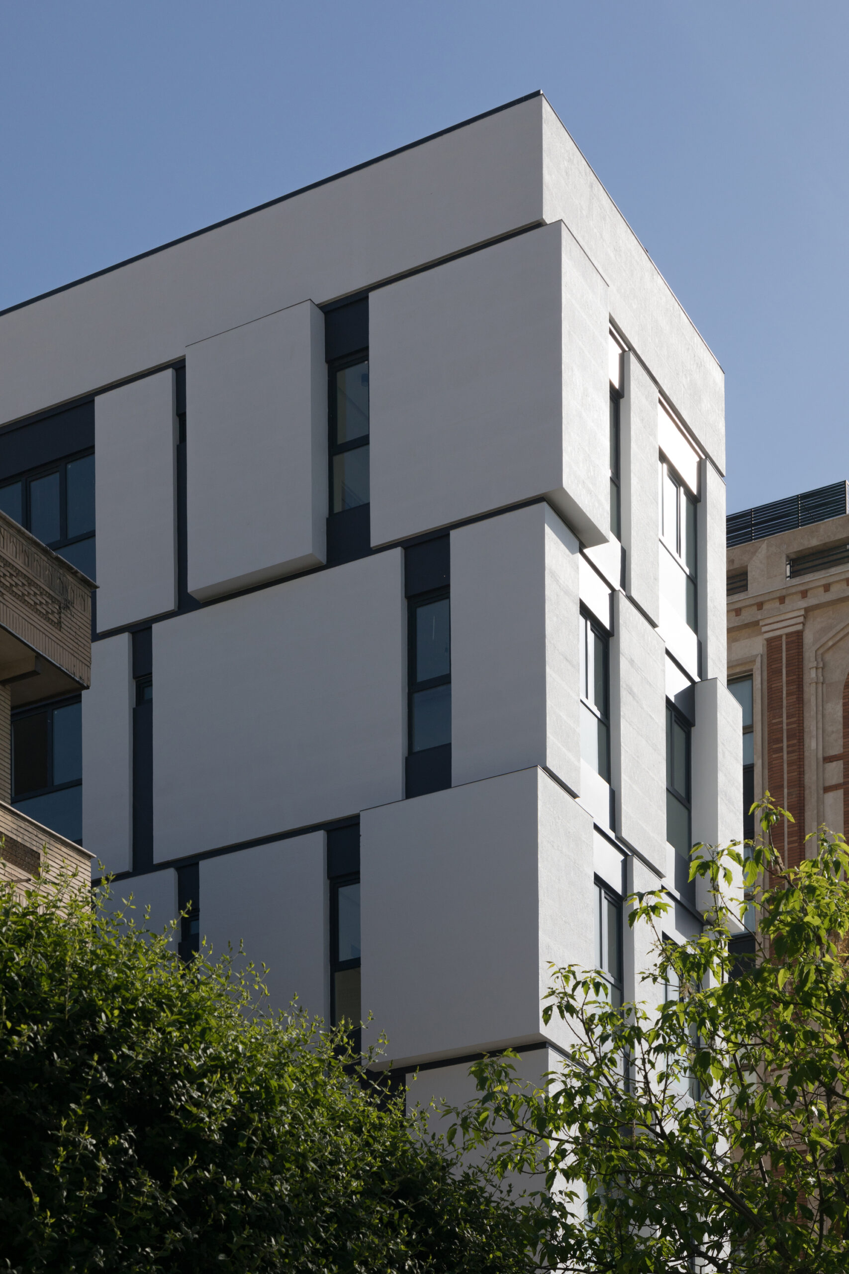 The white and light color of the facade cubes in the dark background expanded and enlarged the facade. Also, the different thickness of these cubes intensifies this difference, which can give a better vision to the flat surface. Another design solution is the form extension form of the smaller side to the larger one. It results in a confusion about the main facade ‘s borders, and made it seems larger and more prominent. Due to the fact that there are two sides for this building, it was necessary to create a chamfer in the corner of the building according to the regulations, and in order to fit the other forms, the wall chamfer is solved with fractures that distinguish it from its common counterparts.