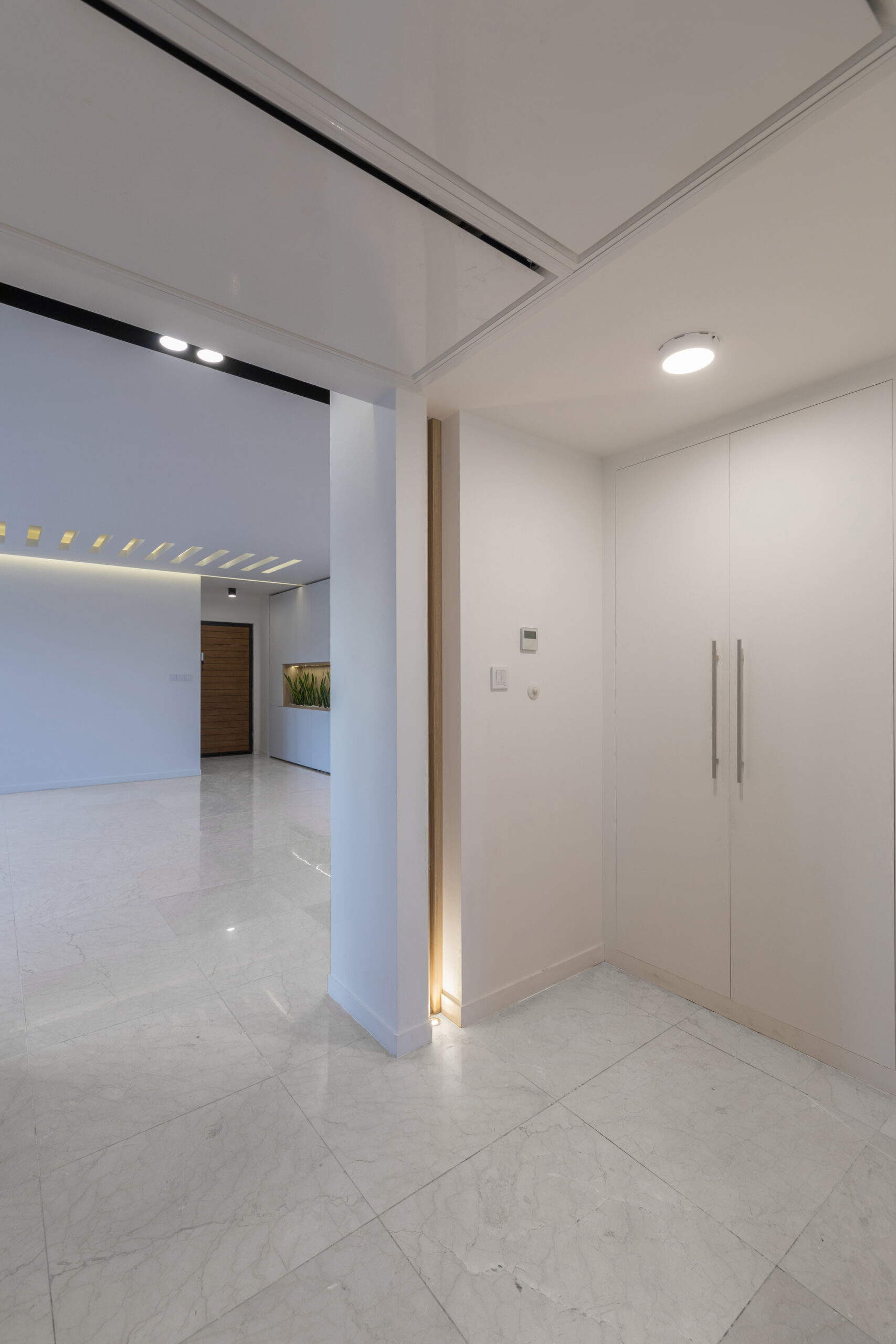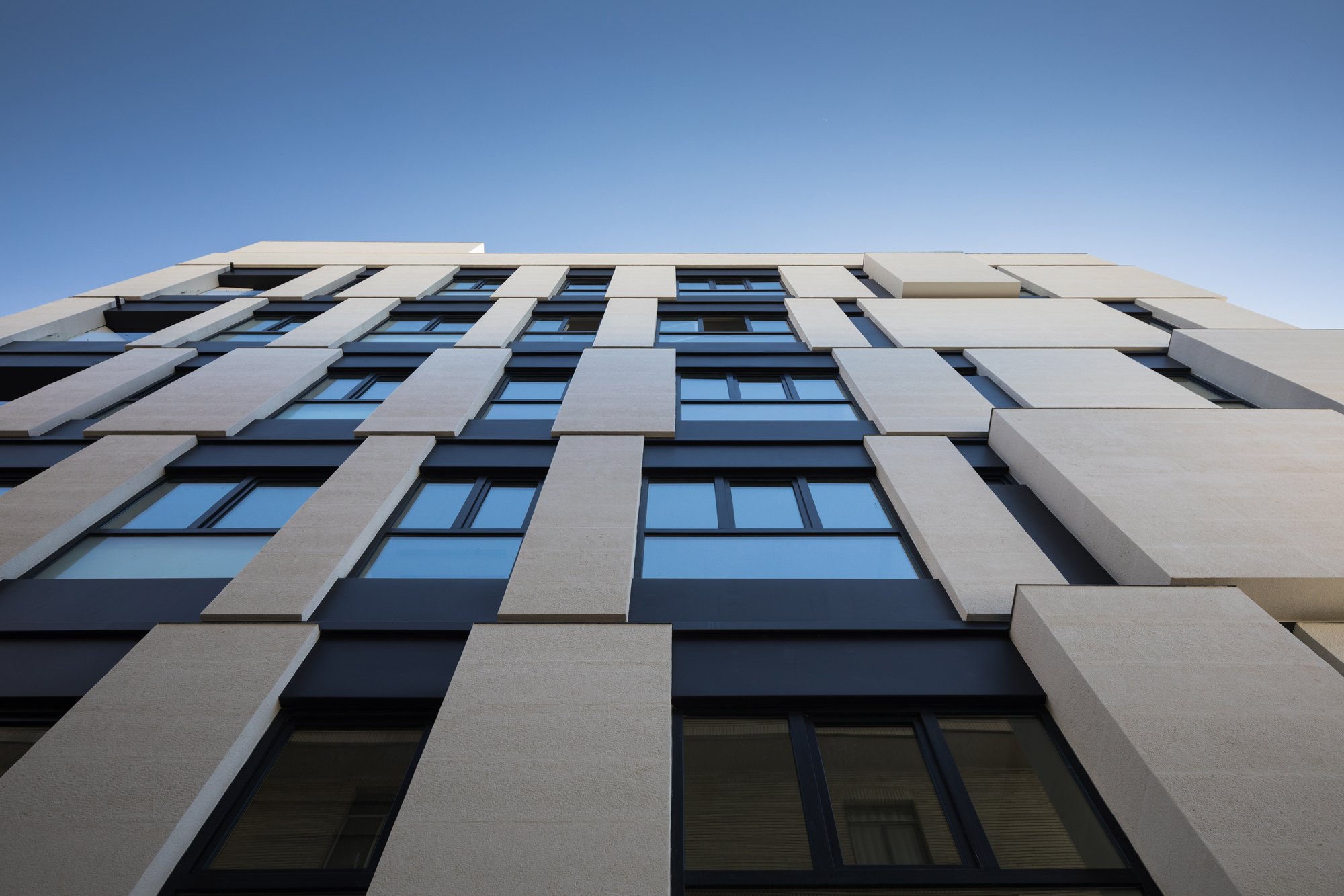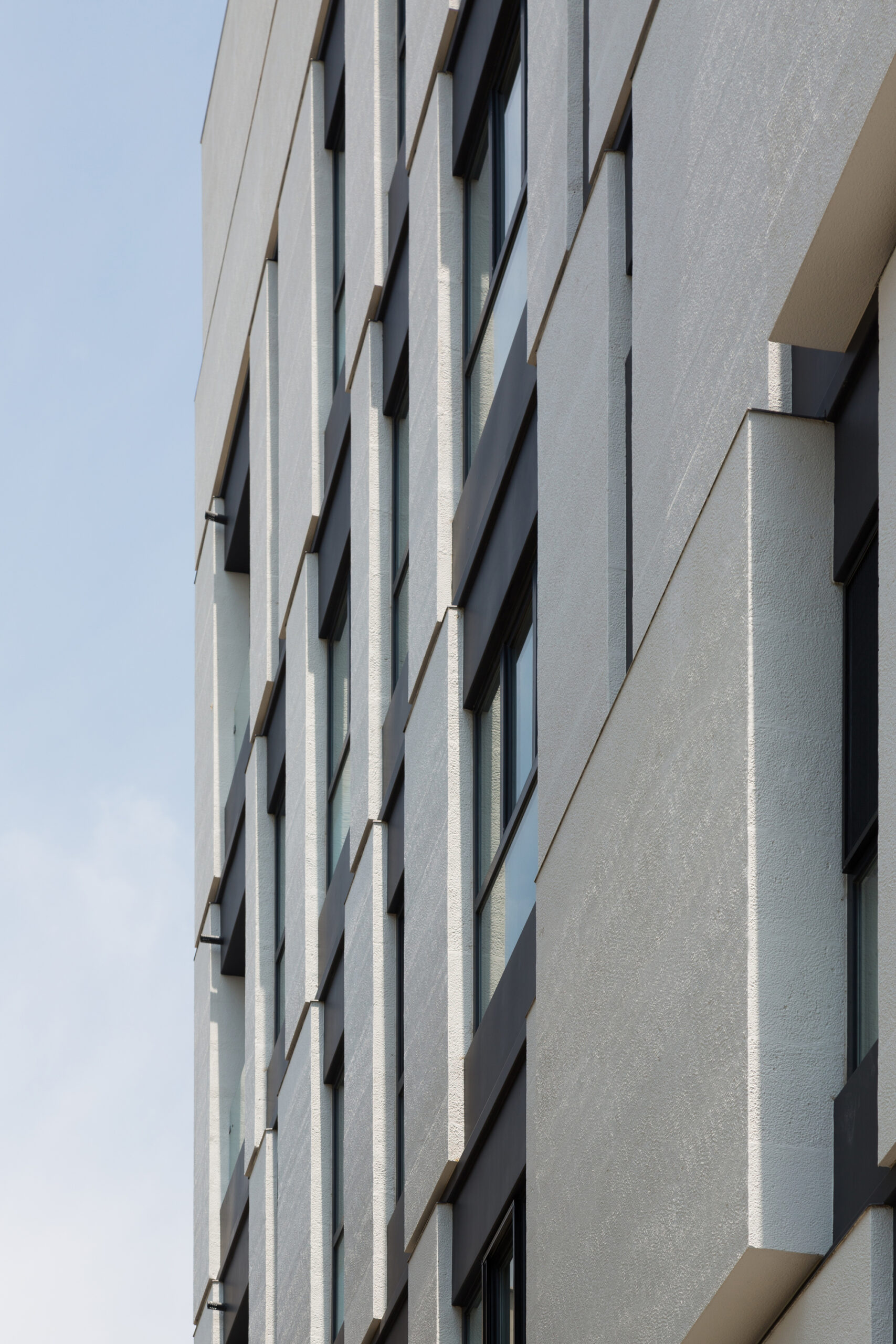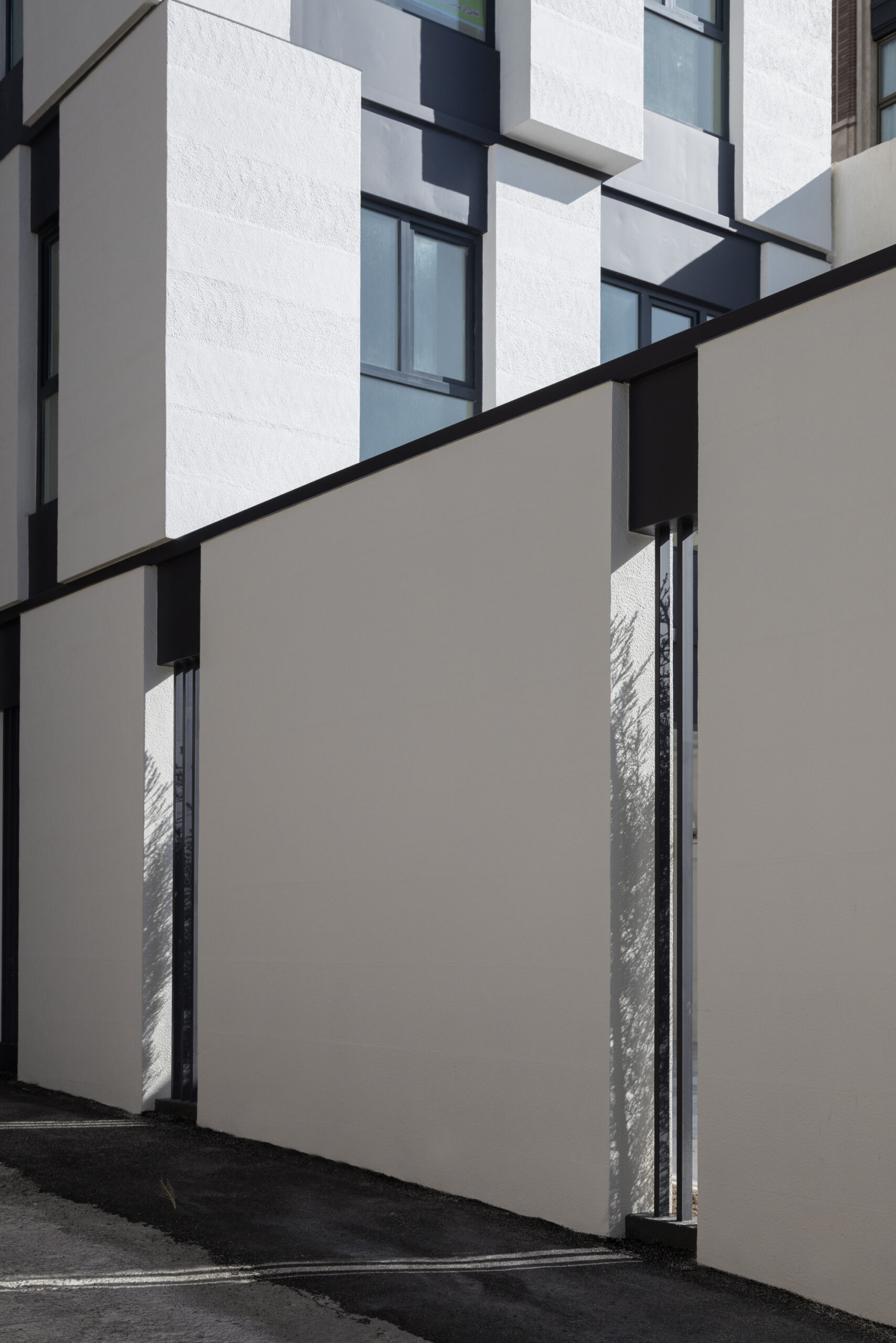The white and light color of the facade cubes in the dark background expanded and enlarged the facade. Also, the different thickness of these cubes intensifies this difference, which can give a better vision to the flat surface. Another design solution is the form extension form of the smaller side to the larger one. It results in a confusion about the main facade ‘s borders, and made it seems larger and more prominent. Due to the fact that there are two sides for this building, it was necessary to create a chamfer in the corner of the building according to the regulations, and in order to fit the other forms, the wall chamfer is solved with fractures that distinguish it from its common counterparts.