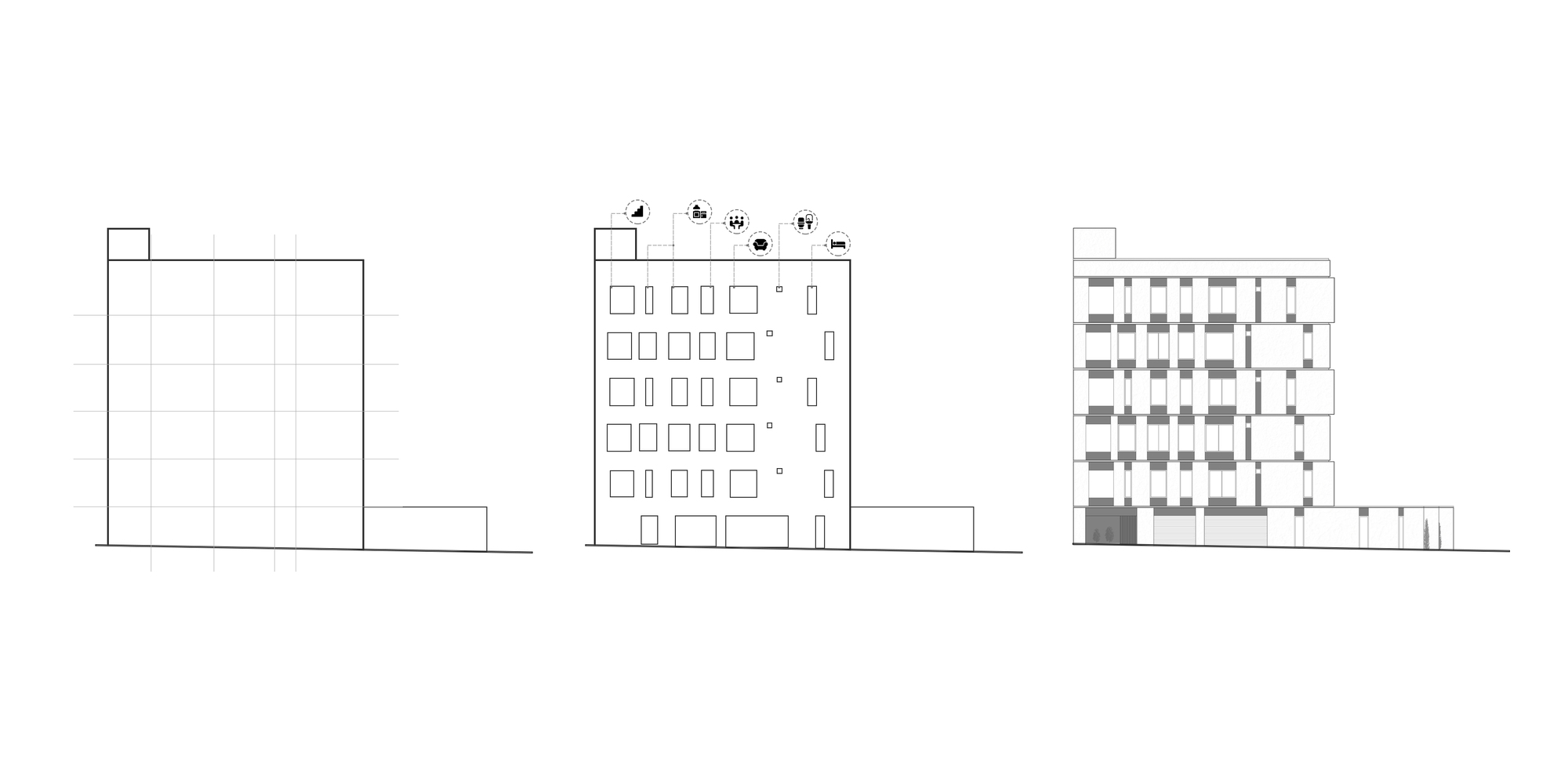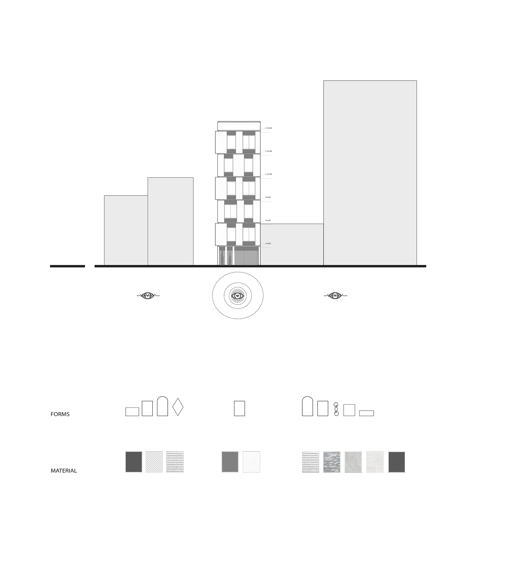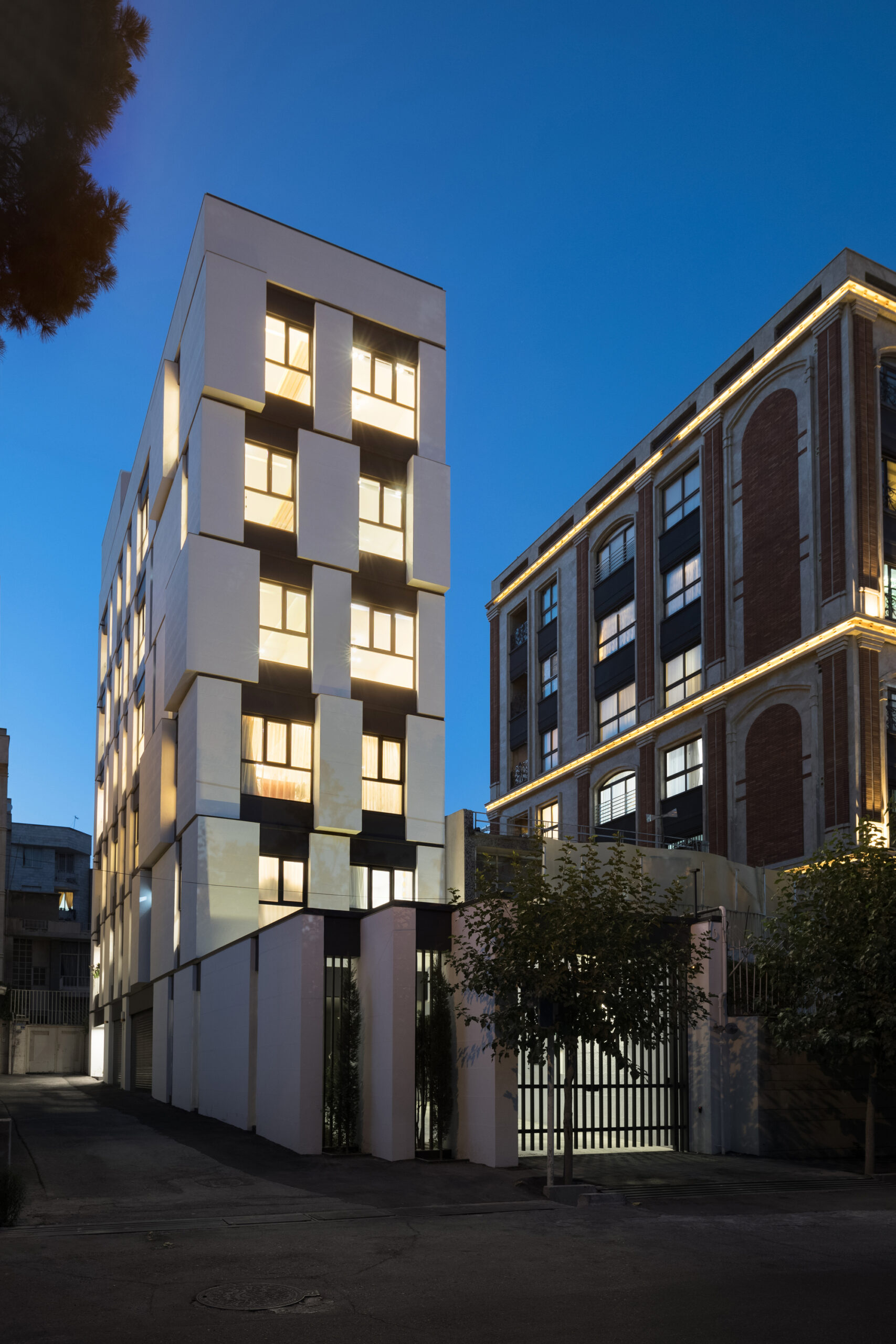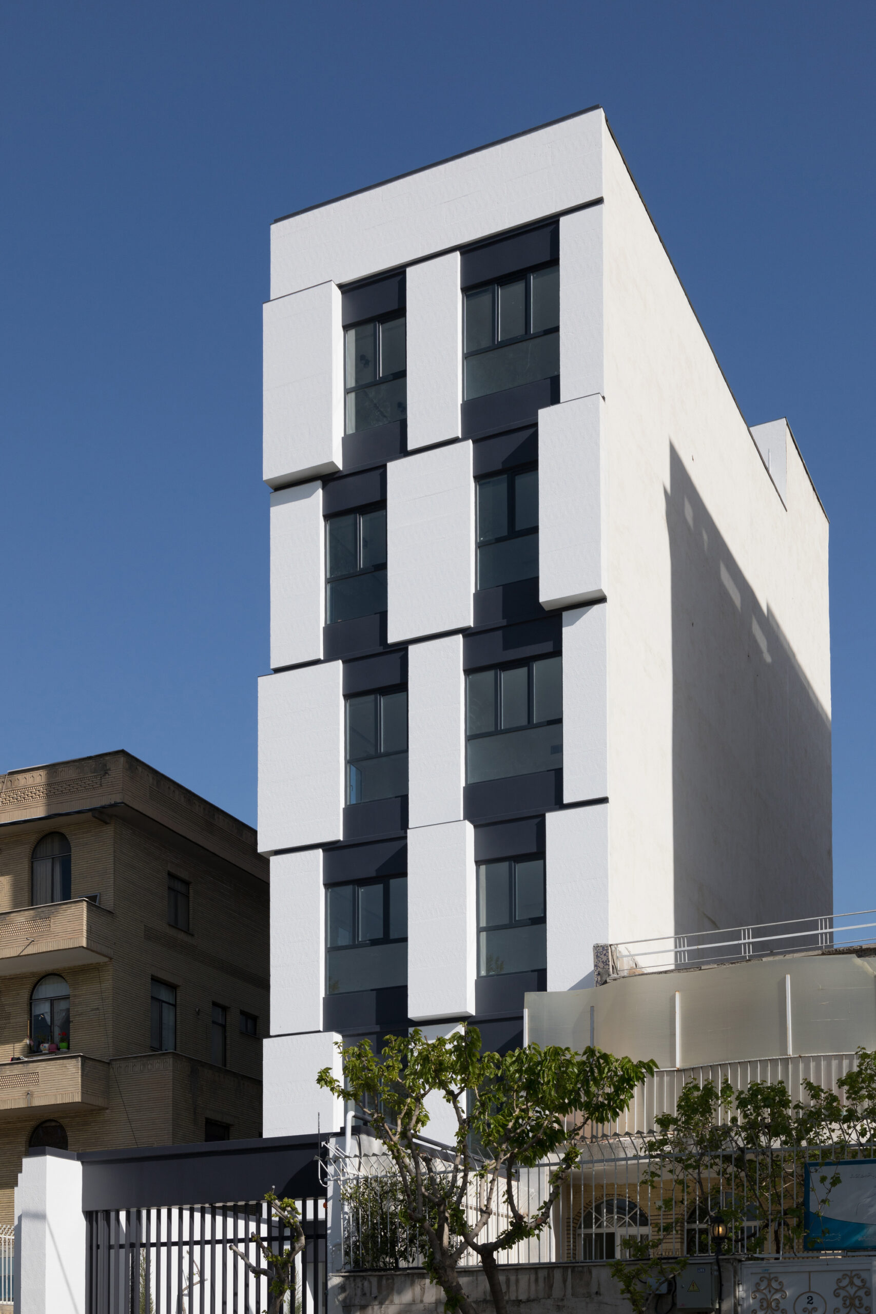 In this neighborhood, due to being worn-out and the lack of attention to proper design for buildings, passages, etc., it has become an undesirable place that prevents people from living in it. The view of the building that is facing the main passage, plays the main role in attracting the eyes of passers-by; This side, has a smaller width. Therefore, we designed the facade by breaking its main elements into smaller separated parts with different dimensions, which reduces the visual impact of the main façade ‘s narrow width. The facade became a clear representation of the strong geometry of the cubes that were used as the basic design elements.