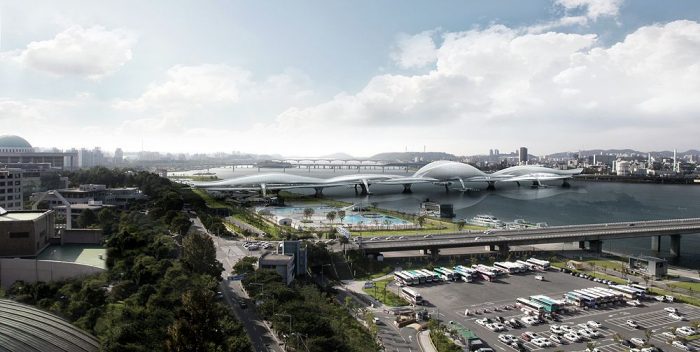 Well, the Seoul-based firm, Planning Korea, suggests that there is more to be had. Their proposal for the .67 mile long Paik Nam June Media Bridge in Seoul is more than mere structure, in fact it surpasses superstructure and moves on to megastructure. The bridges swelling and undulating form will indeed be host to the conventional bridge program, but in addition, it will contain a park, meeting spaces, a mall, a museum and more. Solar panels are to cover to bridge’s exterior, generating power for the bridge’s many services.