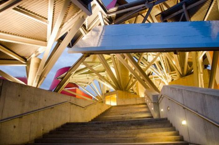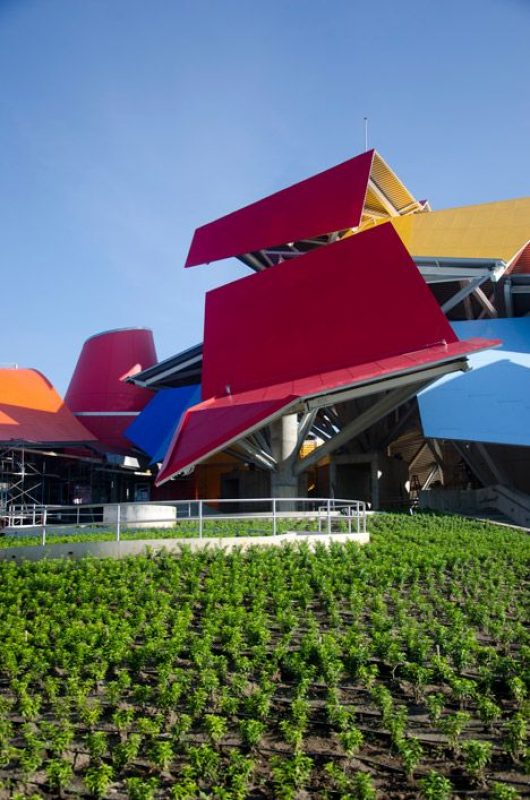 The museum hovers above a plaza, and features an open-air patio bathed in natural light mediating the entrance to the interior of the building. Natural light and ventilation represent a few of the many ways in which sustainability permeates the project. Environmental concerns are also present in the way coconut fibers are used in the building’s reinforced concrete, and in the way the plaza’s plants act as cleaning agents for the surrounding wetlands. Inside the museum, exhibition and circulation spaces are sweeping and continuous, allowing for extreme flexibility and cohesive transitions.