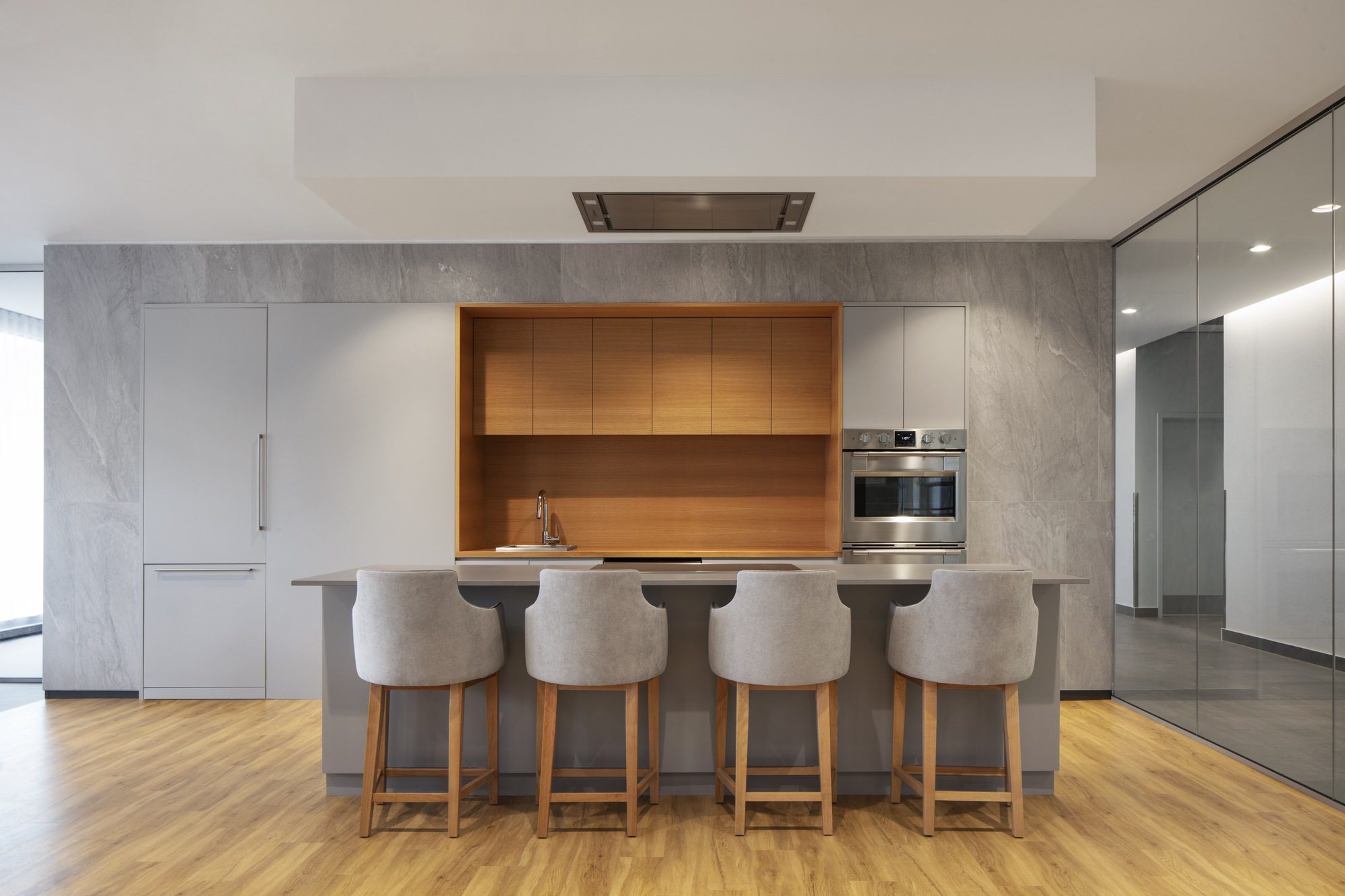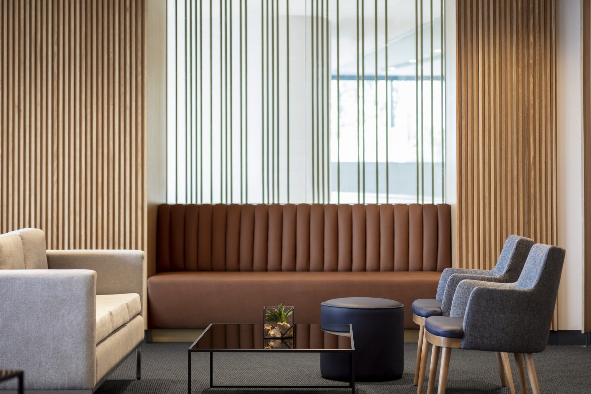 Rich materials and floor-to-ceiling windows add contemporary touches within the podium, while soft fabrics and carefully selected furnishings address the needs and well-being of the building’s residents. As opposed to Panorama’s exterior focus on contrasts, the tower’s interior was organized and designed around the concept of seamless flow and creating connections between the building’s tenants to encourage a break away from solitude. Accessible and unpretentious, its rounded corners and soft fluidity provide stark architectural contrasts to the tower’s sharp, rectangular appearance. A horizontal, double-height atrium serves as the podium’s gateway, where a theme of natural elements pays homage to the surrounding landscape. Natural wood flows from the ceiling into the walls, while organic shapes, two-tone stones, gradient carpeting, and blue velvet drapes harmonize with the adjacent river and shoreline.